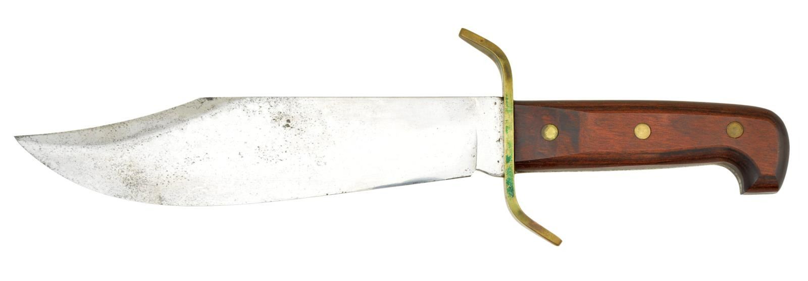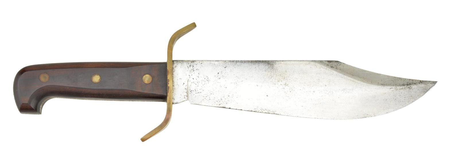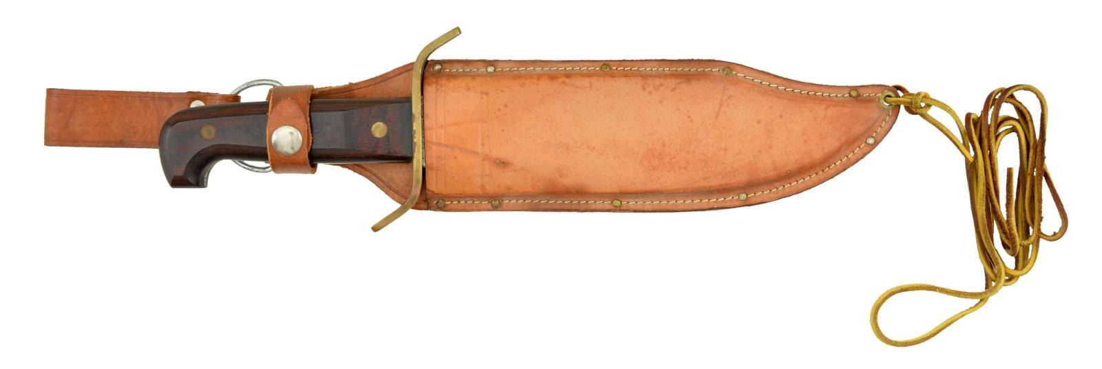 Overall: 14 3/4". Bowie 9 1/2" blade. Brass dbl. guard stamped "WESTERN USA" & "W49". Full tang w/ wooden scales & brass pins. Includes brown leather belt sheath. CONDITION: knife in good overall condition w/ peppery patina on blade, patina & verdigris on guard & patina on tang. Good holster w/ light scuffs. (02-19532/MD). $100-150.