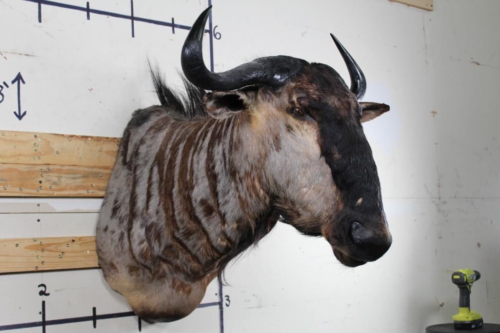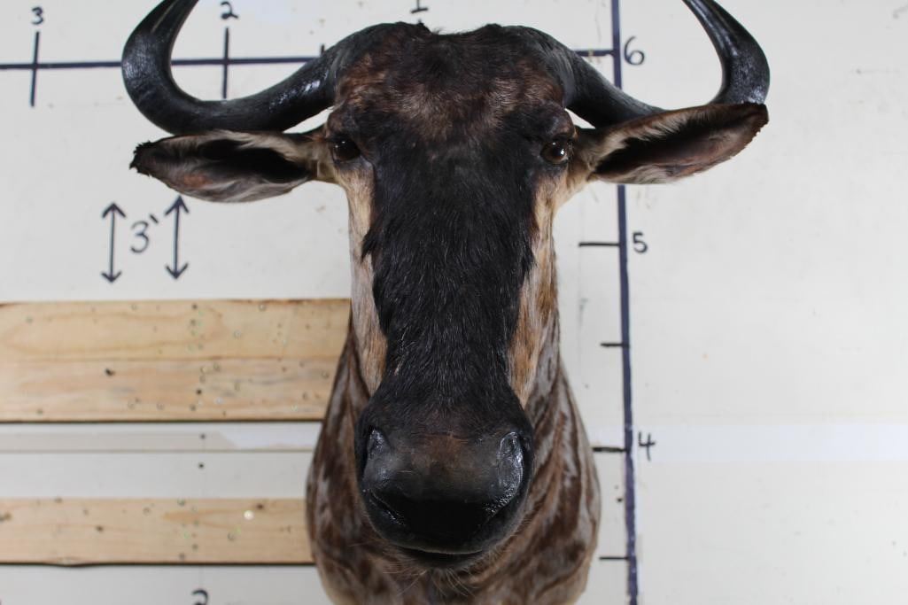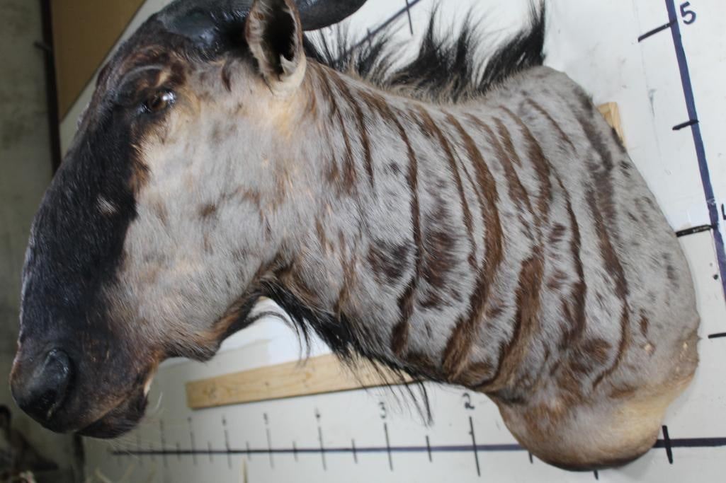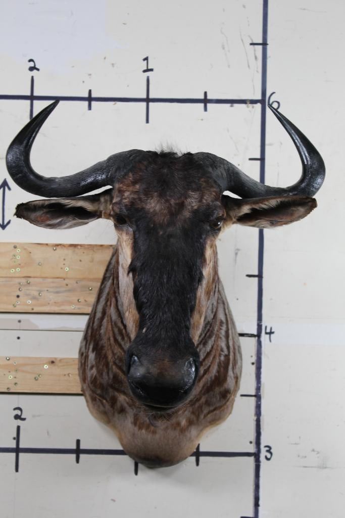 WILDEBEEST Shoulder Mount in Good Condition. Horn Tip to tip measures approx. 49". The Right Boss measures 12.5" around and the Left Boss measures 12 3/8" around. TAXIDERMY