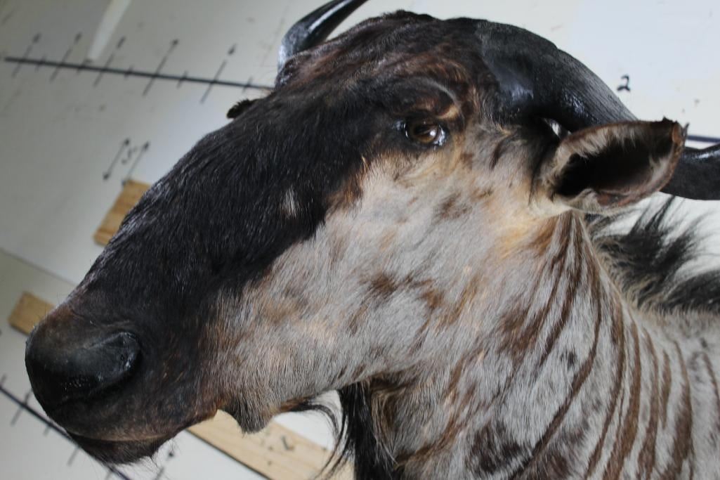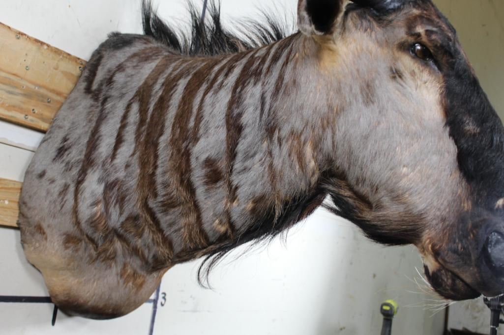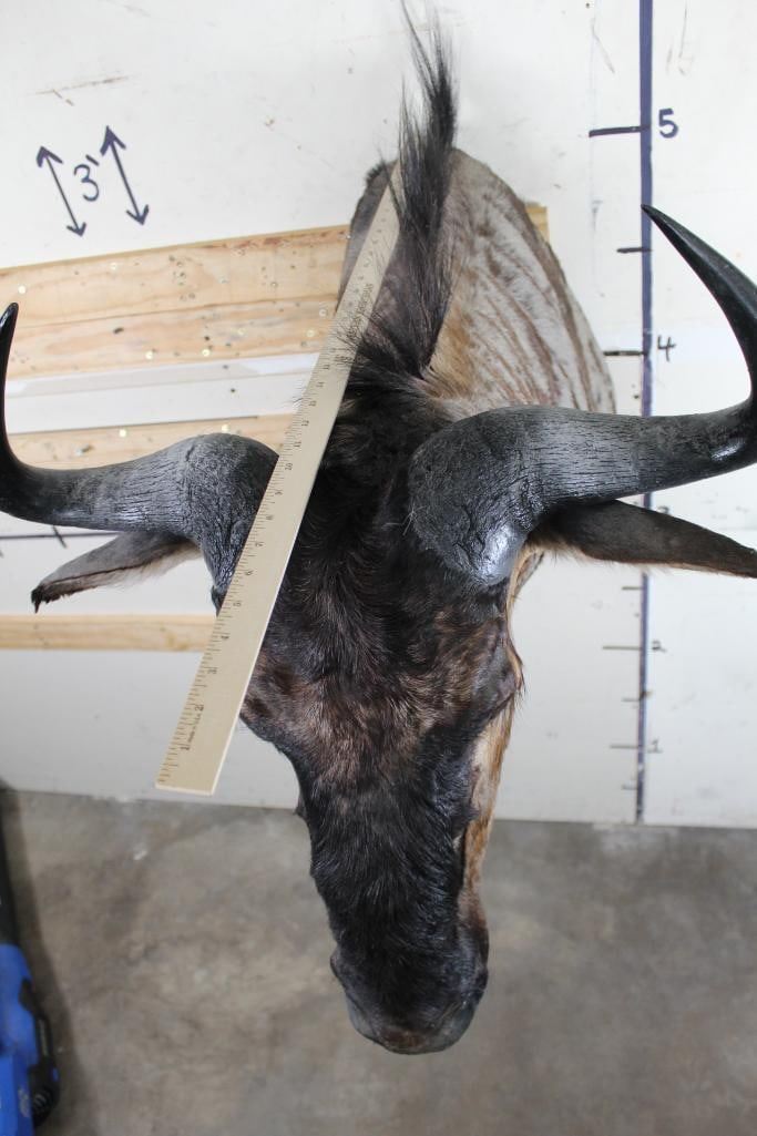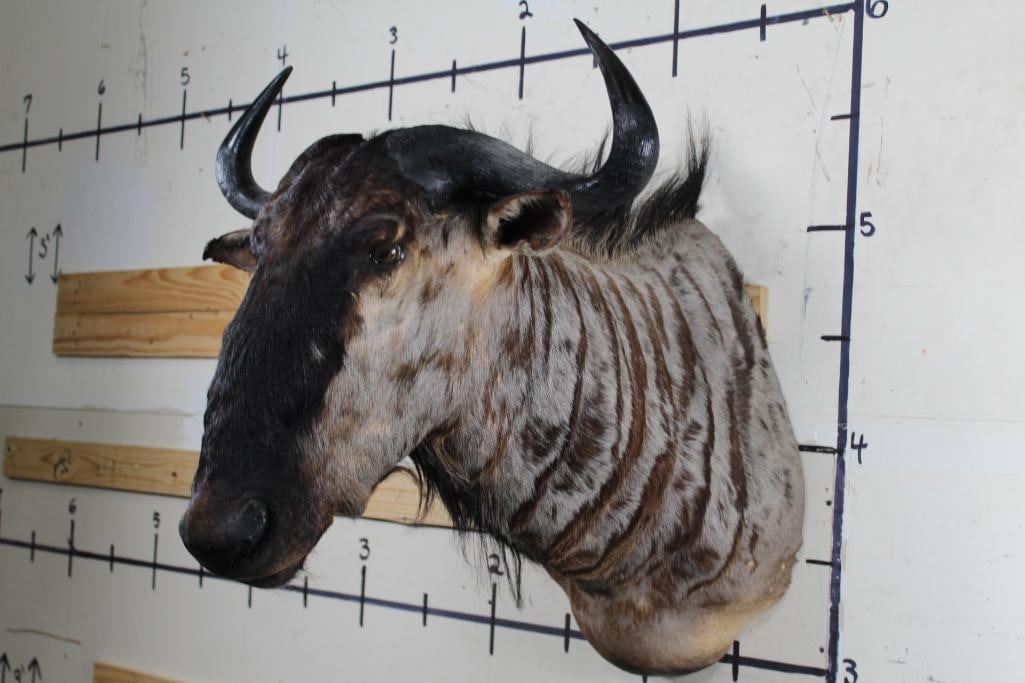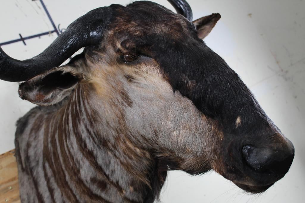 WILDEBEEST Shoulder Mount in Good Condition. Horn Tip to tip measures approx. 49". The Right Boss measures 12.5" around and the Left Boss measures 12 3/8" around. TAXIDERMY