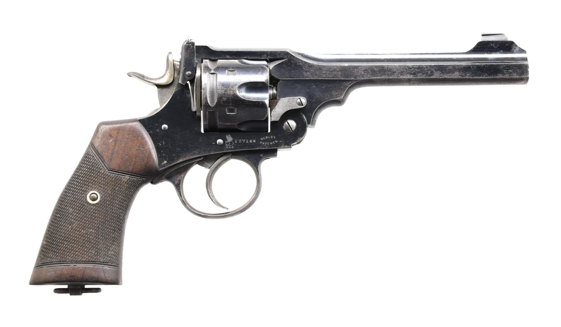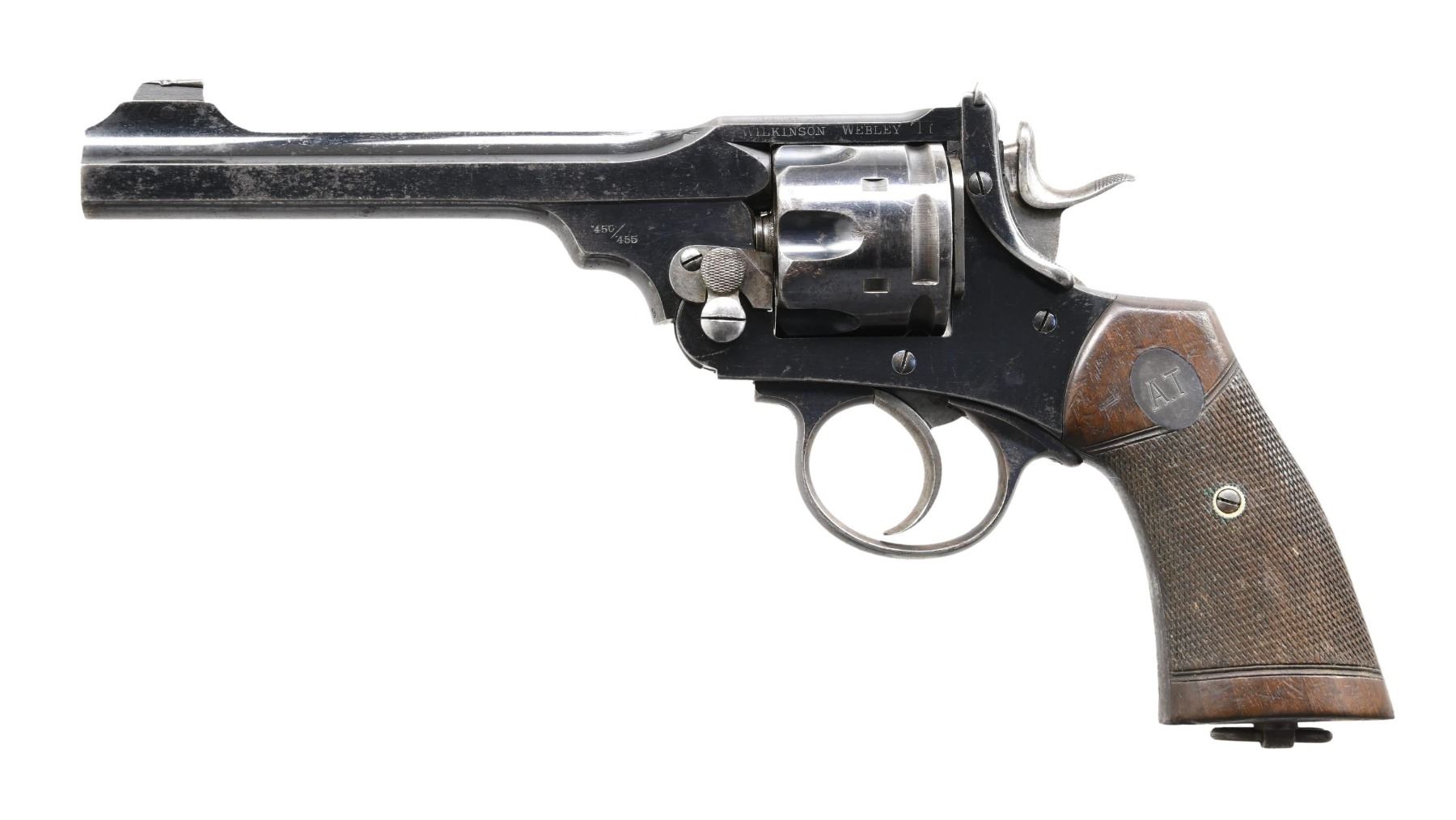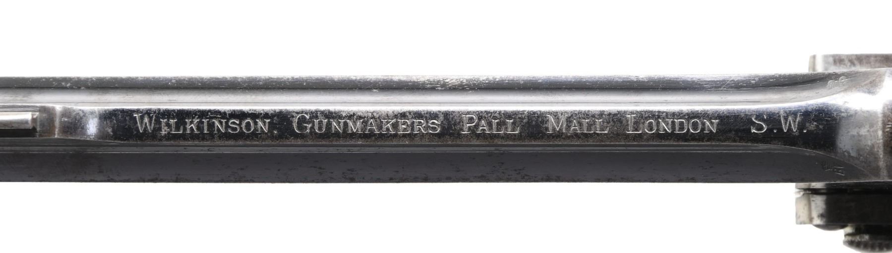 REVOLVER. Cal. 450/455. S# 127168. Bbl. 6". Model 1905 double action revolver mfg. by Webley for Wilkinson. The top of the solid bbl. rib is marked "WILKINSON. GUNMAKERS PALL MALL LONDON S.W." with "WILKINSON WEBLEY II" marked on the left side of the top strap. Right side of the frame is marked with Webley's winged bullet above the "W&S" logo, followed by the S# and "WEBLEY/ PATENTS". Factory S# "127168" is marked on the left side of the frame beneath the grip panel, with Wilkinson's S# "3111" marked on the underside of the trigger guard. Frame, cyl., and bbl. exhibit a lustrous high polish blue finish, with some smaller components being polished in-the-white. Frame is mounted with 2-piece checkered wood grips. Left grip panel is inlaid with an oval silver escutcheon, which is engraved "A.T". Blade front sight, with U-notch rear sight. All serialized components are matching and include the frame, cyl., bbl., as well as the grips. CONDITION: major metal components retain large amounts of their period blue finish, exhibiting areas of wear that show through to gray patina, scattered superficial handling marks, as well as scattered spots with varying degrees of oxidation overall. Grip straps retain traces of their original finish, exhibiting a gray patina and heavy oxidation overall, with oxidation and pitting also being present beneath the grip panels. In-the-white components show areas of age-related discoloration overall. Bright bore, exhibiting scattered spots of oxidation and strong rifling throughout. Grips show scattered superficial handling marks and a few minor impressions, but otherwise remain sturdy and serviceable. (24-4099/MLW). CURIO. $800-1,400.