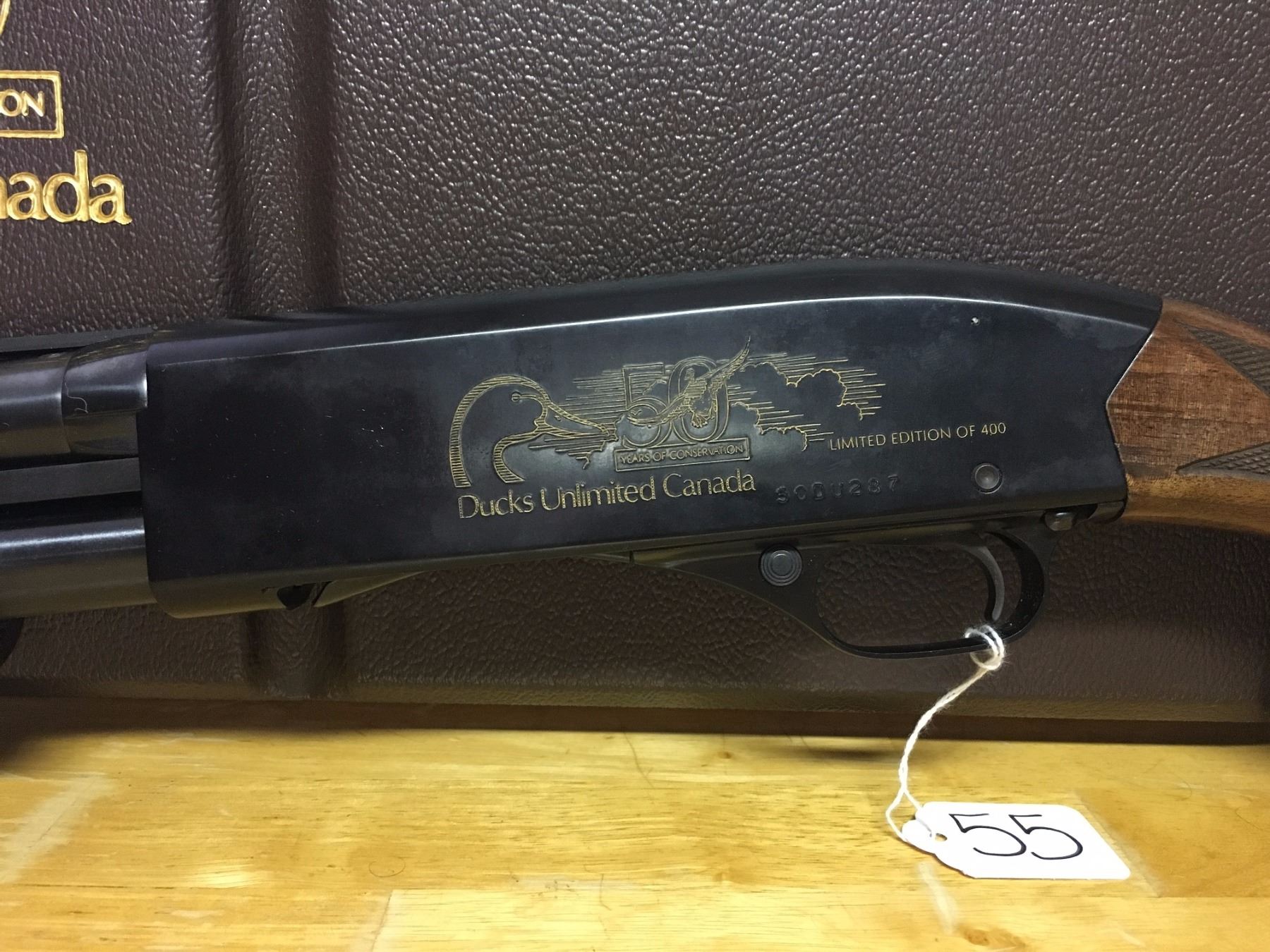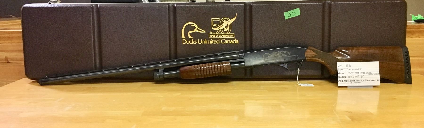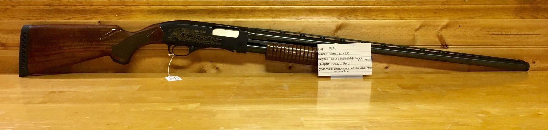 LOT: 55 MAKE: WINCHESTER MODEL: 1300, 1938-1988 DUCKS UNLIMITED CALIBER: 12GA, 2 3/4 - 3" CONDITION: VG, W/ 2X CHOKE, W/ ORIG HARD CASE S/N: 50DU287