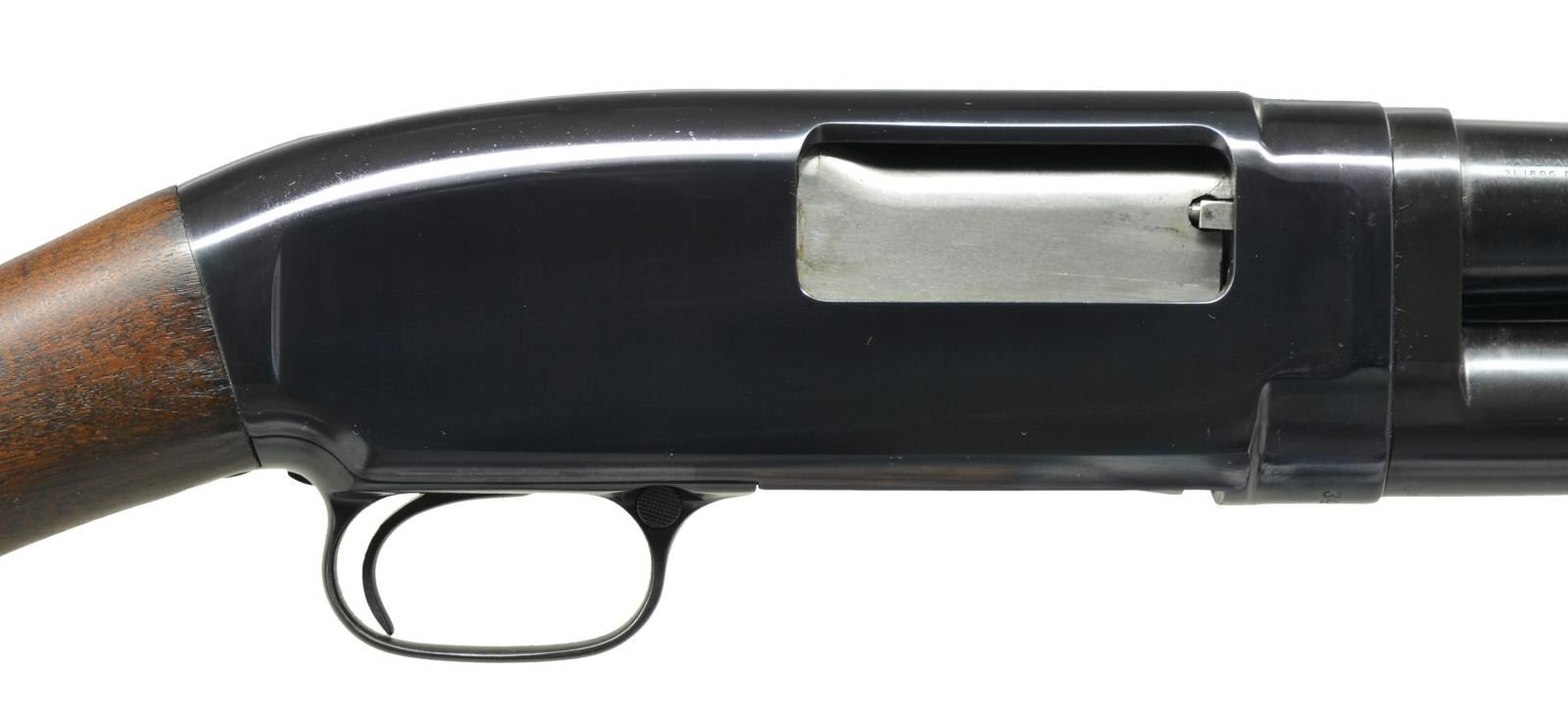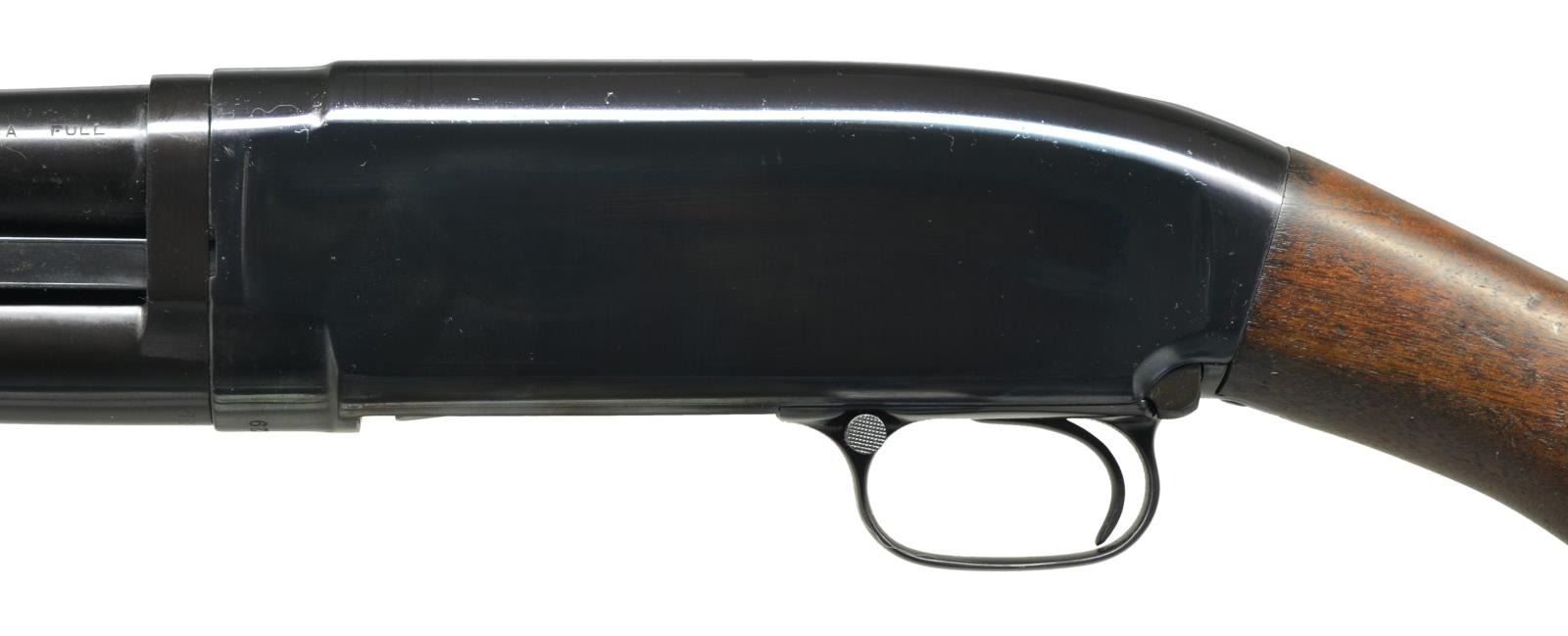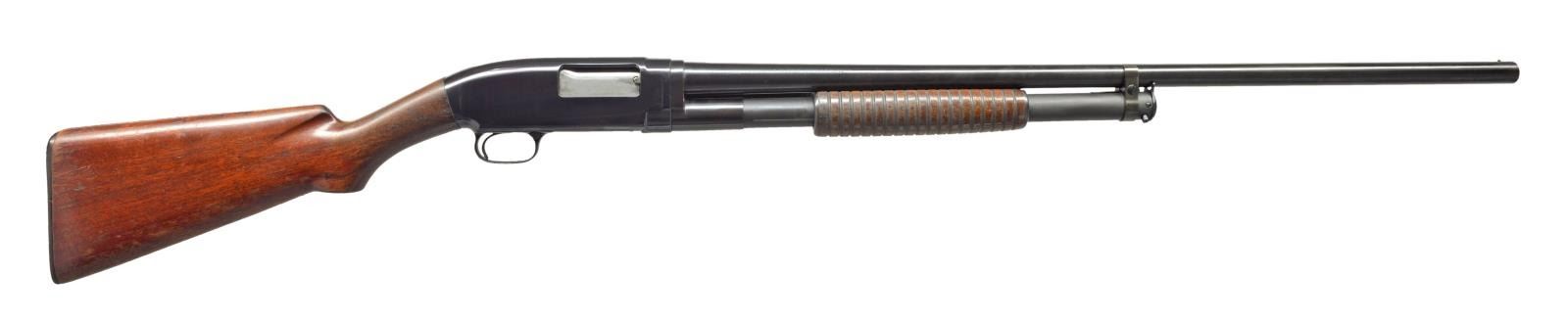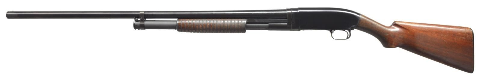 Cal. 12 Ga. S# 346829. Bbl. 30" plain of Nickel Steel w/ fixed Full choke & steel bead. Sm. rnd. grooved forend & full length early pistol grip style walnut stock w/ original buttplate. 1924 Mfg. CONDITION: over 98% reblued metal finish w/ bead blasted mag. tube. Wood shows finish wear & some age darkening w/ scattered marks. Bore shows areas of light pitting. (21-1994/DS). CURIO. $300-450.