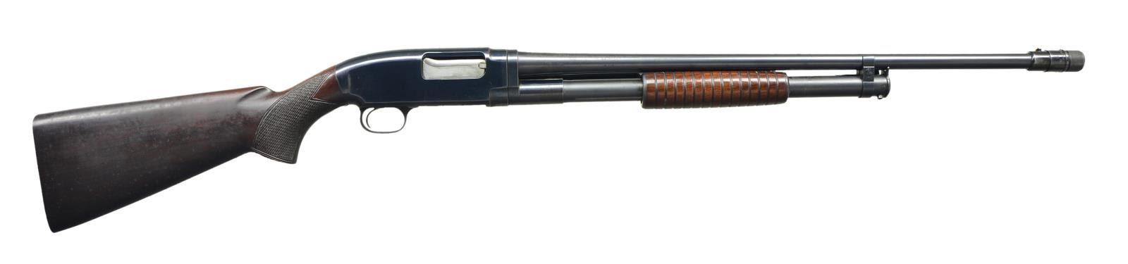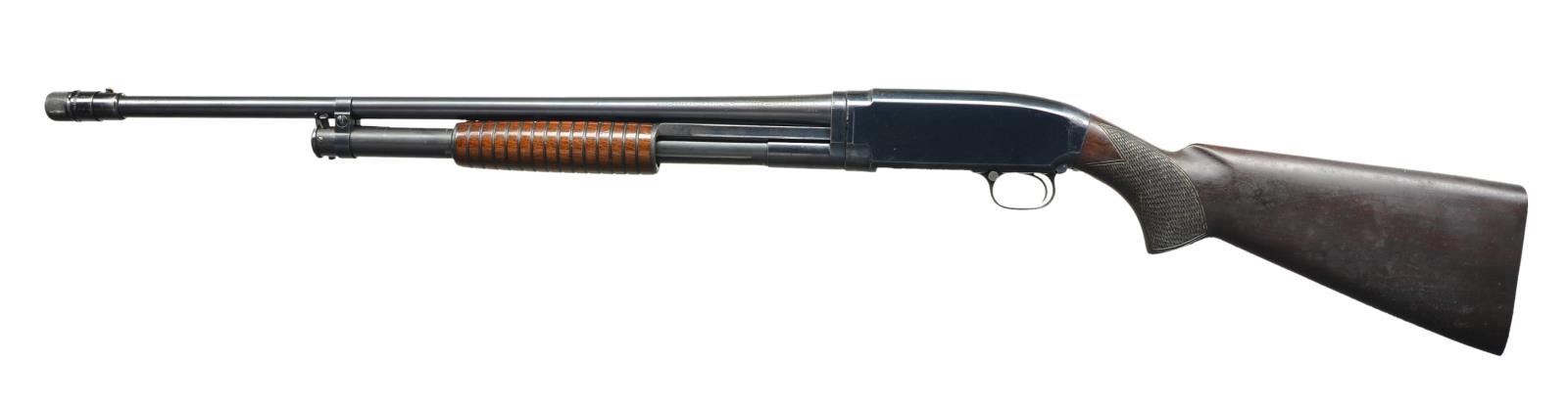 Cal. 20 Ga. S# 921399. Bbl. 24 3/8" w/ added Poly Choke. Chamber is 2 3/4" w/ choke marked “MOD” S#s match on receiver & bbl. extension. White front bead, blued metal & 14 groove forend & pistol grip buttstock w/ added coarse checkering. LOP: 13 3/4" to back of stock as there is no buttplate. CONDITION: metal has been reblued w/ scattered freckling, light rust & pinprick pitting. Stock set has also been refinished; light marks on the forend; buttstock has an oil soaked appearance w/ some water spotting. Bore is good, bright w/ fine streaking near the muzzle. (22-3718/CW). CURIO. $300-450.