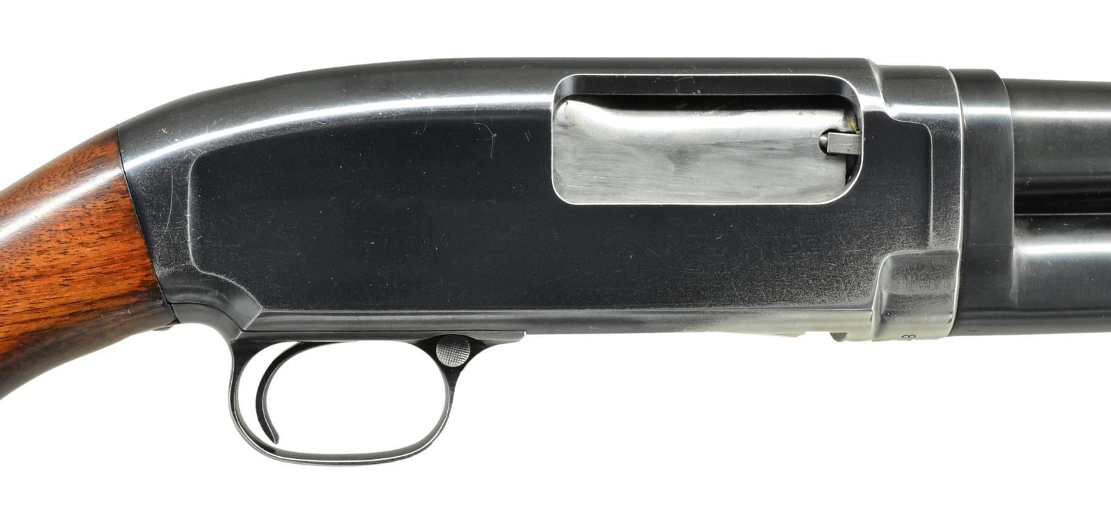 Cal. 16 Ga., 2 3/4". S# 878187. Bbl. plain of proof steel shortened to 25 1/2" w/ cyl. bore & steel bead. Original choke marking "FULL". Receiver extension has non matching number "950647". Sm. rnd. grooved forearm. Post war pistol grip walnut full length field stock w/ original buttplate. 1941 Mfg. CONDITION: bbl. assembly retains 97% reblued finish. Action has 70% lightly faded blue showing carry wear w/ sm. scratches. Forearm has original finish showing sm. marks. Stock has good refinish. Takedown is stiff. Very good bright bore. (21-2094/DS). CURIO. $350-500.
