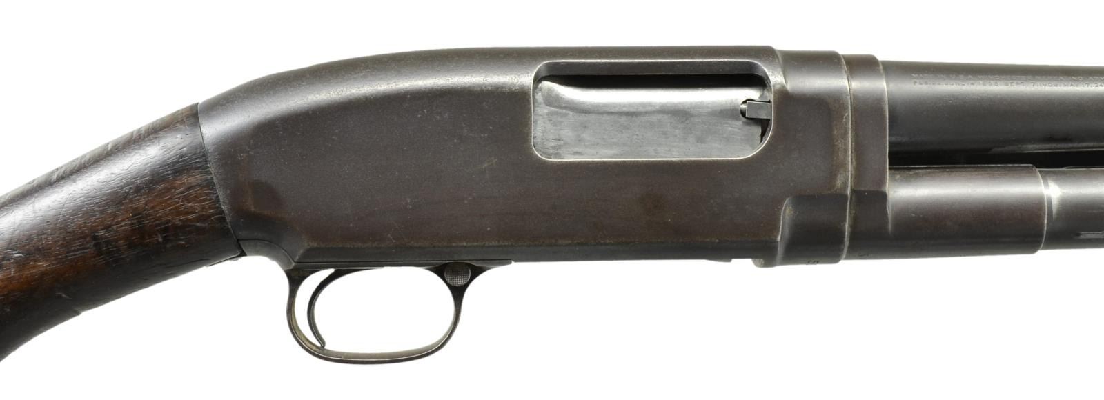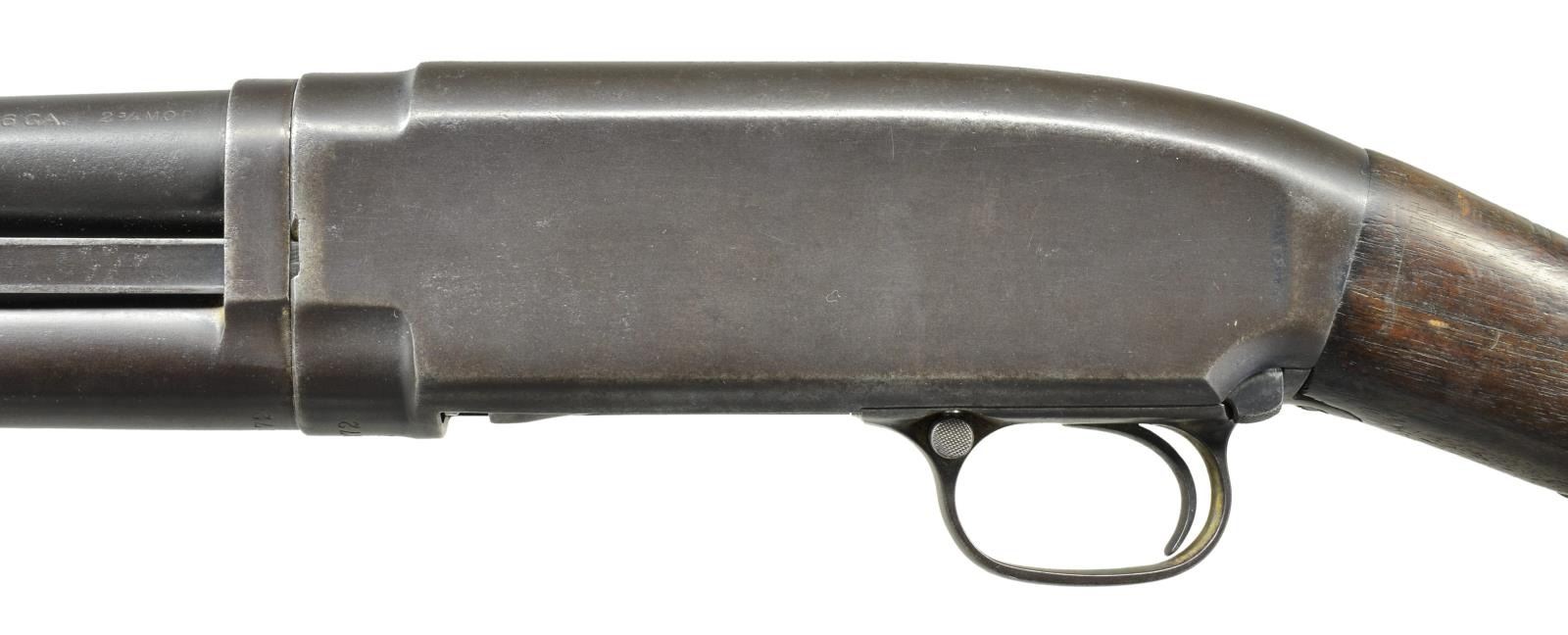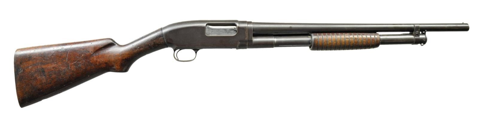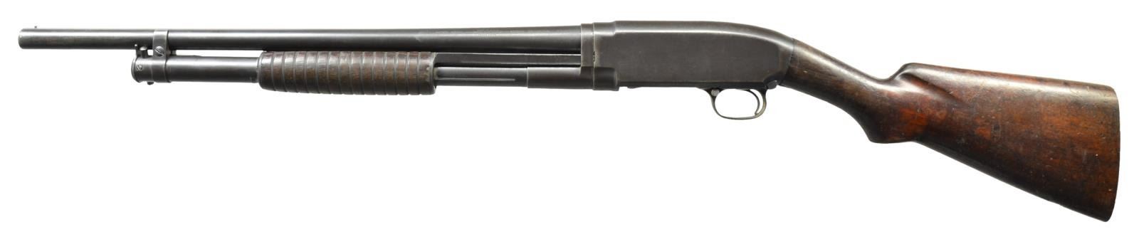 Cal. 16 Ga., 2 3/4". S# 595072. Bbl. plain, shortened to 20" w/ cyl. bore & steel bead. Original choke marking w/ Mod. Sm. rnd. grooved forearm. Early style pistol grip stock. Stock shortened to 12 3/4" w/out a buttplate or pad. Mfg. 1929. CONDITION: metal has faded to brown showing areas of pitting. Wood has age darkened, appearance showing wear, dents & handling marks. Good mechanics. Headspace ring was taken up 3 notches. Bore shows some very light pitting. (21-2297/DS). CURIO. $300-500.