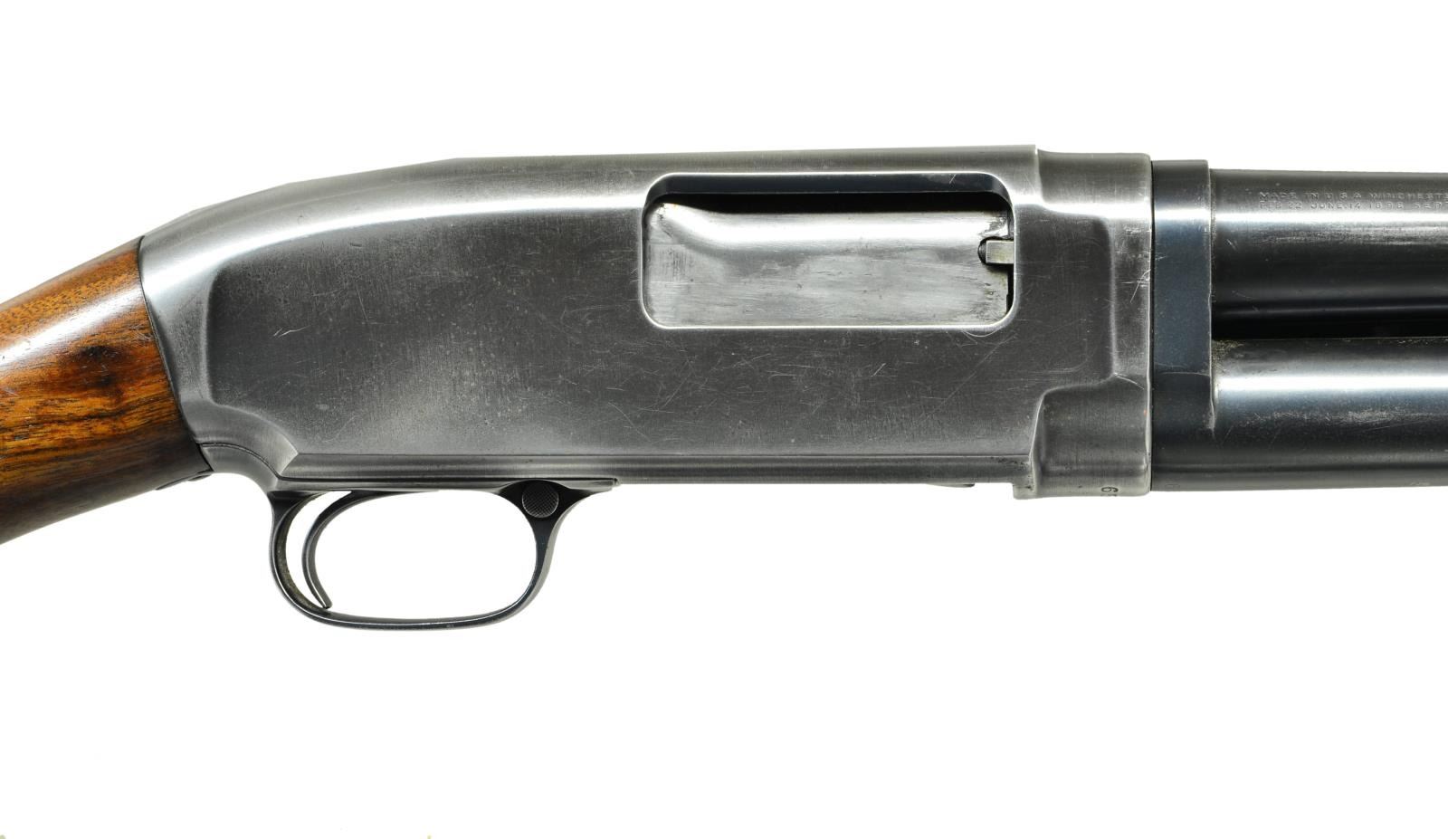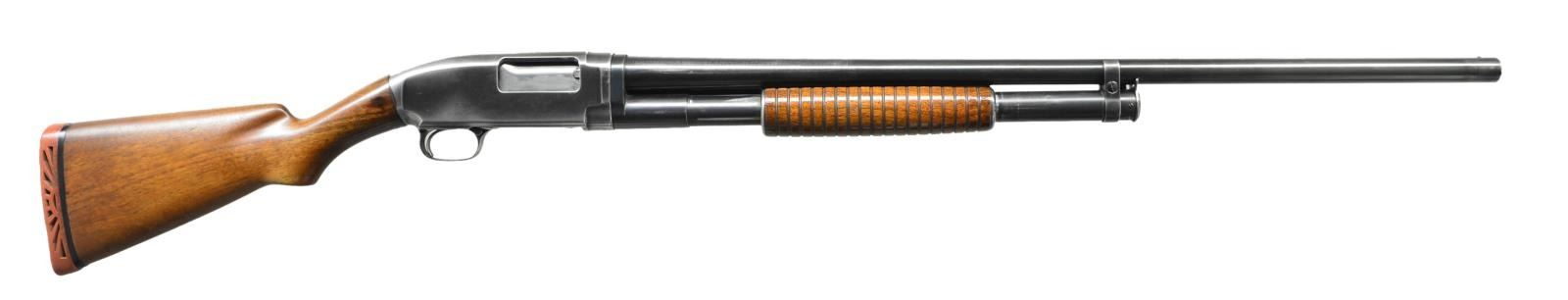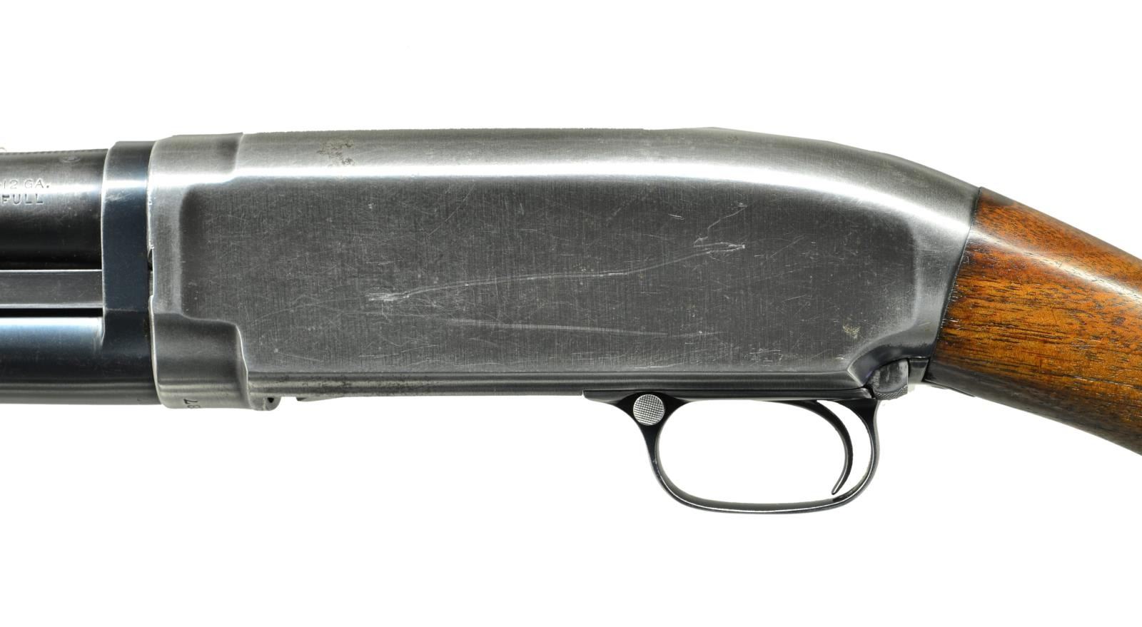 Cal. 12 Ga. S# 656887. Bbl. shortened to 28" w/ full length added matted top. cyl. bore. Steel bead. Original choke marking was "FULL". Sm. rnd. grooved forearm & early style pistol grip walnut stock. LOP: shortened to 13 1/2" over an added Ithaca sunburst pad. Mfg. 1932. CONDITION: bbl. & mag. tube have 60% dull worn reblued finish. Reblued action is fading to gray. Forearm has lightly worn original finish. Sanded buttstock has satin finish showing sm. marks. Sound mechanics. Good bright bore. (21-2333/DS). CURIO. $300-400.