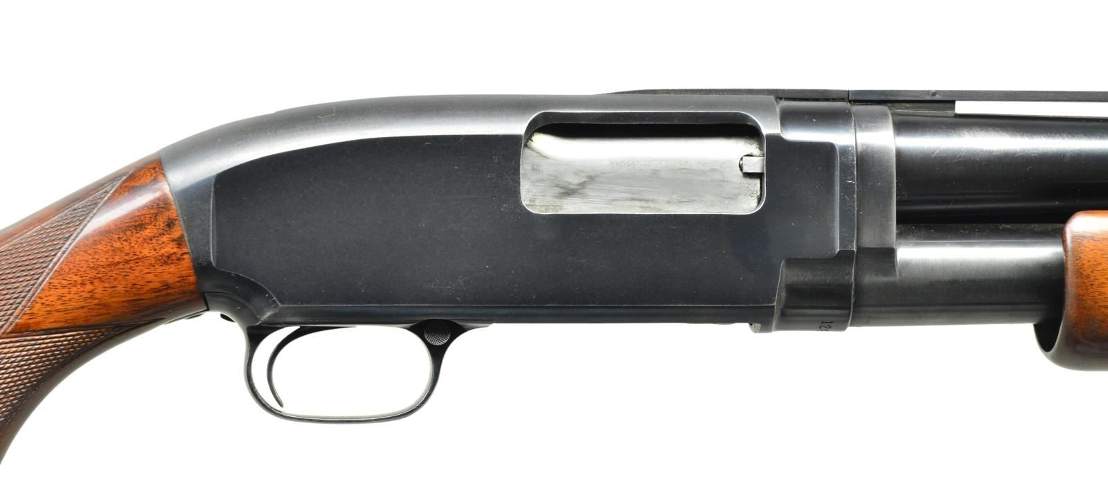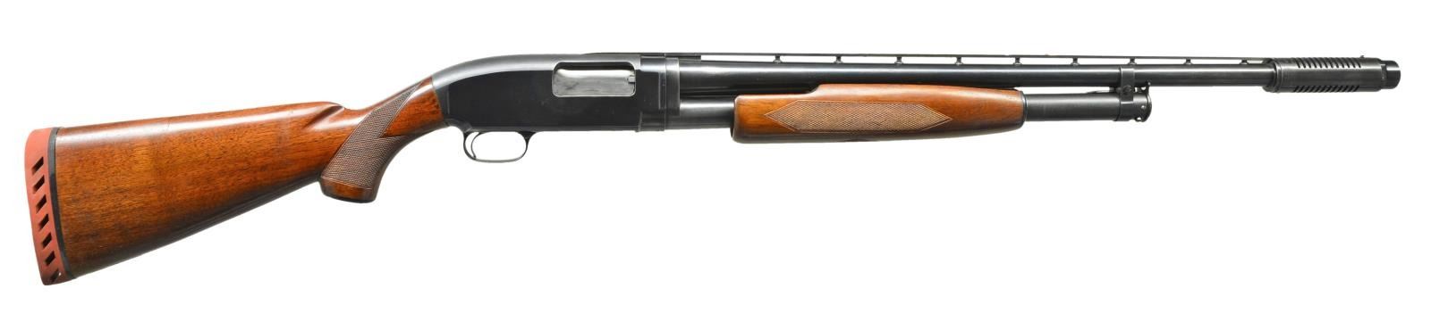 Cal. 12 Ga., 2 3/4". S# 1244903. Bbl. 26" over a factory integral Cutts compensator w/ spreader tube. Aftermarket Simmons rnd. post donut base VR. Skeet beavertail checkered forearm & hard rubber capped pistol grip walnut stock. LOP: shortened to 13 7/16" over an aftermarket Jostam pad. 1950 Mfg. CONDITION: over 80% lightly faded Simmons reblue finish. Original wood finish shows light wear w/ scattered marks. Very good bright bore. Sound mechanics. (22-942/DS). CURIO. $350-550.