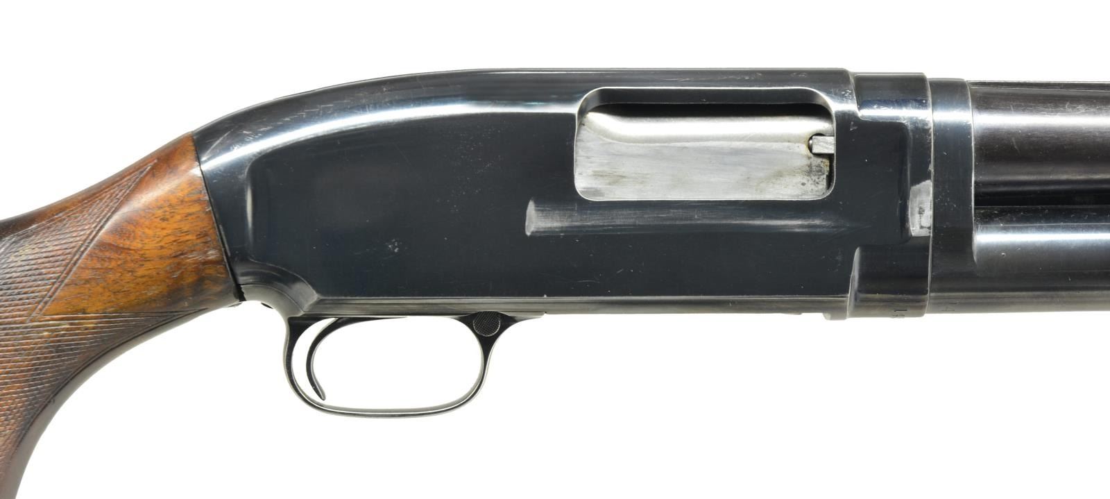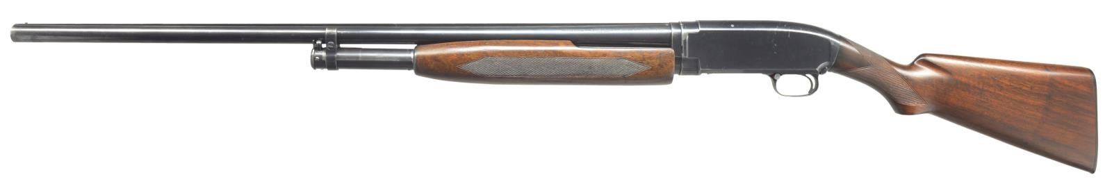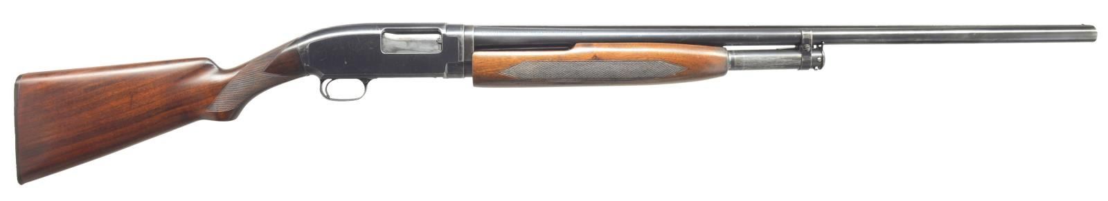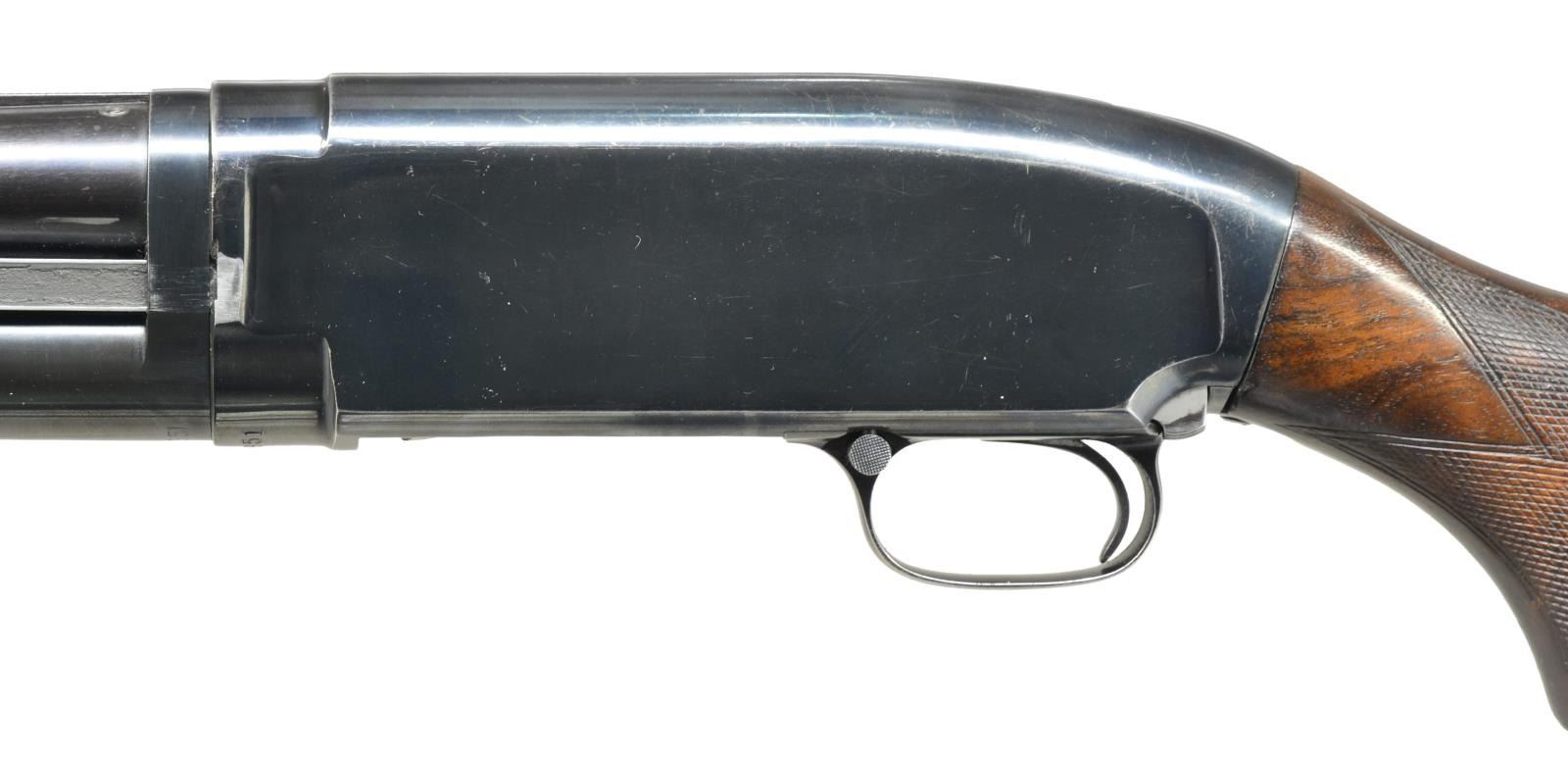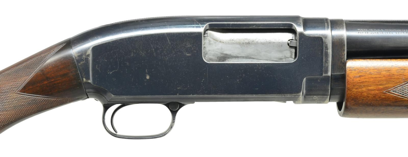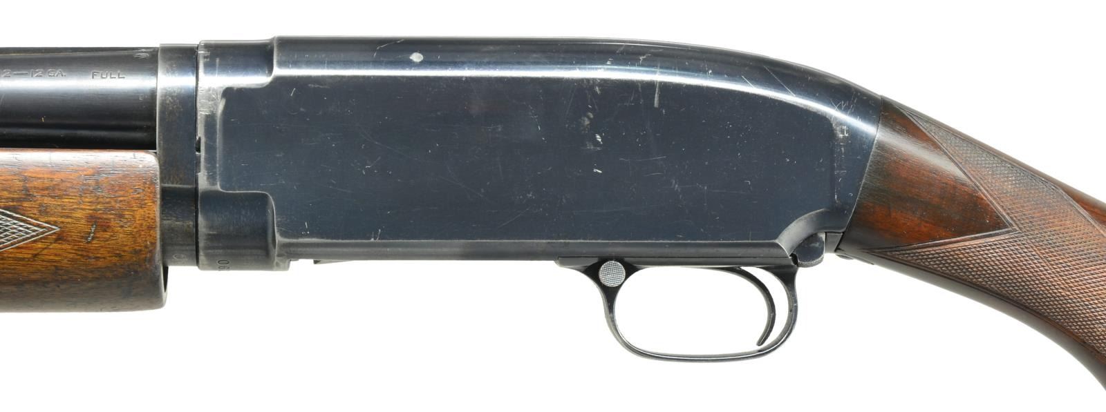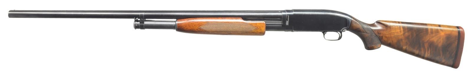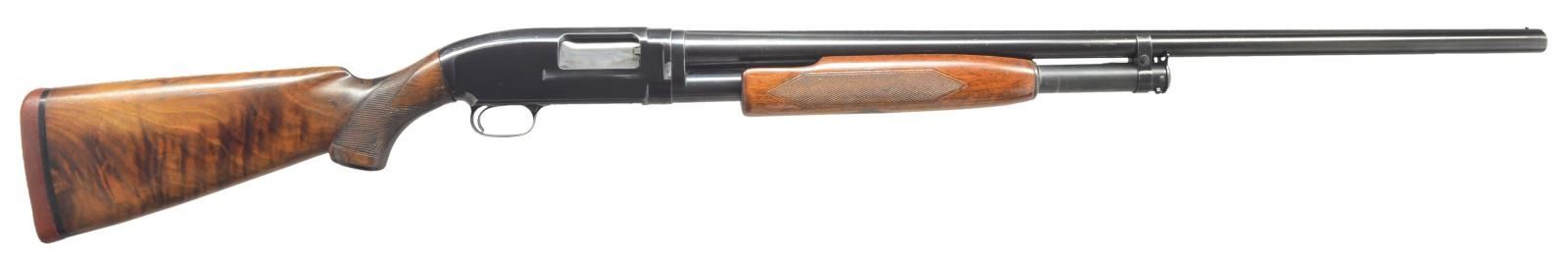 Cal. 12 Ga., 2 3/4". S# 518290. Bbl. 30" solid rib of Nickel Steel w/ fixed Full choke. Steel front bead. Factory Trap style extension forearm w/ hand checkering. Early style pistol grip Field stock w/ added Tournament grade hand checkering. LOP: 13 1/2" over refit Win. buttplate. 1928 Mfg. CONDITION: 70% lightly faded blue showing edge & slide wear w/ takedown marks on left side of frame. Forearm has worn original finish showing scratches & marks. Stock has good refinish. Very good bright bore. (21-1987/DS). CURIO. $500-750.
