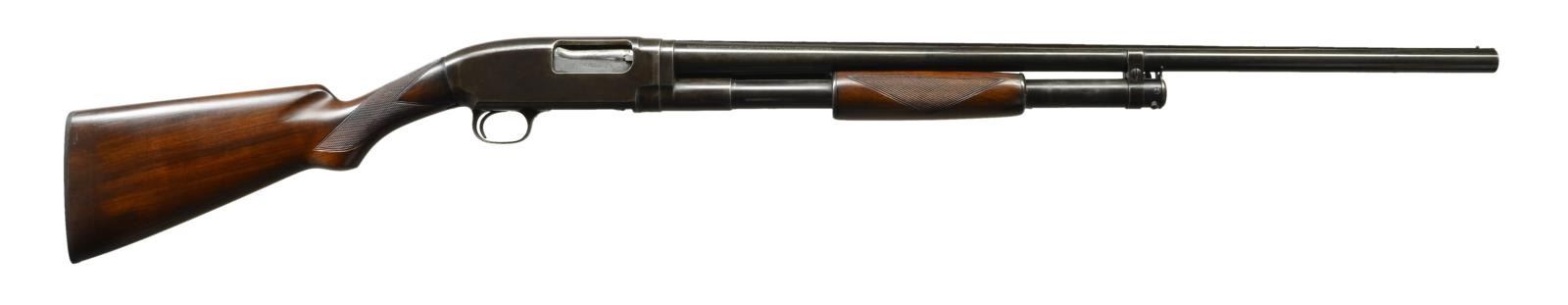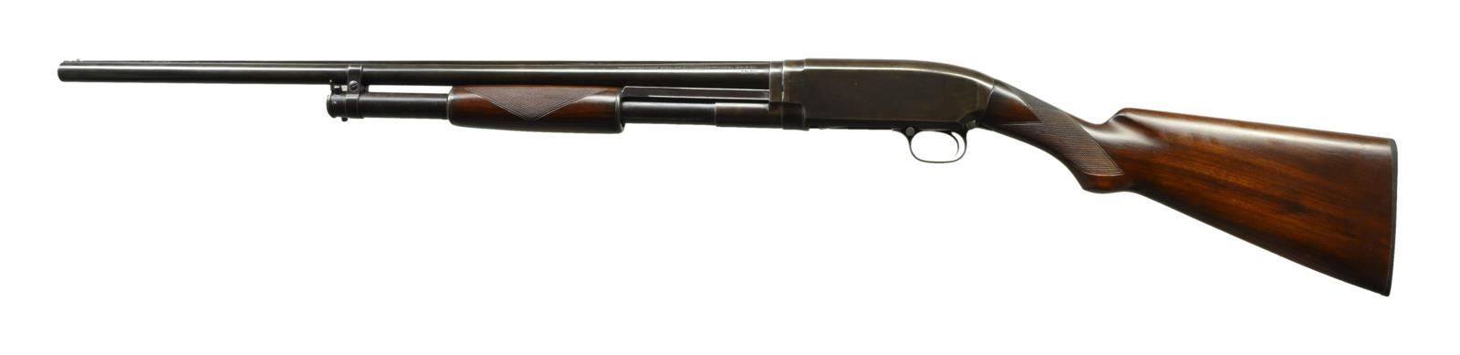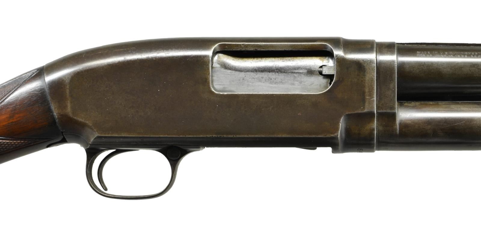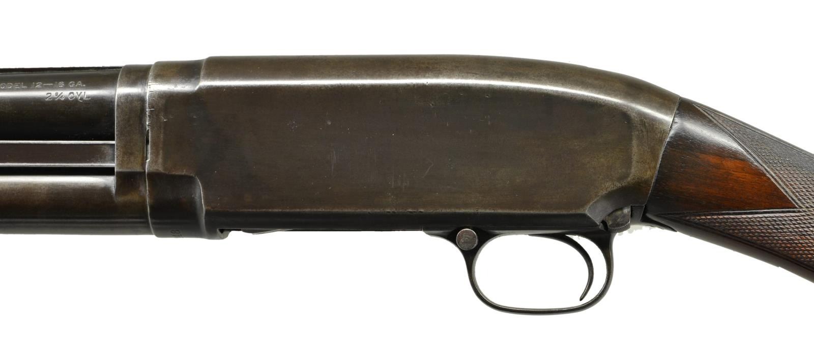 Cal. 16 Ga., 2 3/4". S# 644148. Bbl. 26" of Proof Steel w/ solid rib, fixed "CYL." choke & steel bead. Small rd. forearm has Tournament style 2 panel checkering. Early style pistol grip stock has added Tournament style checkering. LOP. 13 3/4" over replacement buttplate & 3/4" added wood spacer. Mfg. 1931. CONDITION: metal has brown appearance from touchup finish w/ scattered light pitting. Wood has has very good finish & freshly cut checkering. Sound action, take down is stiff. Take-up ring is adj. 3 notches. Bbl. has light ring noticeable only on the inside approx. 8" from the breech. (21-2017/DS). CURIO. $500-700.