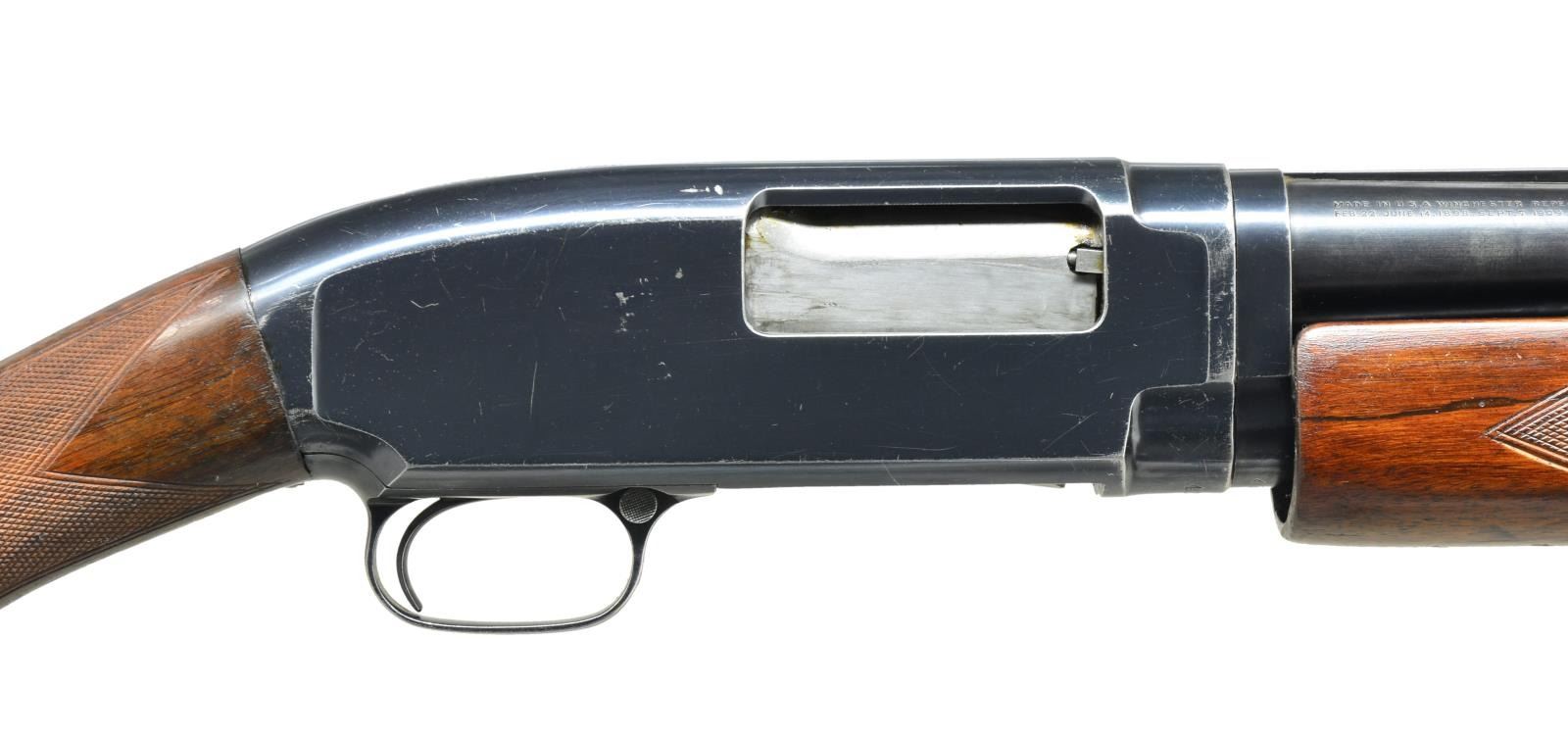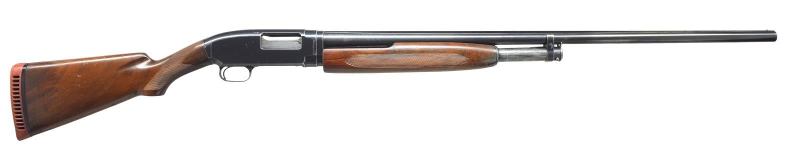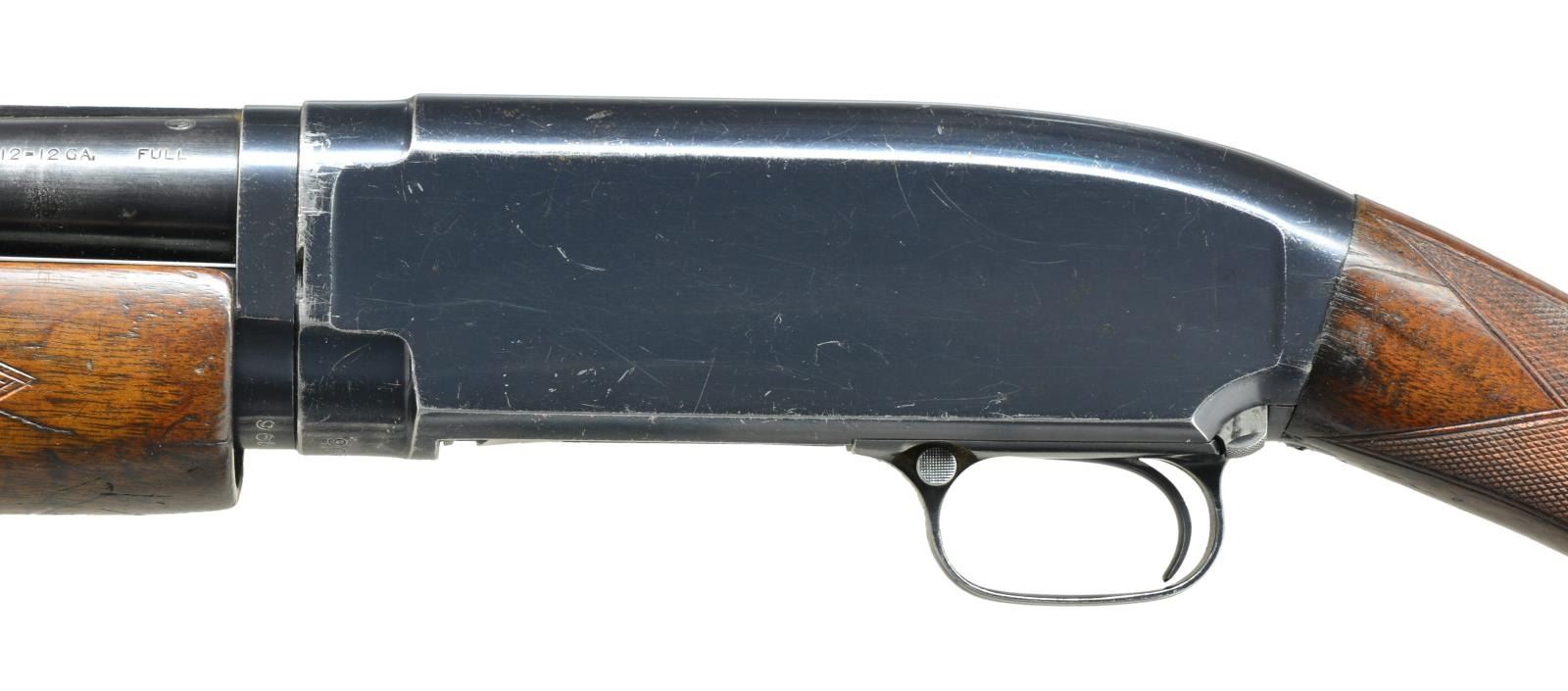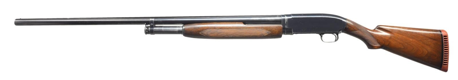 SHOTGUN. Cal. 12 Ga. S# 483496. Bbl. 32" of Nickel Steel w/ solid rib & fixed Full choke. Steel front bead. Beavertail extension forearm w/ 2 panel Tournament grade checkering. Early style pistol grip Field stock w/ added Tournament style checkering. LOP: shortened to 13 5/8" over an aftermarket Hawkins pad. 1927 Mfg. CONDITION: over 80% blue showing slide & edge wear w/ scattered scratches having takedown marks on receiver. Forearm has worn finish w/ recut checkering showing numerous dents & marks w/ lg. repaired crack & touch up finish at rear of left side. Stock has moderately worn finish showing numerous scratches & marks. Good bright bore. (21-1998/DS). CURIO. $450-600.