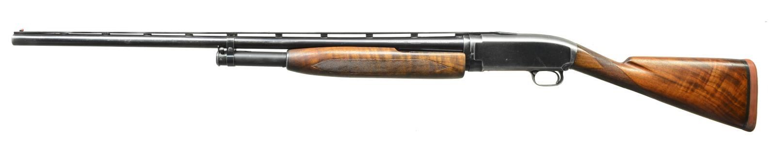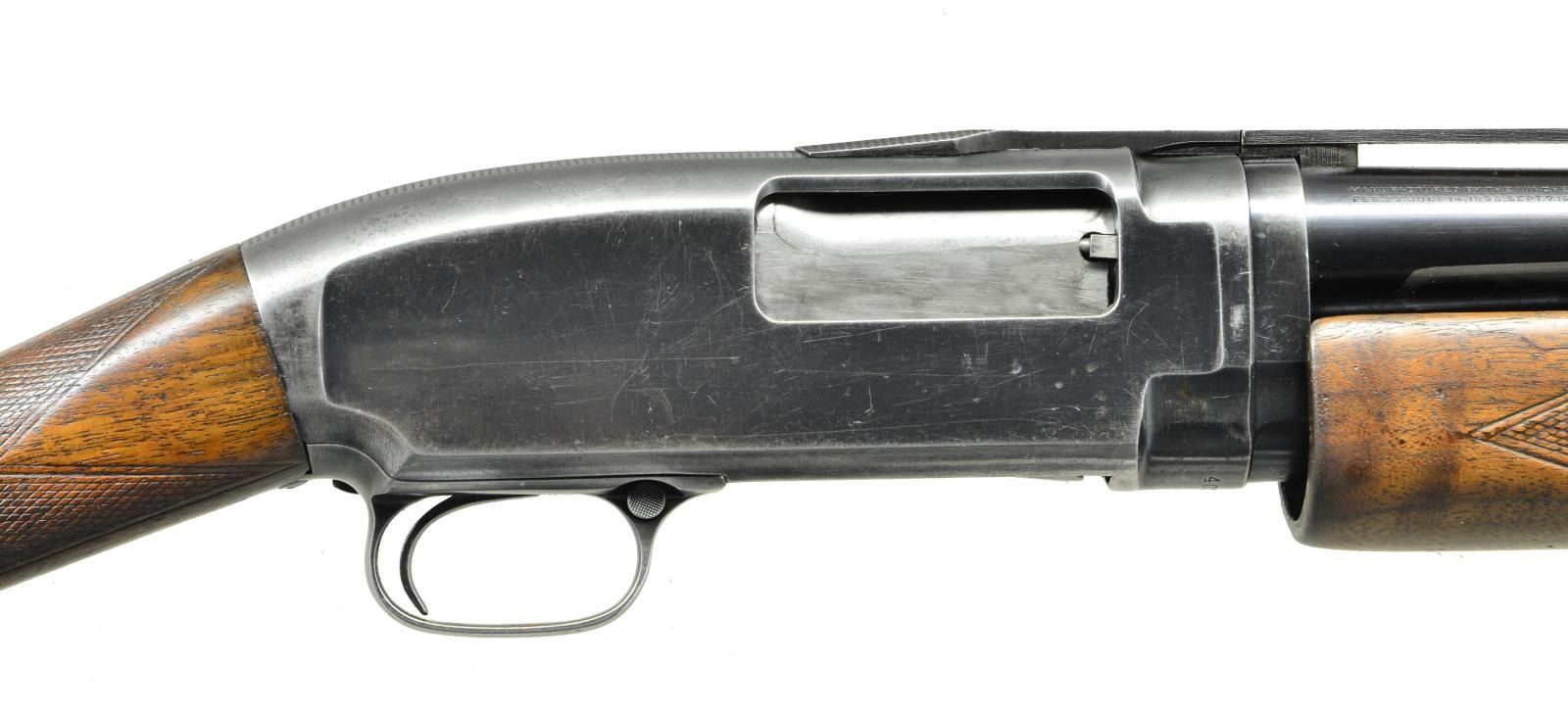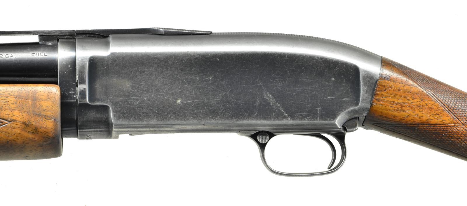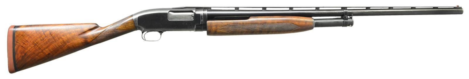 Cal. 12 Ga. S# 407159. Bbl. 30" replacement of Nickel Steel w/ factory milled vent rib & fixed Full choke. Receiver extension is renumbered to match action. Red target front sight & steel mid bead. Beavertail extension forend & straight grips walnut stock have trap grade checkering. LOP. 14" over solid red Winchester pad. Mfg. 1925. CONDITION: 70% lightly faded blue. Refinished wood has thinned checkering showing handling marks. Sound action. Bore is generally bright w/ a ring bulge in forcing cone area. (21-2279/DS). CURIO. $400-600.