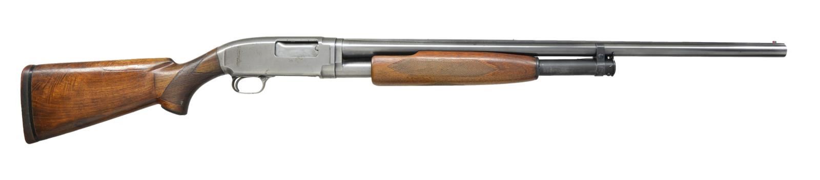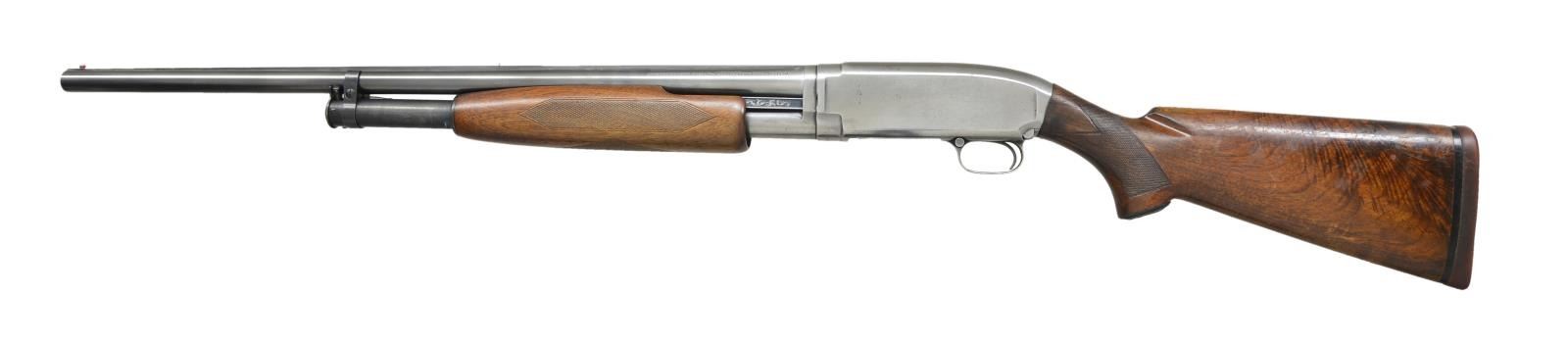 Cal. 12 Ga. S# 788866. Bbl. proof steel w/ solid rib shortened to 27". White target front sight w/ steel mid bead. Cyl. for original choke marking is full. Beavertail forearm & hard rubber capped stock of nicely grained walnut w/ factory checkering. LOP is 14 1/4" over Winchester solid red pad. CONDITION: 40% blue fading to gray. Firing pin w/ drop before action is locked, must be repaired to be safe. Bore is generally bright showing some fowling. (21-2310/DS). CURIO. $400-600.