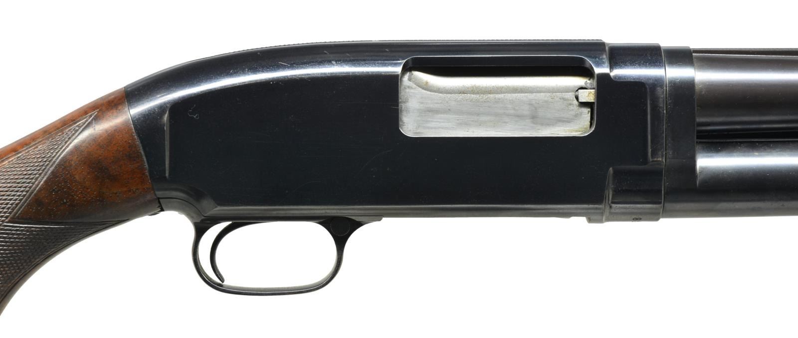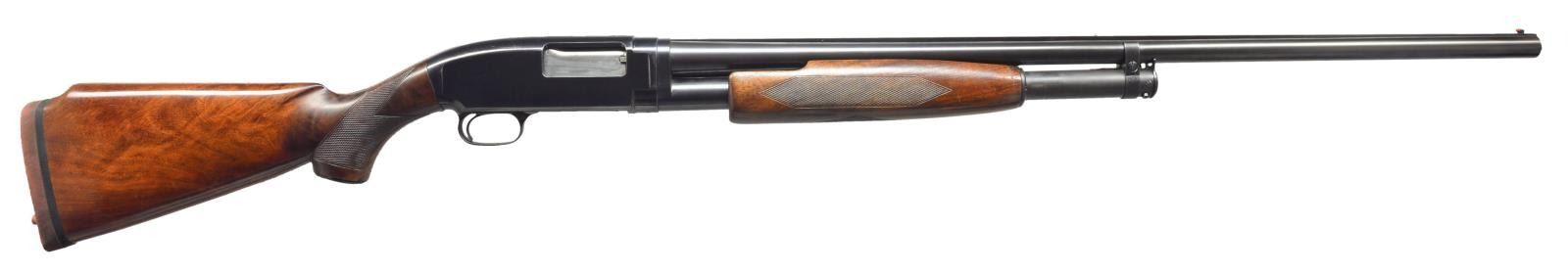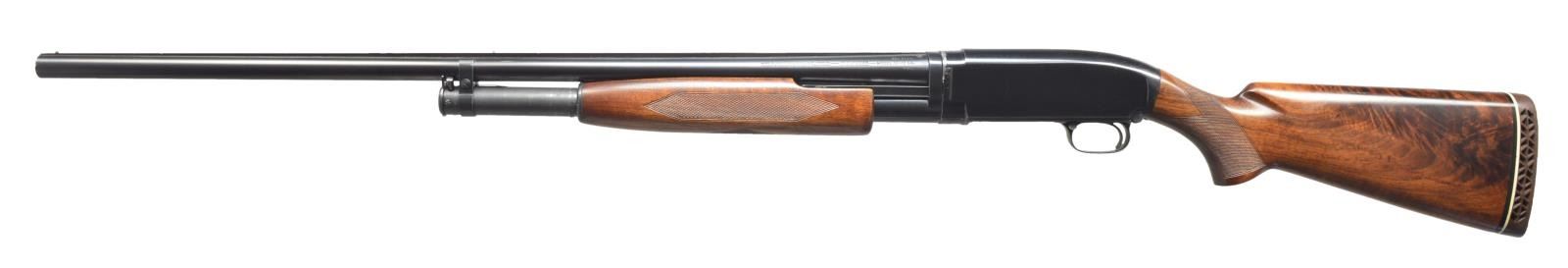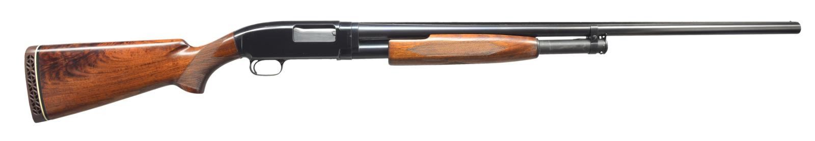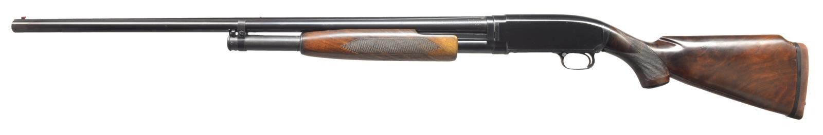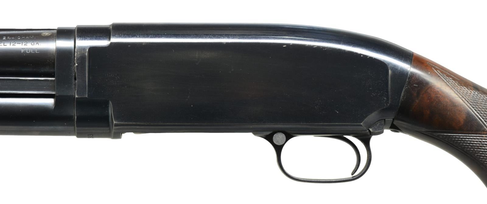 Cal. 12 Ga., 2 3/4". S# 843183. Bbls. 30" of Winchester Proof Steel w/ fixed Full chokes. Red target front sight w/ steel mid bead. Beavertail forearm & Monte Carlo comb capped pistol grip stock of fancy walnut w/ factory target checkering. LOP: shortened to 13 5/8" over repro. solid red pad. 1940 Mfg. CONDITION: retains 95% original blue showing light slide & edge wear w/ sm. marks. Wood has worn finish showing numerous scratches & marks. Stock has a chip left of trigger guard tang. Bore is generally bright w/ a bulge 1 1/2" from muzzle. (21-2271/DS). CURIO. $400-600.