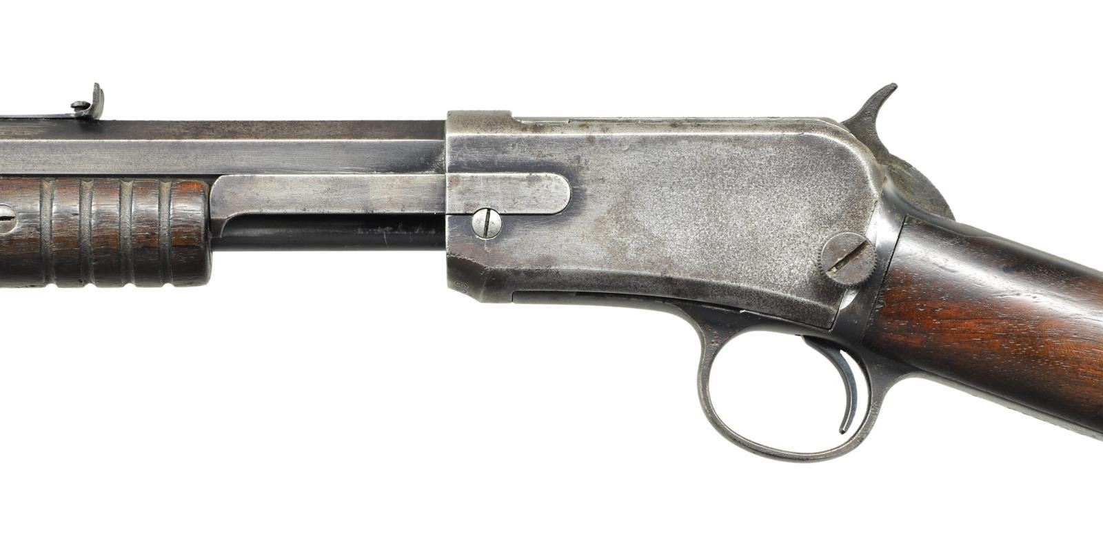 Cal. 22 Short. S# 237098. Bbl. 24". Fixed blade front marked “PAT 1902” & elevation adjustable rear sight “PAT JAN 29, 1901” Takedown action w/ matching S# on frame & lower tang. Tube fed magazine w/ 12 groove forend & smooth straight grip buttstock w/ crescent buttplate. CONDITION: metal is primarily a fading brown/gray & blue patina w/ some trace of original blue in the protected areas. Stock set shows typical dings & dents w/ 2 tight cracks emanating from both tangs. Bore is poor, dark, pitted w/ little rifling visible. (22-6200/CW). CURIO. $200-400.