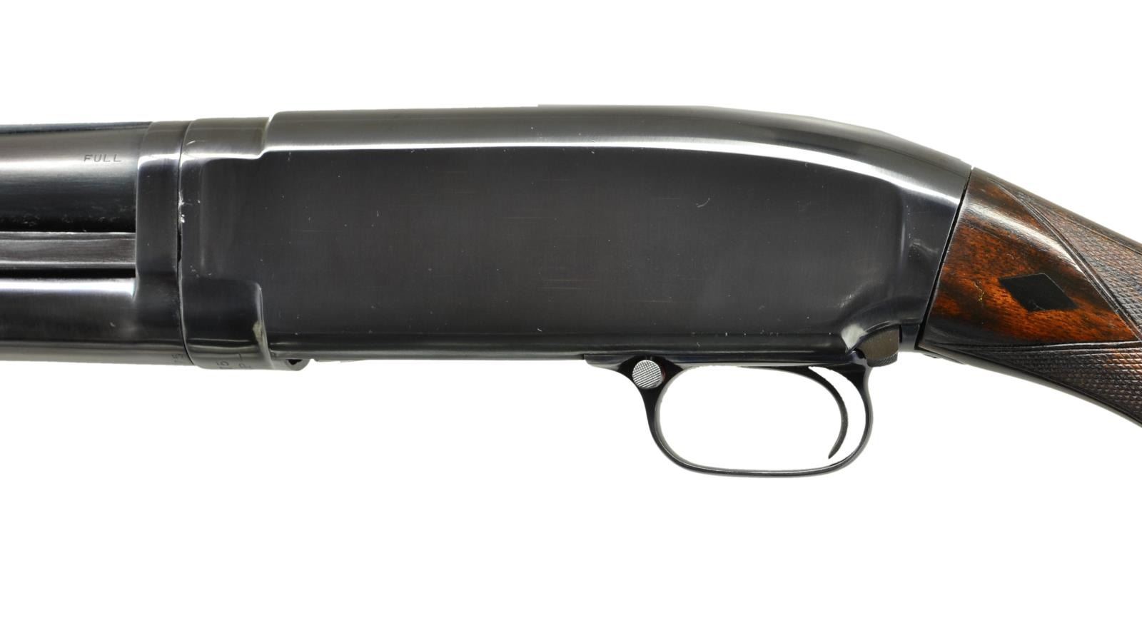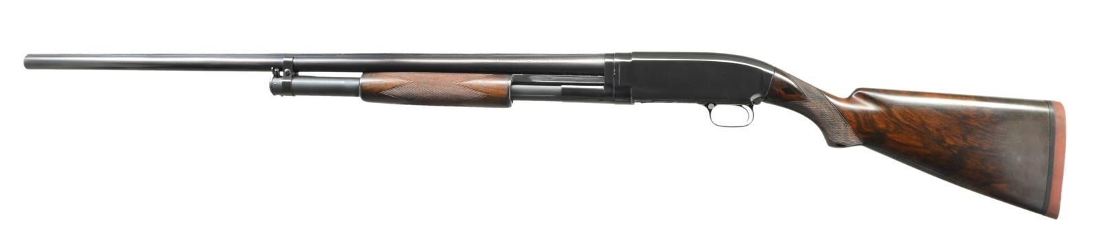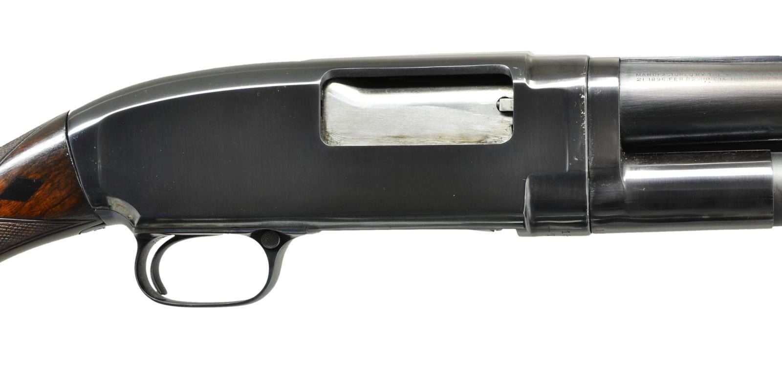 PUMP SHOTGUN. Cal. 12 Ga. S# 185675. Bbl. 30" nickel steel w/ solid rib, fixed full choke & aluminum bead. Sm. rnd. forearm & early style pistol grip walnut stock w/ trap grade checkering. Stock has black diamonds on both sides of wrist. LOP: 14 1/4" over reproduction solid red pad & 1" wood spacer. Mfg. 1919. CONDITION: 97% reblued finish. Forearm has lightly worn finish w/ freshened checkering. Refinished stock has deeply recut checkering. Trigger will release before action is closed & must be repaired to be safe. Bbl. takeup ring is loosened by 1/2 turn leaving bbl. extremely loose on frame & not safe for use until corrected. Lightly pitted bore. (21-2356/DS). CURIO. $300-500.