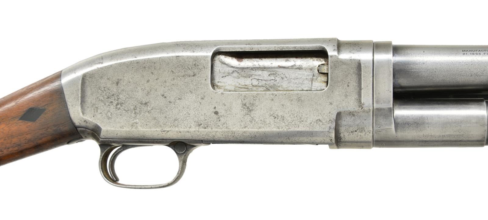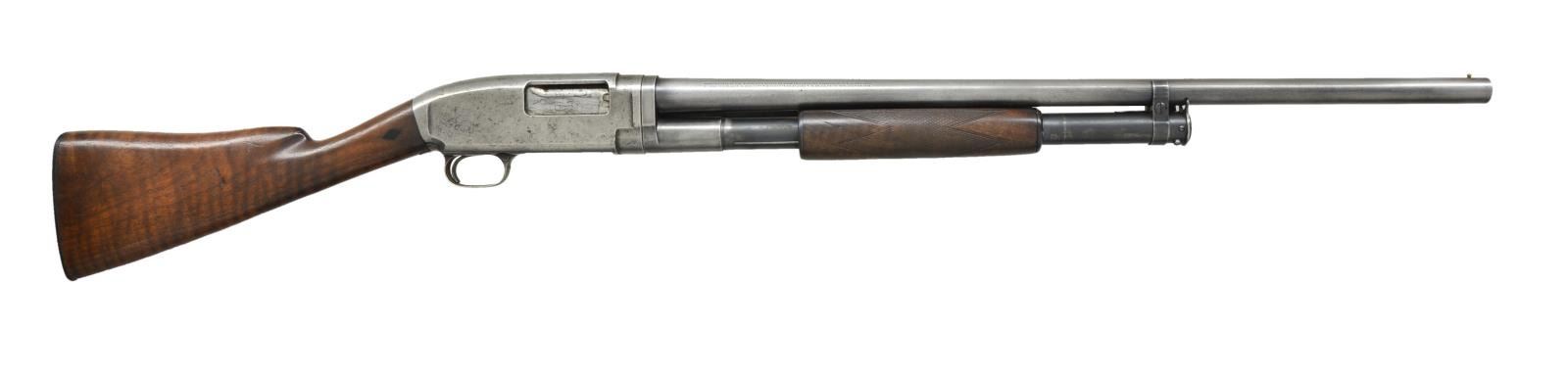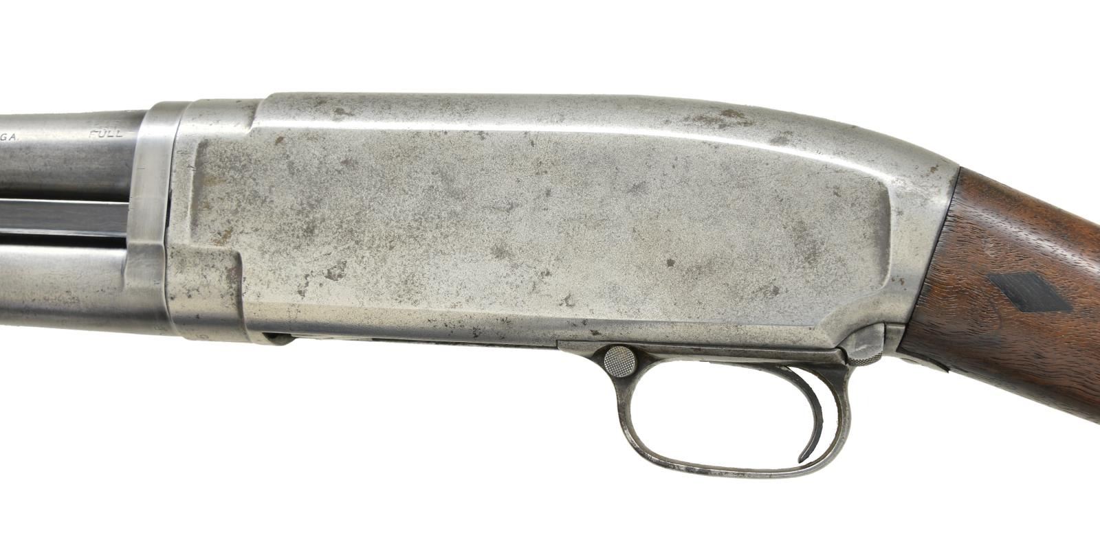 Cal. 12 Ga. S# 76405. Bbl. Nickel Steel shortened to 26" w/ added full length matting. CYL. bore, original choke marking is full. Brass bead. Sm. rnd. walnut forearm w/ wrap around Trap grade checkering. Straight grip checkered stock w/ Black Diamonds. LOP : shortened to 13 7/8" w/ replacement buttplate. Mfg. 1914. CONDITION: metal finish is fading to gray showing scattered spots of pitting. Forearm shows heavy finish in checkering wear w/ dents & handling marks. Stock is heavily sanded & undersized at action w/ dished comb, largely removed checkering & shows numerous scratches/dents. Good mechanics. Heavily pitted bore. (21-2231/DS). CURIO. $300-400.