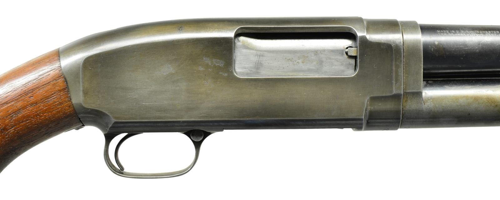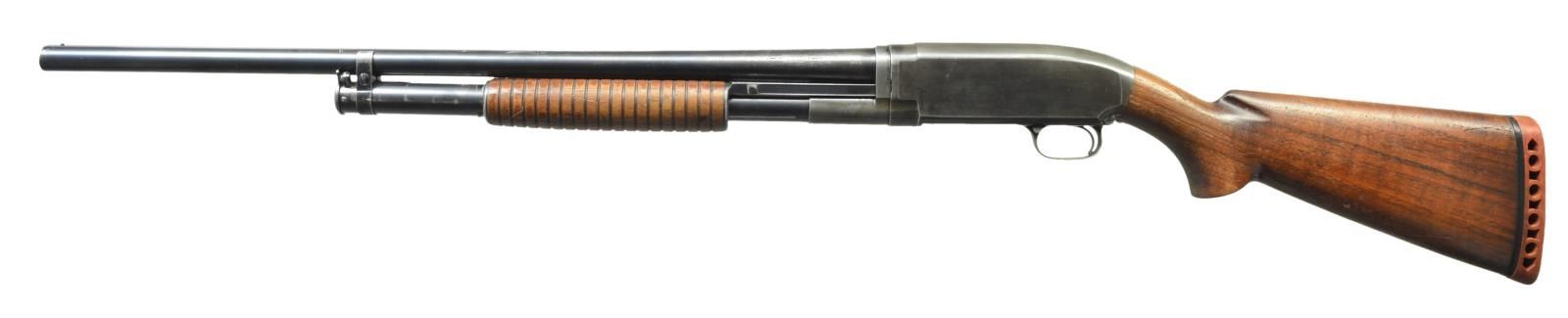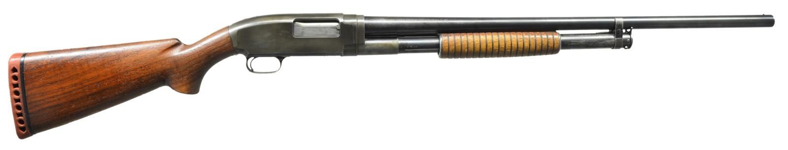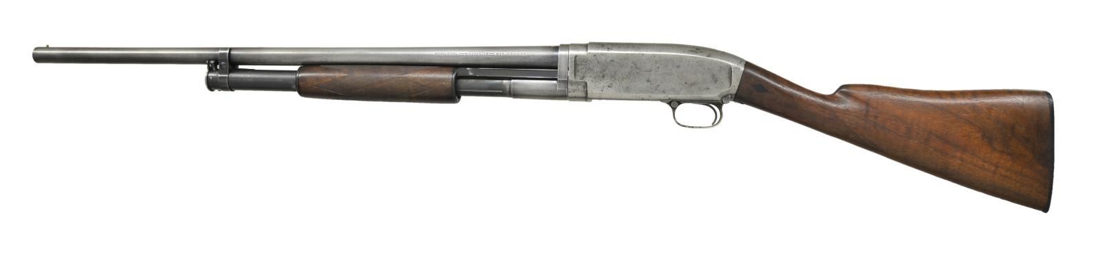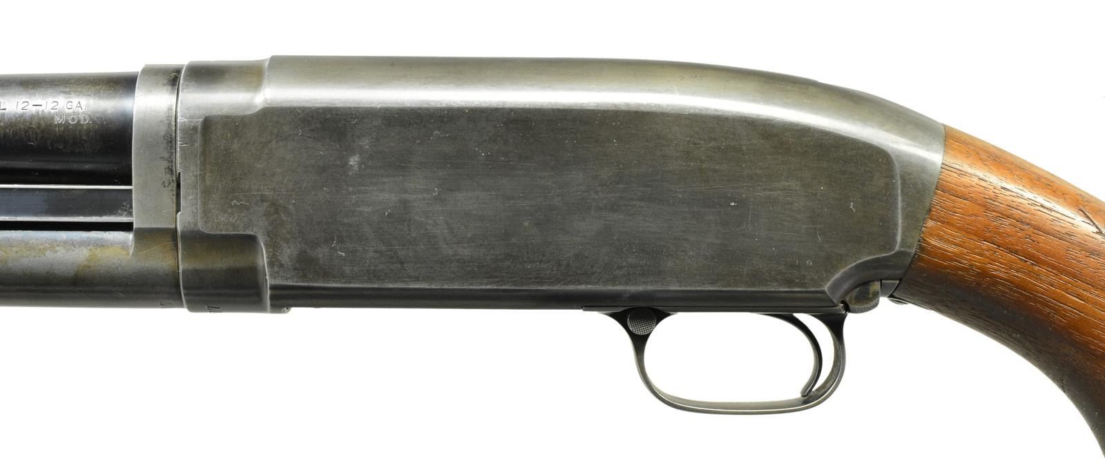 Cal. 12 Ga. S# 76405. Bbl. Nickel Steel shortened to 26" w/ added full length matting. CYL. bore, original choke marking is full. Brass bead. Sm. rnd. walnut forearm w/ wrap around Trap grade checkering. Straight grip checkered stock w/ Black Diamonds. LOP : shortened to 13 7/8" w/ replacement buttplate. Mfg. 1914. CONDITION: metal finish is fading to gray showing scattered spots of pitting. Forearm shows heavy finish in checkering wear w/ dents & handling marks. Stock is heavily sanded & undersized at action w/ dished comb, largely removed checkering & shows numerous scratches/dents. Good mechanics. Heavily pitted bore. (21-2231/DS). CURIO. $300-400.