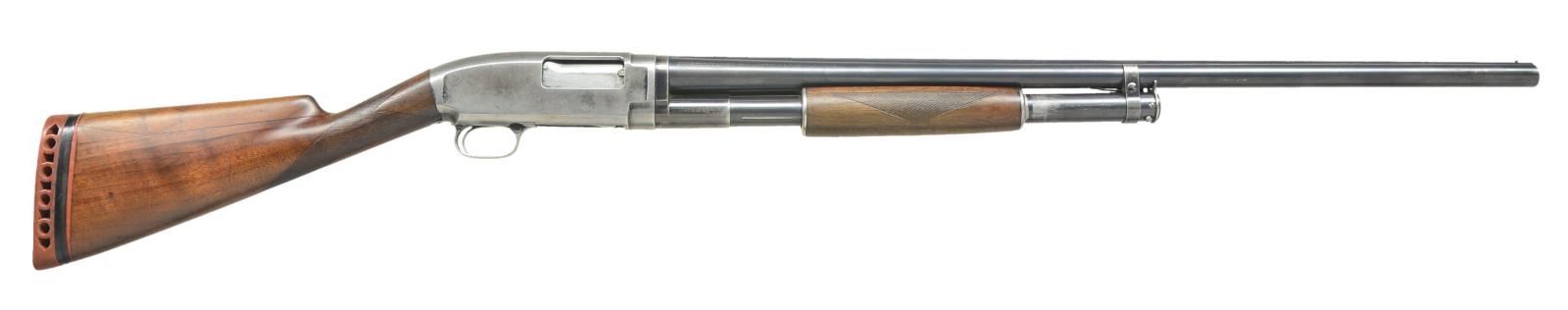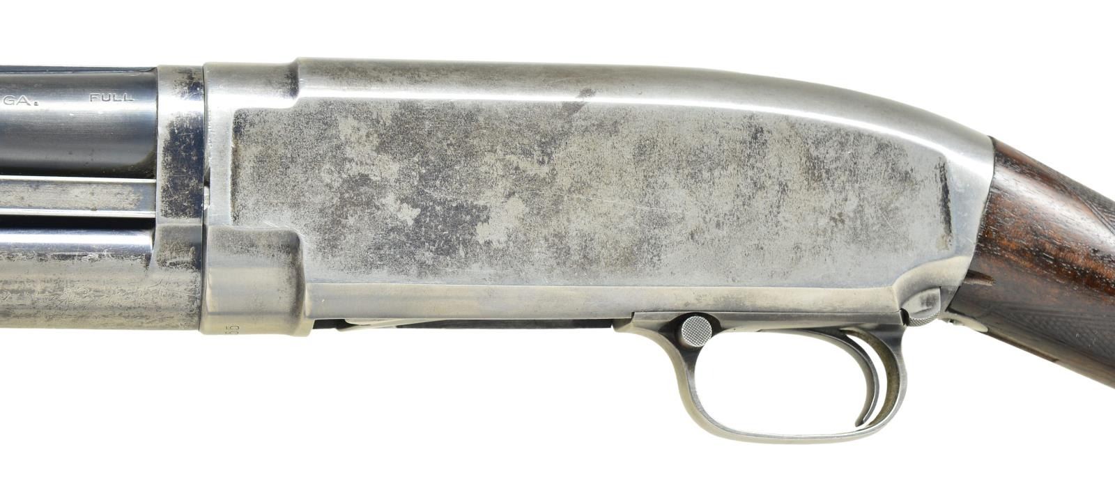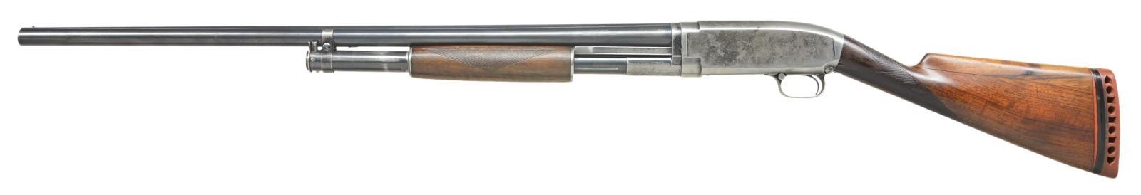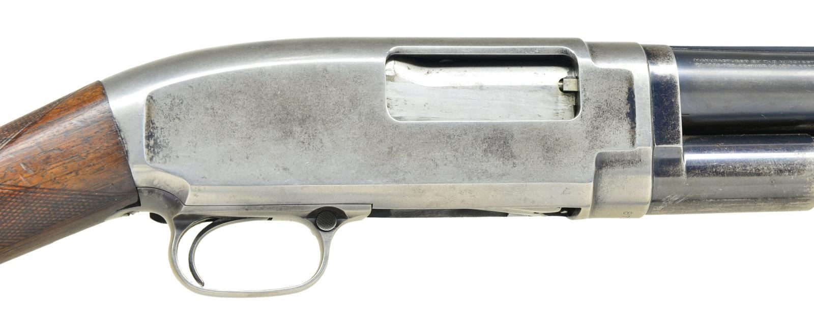 SHOTGUN. Cal. 12 Ga. S# 87255. Bbl. 30" of nickel steel w/ solid rib, fixed full choke & steel bead. Sm. rnd. forearm & straight grip stock w/ Tournament style hand checkering. LOP: shortened to 13 5/8" over an aftermarket Whippet pad & 1/2" of added spacers. Mfg. 1915. CONDITION: bbl. retains 80% dull lightly faded blue. Mag. tube & action have some original blue fading to gray showing carry & slide wear. Refinished wood shows weakened checkering w/ scattered scratches & marks. Stock has a full length 1" piece of wood spliced on comb area of stock. Hammer will release before action is closed & must be repaired to be safe. Good bore shows some very light marks. (21-2126/DS). CURIO. $400-600.