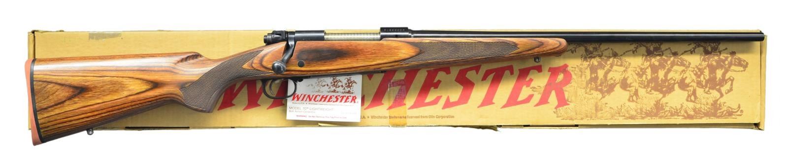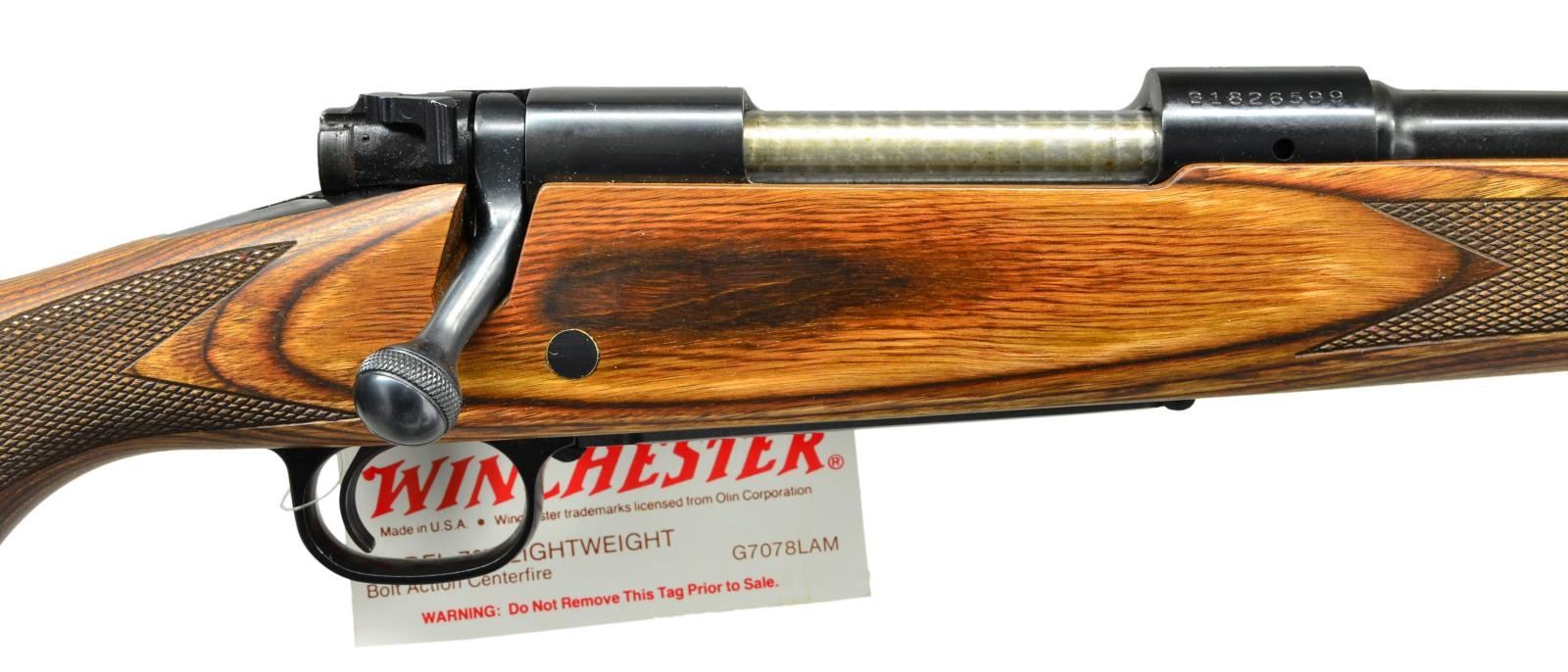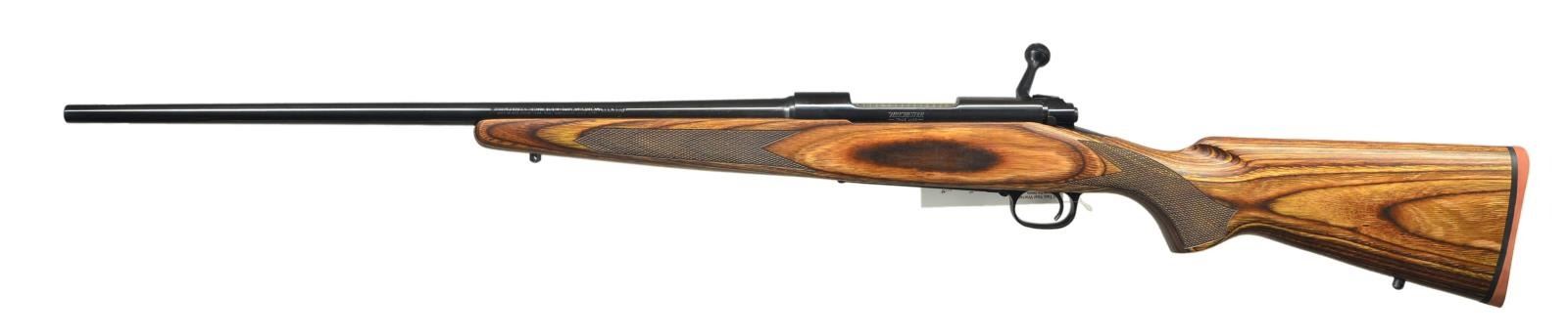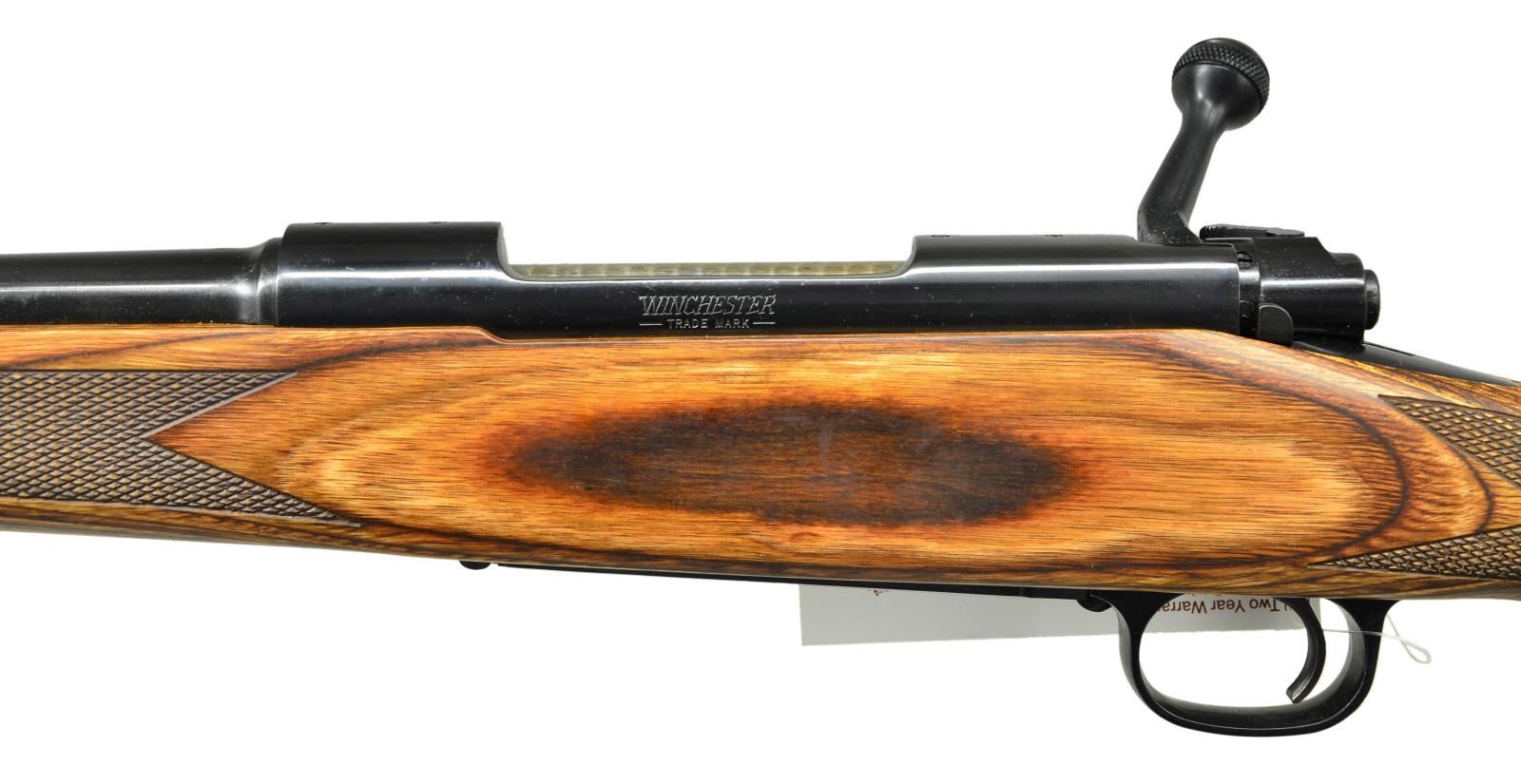 ACTION RIFLE. Cal. 280 Rem. S# G1826599 (1987). Bbl. 22" w/out sights. Bolt is numbered "599". Laminated brown stock w/ checkering, sling studs & red pad. UNATTACHED ACCESSORIES: matching numbered US Repeating Arms box containing manual. CONDITION: near excellent overall including bore; Winchester hang tag on triggerguard bow. (23-153/MD). MODERN. $700-1,000.