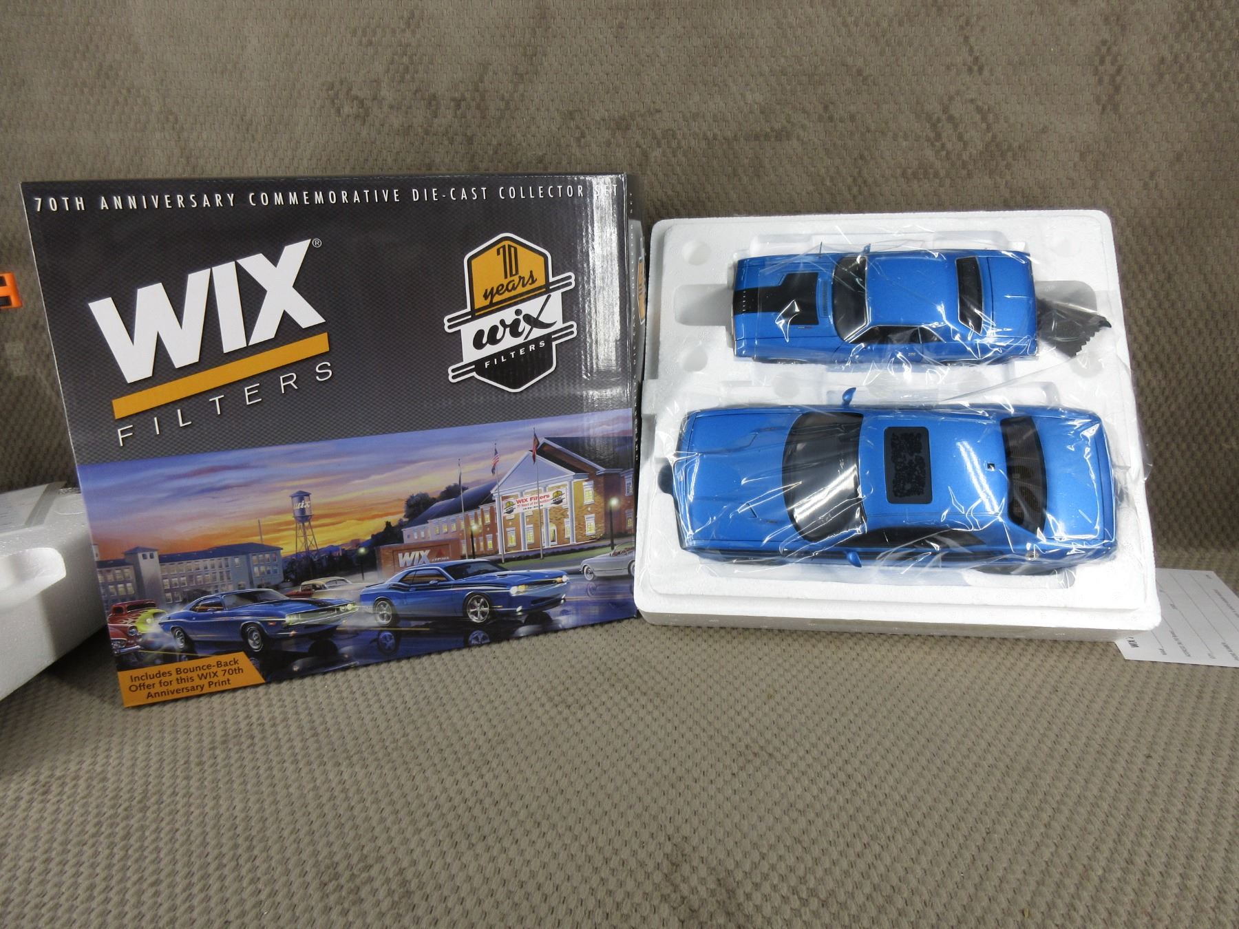 WIX Filters 70th Aniversary Die-Cast Collector Set - Set includes 1 - 1970 Hemi Dodge Challenger RT 1:24 scale and 1 - 2009 Dodge Hemi Challenger Classic 1:18 scale box has been opened but cars have not been unpacked
