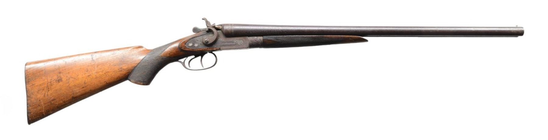 Cal. 16 Ga. S# 9520. Belgian Damascus barrels cut to 22" with front bead & cyl. bores. Sideplates & receiver have engraving & silver plated lays of retriever on left plate, partridge on right plate & retriever on trigger guard bow. Double triggers & extractors. Splinter forearm & pistol grip walnut stock with checkering, name shield on cap of grip stamped "J S". CONDITION: brown barrels has peppery oxidation throughout. Receiver & locks have brown patina appearance. Fair worn wood finish with cracks, gouges & chips. Forearm iron missing screws. Fair bores with pitting. Right hammer unable to hold at full cock. (24-1484/MD). MODERN. $200-300.
