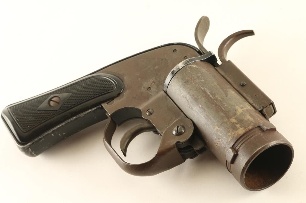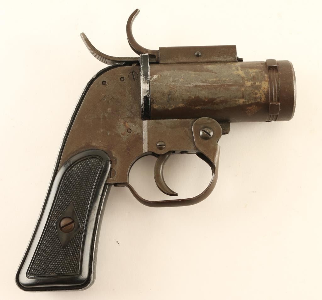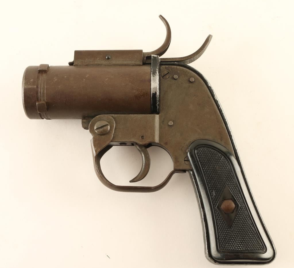 #240973 WWII and later era U.S. military double-action-only top-break 37mm flare pistol developed primarily for aircraft use. Features a 4 1/8" barrel, steel frame with aluminum grip straps, smooth trigger w/ guard, concealed hammer, checkered black synthetic grips. Two latches on top, one to open the action, one to release from an aircraft flare port mount. The right side of the frame is marked "WMSC / U.S. PROPERTY / PISTOL PYROTECHINIC M-8" in a large triangle and the butt is stamped "P" with crossed cannons mark. Bore is good condition with some roughness. Steel parts are greenish gray parkerized with scratches, evidence of a removed sticker with gummy residue and bare metal scratches on barrel. The black painted grip straps retain approximately 70% finish. Grips are excellent condition. Overall condition is Very Good.