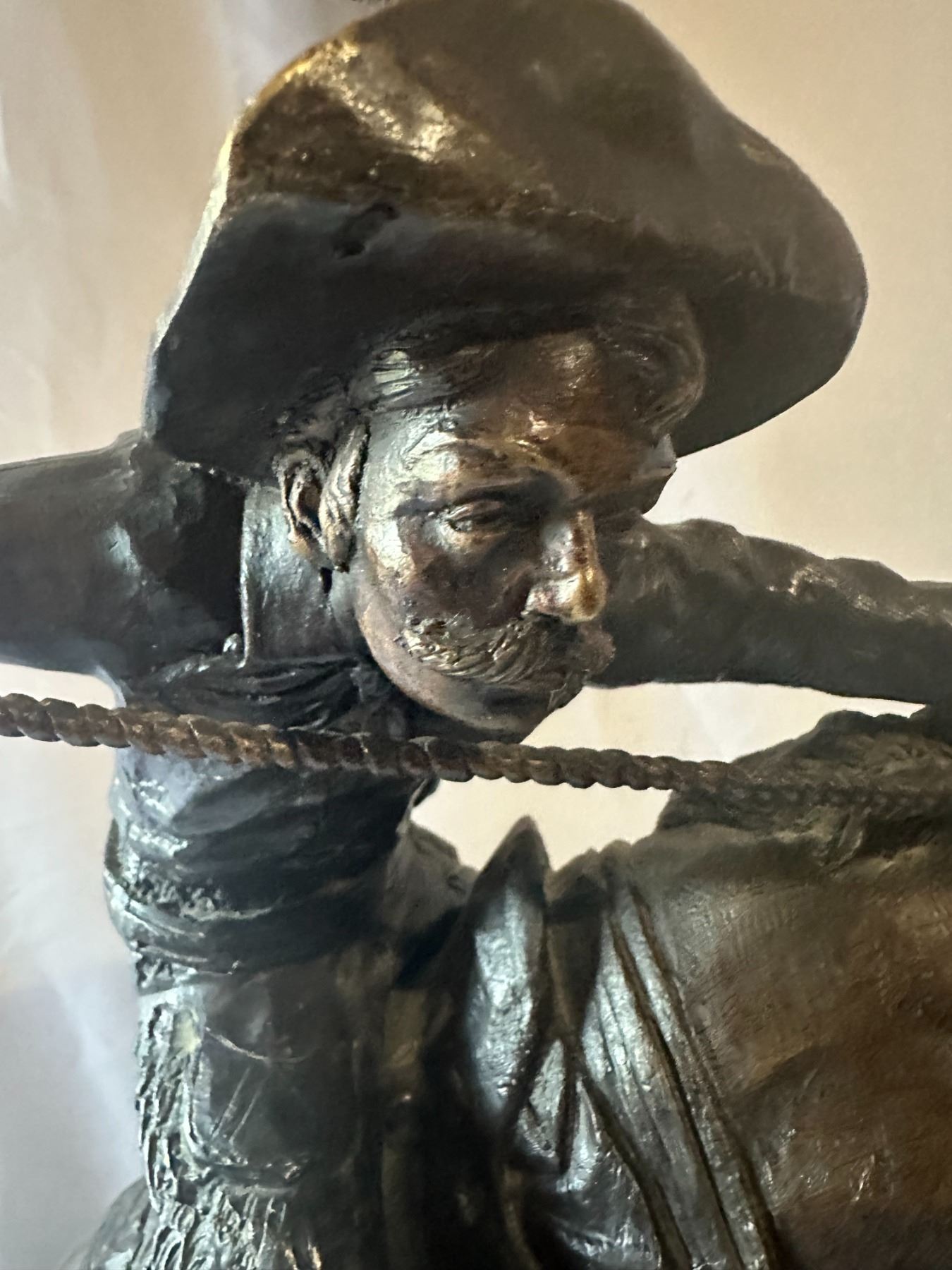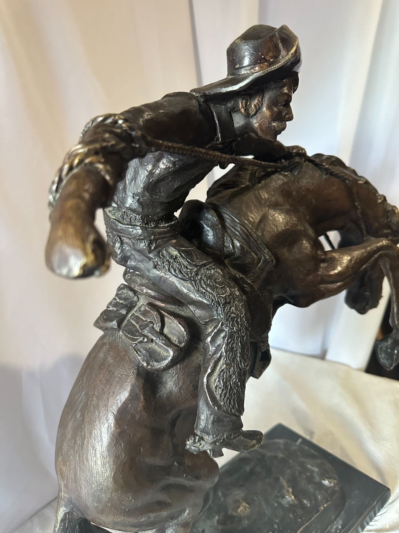 The sculpture's dimensional presence and sense of movement captivate viewers, inviting them to discover intricate details with each glance. Crafted using the esteemed Lost Wax Method, Wooly Chaps exemplifies Remington's dedication to his craft, with a stunning two-tone brown patina enhancing its exquisite features. Mounted on a sleek black marble base bearing Remington's signature, the sculpture exudes elegance while providing a stable foundation.