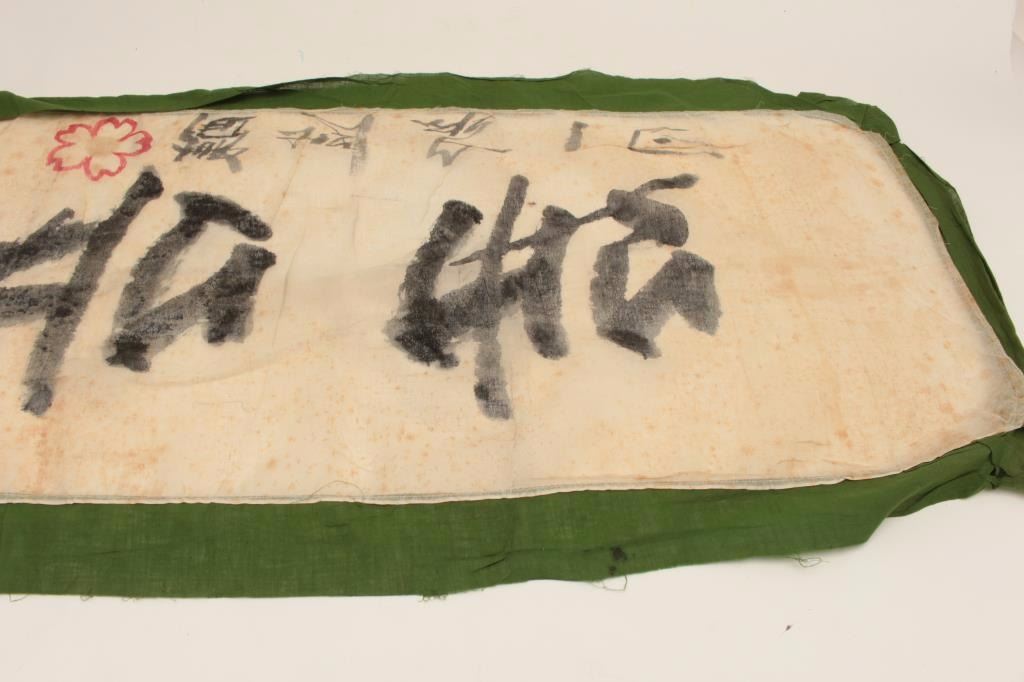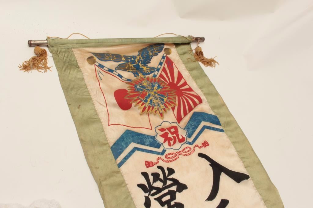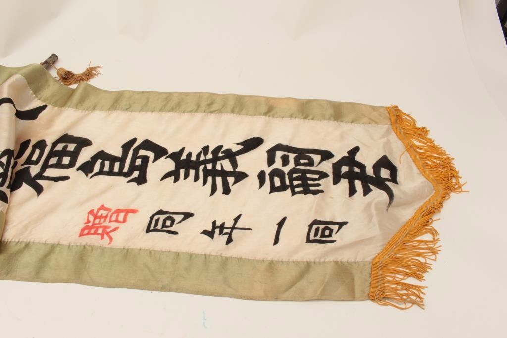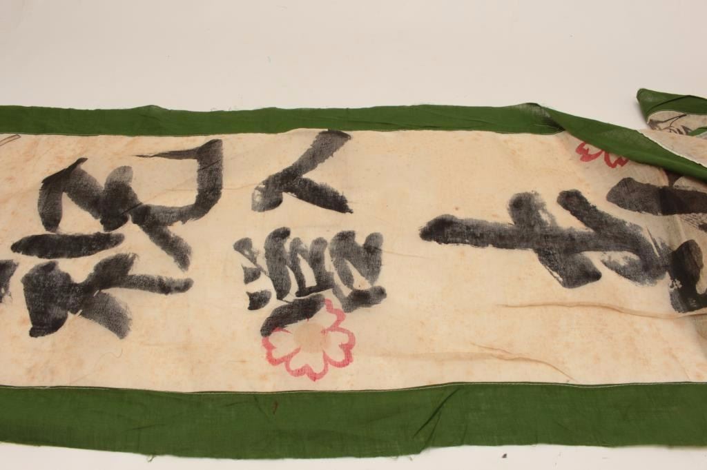 WW II Japanese banner with military motifs; approximately 10 feet overall. Est.: $100-$200.