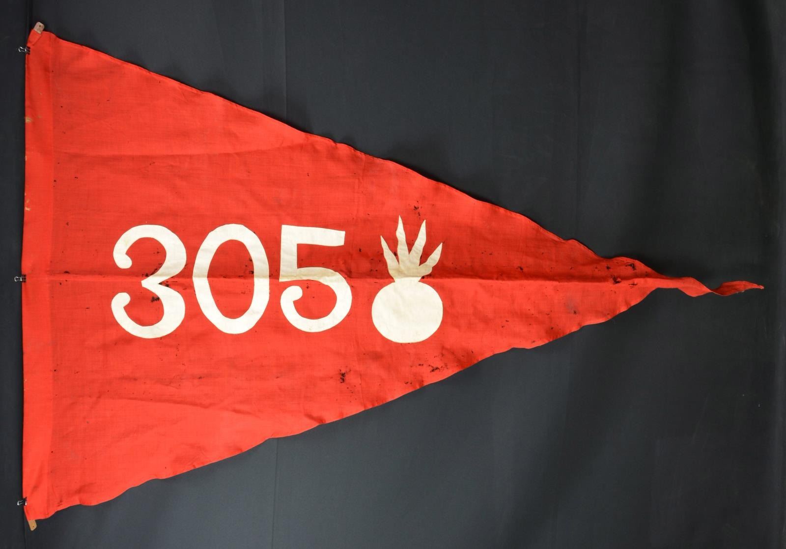 49" x 74" triangular bunting guidon, double applique unit markings & ordnance bomb insignia, Philadelphia May 5, 1917 dated inspection label. Unknown association to ordnance to 305th Field Artillery or 305th Infantry. Regardless, 1917 issued field guidon. CONDITION: very good, sound, good color, with moderate insect damage to wool bunting. (02-19473-43/JS). $200-300.