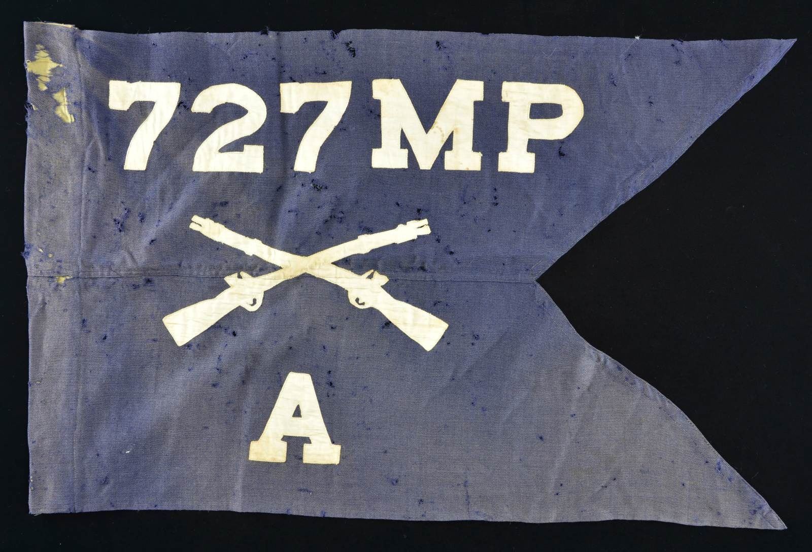 19" x 28" double applique white cotton on blue bunting field, crossed rifle insignia. Pre 1931 unknown regulation US military guidon with undated Philadelphia Quartermaster depot inspection label in sleeve. Military Police not founded till WW2 in US and their insignia is crossed pistols on green field. CONDITION: fair to good, scattered moth damage, light fading. (02-19473-47/JS). $100-200.