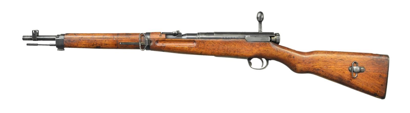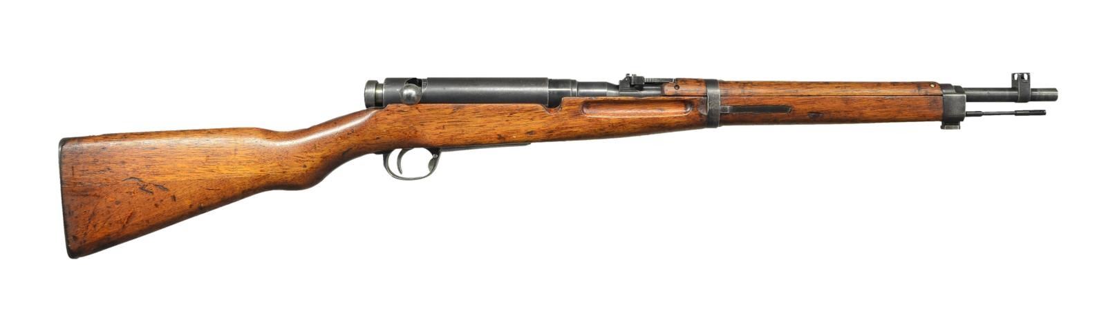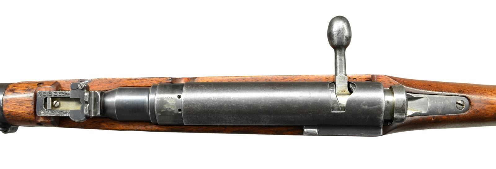 Cal. 6.5 Jap. S# 11465. Bbl. 19". Matching numbers on bolt, safety, bayonet lug & floorplate. Bolt release & rear sight numbered "755". Mismatched extractor & dust cover. Top of receiver has mostly ground mum & Type 38 markings. Left side of receiver has 4th series marking, serial number & Nagoya arsenal symbol. Short ladder rear sight graduated to 2000m. Inverted V blade front sight w/ protective ears. Two piece Asian hardwood stock w/ left side sling swivels. Replacement cleaning rod present. CONDITION: sanded stock set shows a thin long crack on handguard, scattered dings & handling marks. Metal retains 40% original blue w/ some touch up blue on top of receiver, some light oxidation & overall thinning. Good bore w/ a few small spots of pitting. (23-962/MJC). CURIO. $300-500.