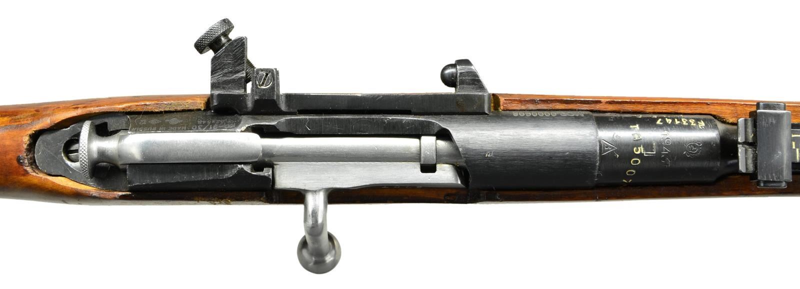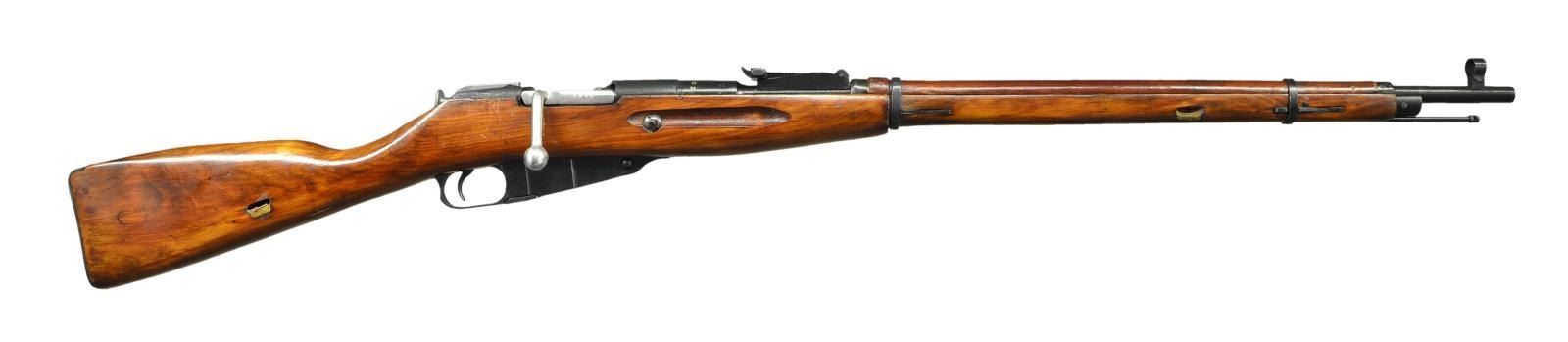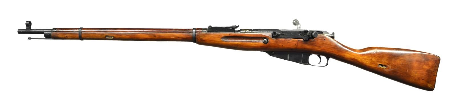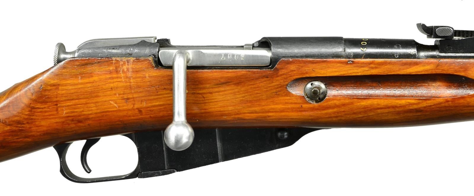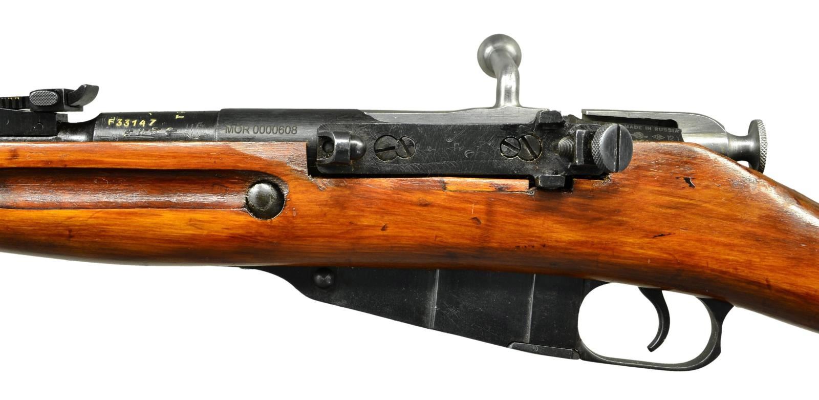 . Cal. 7.62x54R. S# MOR0000608. Bbl. 29" w/ IO import marking. All matching numbers as arsenal refurbished. This example appears to be an original wartime gun that was arsenal refurbished postwar. Top of bbl. has Izhevsk markings, serial number & 1943 date. Left side of receiver has a lined-out scope number & an undisturbed scope number. Left front of receiver has importer added serial number. Left rear of receiver has Molot import markings. Scope base is present on left side of receiver. No mount or scope are present. Hardwood wartime stock set w/ faint Soviet acceptance stamps. Cleaning rod present. CONDITION: arsenal reworked stock set has a small armorer splice repair near scope base, scattered light flaking & handling marks. Metal retains 95% arsenal rework blue w/ some handling marks & edge wear. Good bore w/ scattered cosmoline. (23-951/MJC). CURIO. $400-700.