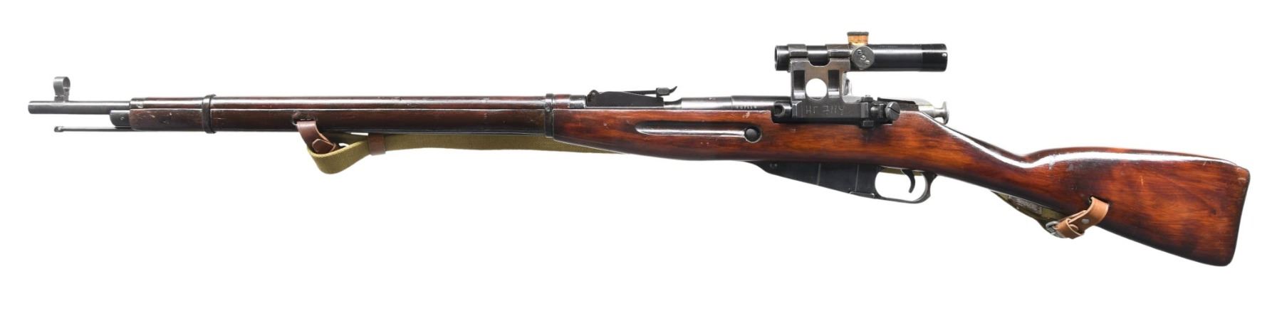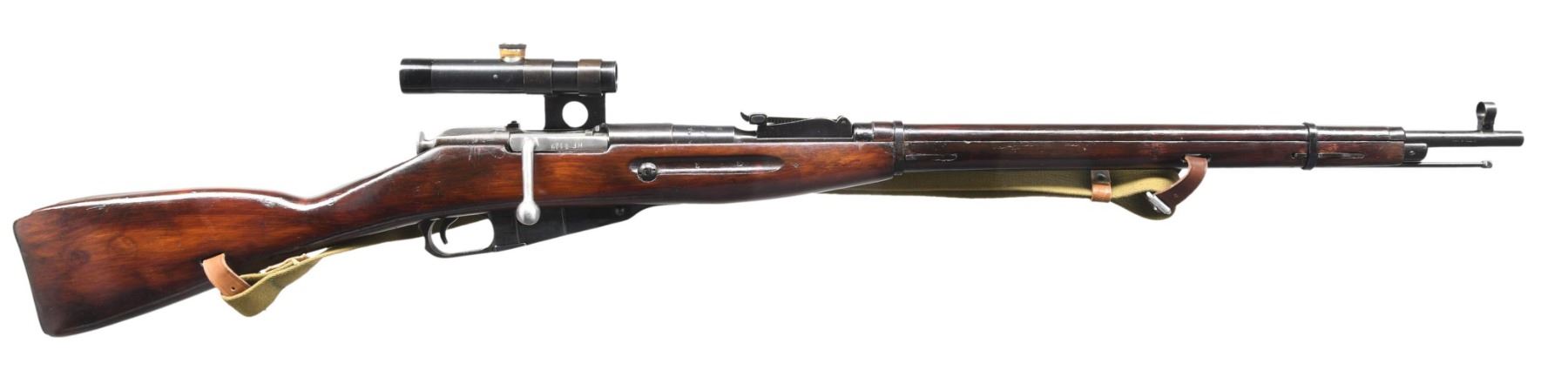 RIFLE. Cal. 7.62x54R. S# NG7114. Bbl. 29" with Century import marking. Post front sight with hood. Tangent rear sight graduated to 2000m. Rifle has an original undated Progress PU 3.5x power scope. Scope has a post reticle with dirty optics. Mount is original & is electropencil matching numbered to bbl. shank. It is this cataloger's opinion that this rifle is indeed a legitimate Soviet PU sniper rifle. There is no bbl. shank scope number but it may have been arsenal scrubbed. Bbl. shank has 1943 date, Izhevsk marking, serial number & importer translated prefix. Left side of receiver has importer added serial number. All matching numbers with floorplate number being lined out to match. Arsenal reworked blue finish. Hardwood stock set with wartime sling slots & canvas sling. Right side of stock has faint Izhevsk roundel. Cleaning rod present. UNATTACHED ACCESSORIES: scope covers. CONDITION: stock set has arsenal rework finish with scattered dings & handling wear. Metal retains 97% arsenal rework blue with some edge & handling wear. Action functions properly when hand cycled. Bright very good bore with some light frosting. PROVENANCE: from the collection of Mark Ivey Godfrey. (24-5248/MJC). CURIO. $800-1,200.