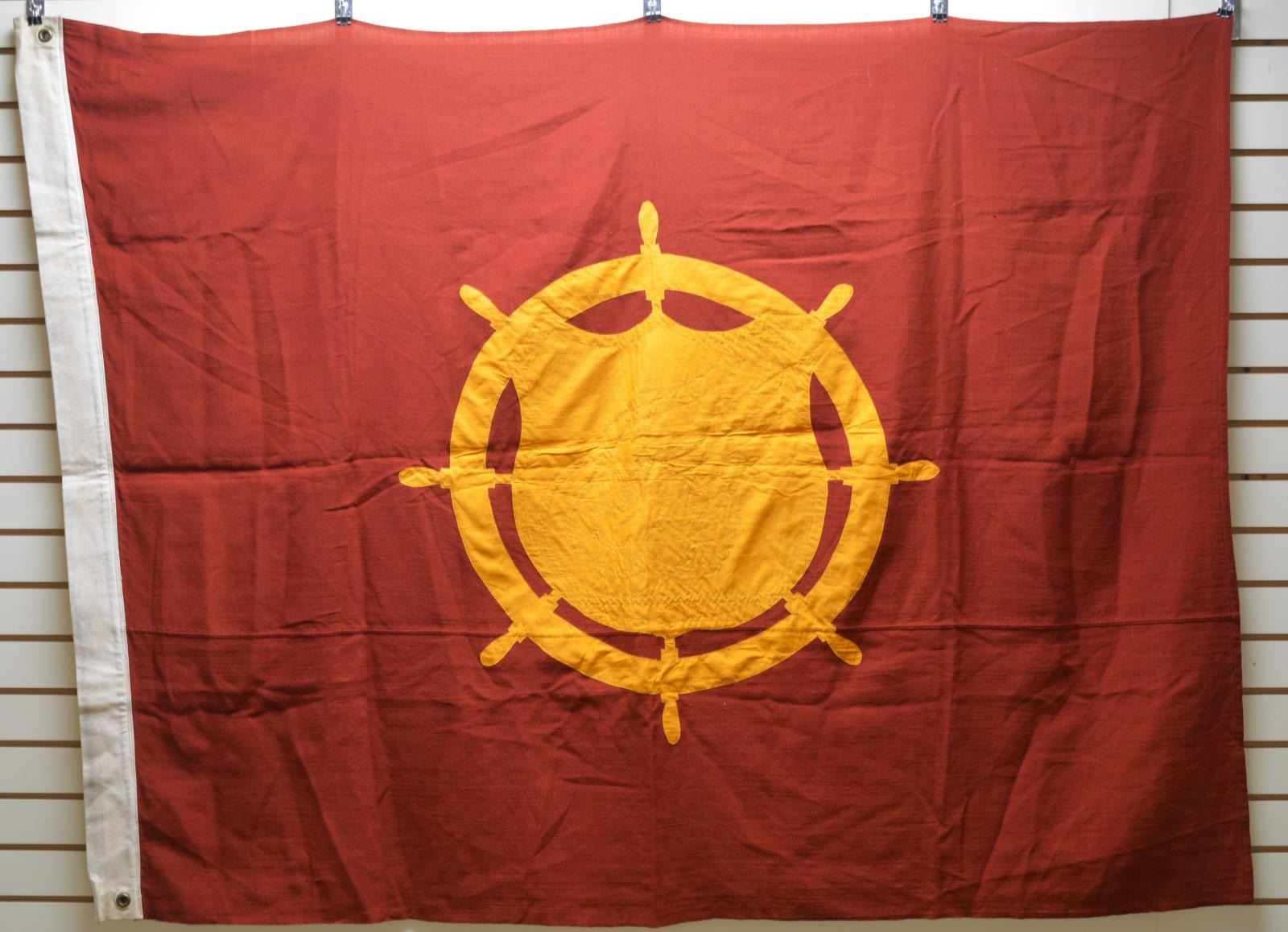 34” x 60” bunting & cotton, 3” hoist with 2 brass grommets, stamped with Philadelphia Quartermaster Depot, dated May 7, 1939. What would become the Army Transport Service had its beginnings in the Quartermaster Corps. The service would remain under the auspices of the Quartermaster Corps until 1943 when it was spun off into its own branch. The Transportation Corps supervised the shipping of Army personnel and supplies overseas which began during the Spanish American War of the late 1890s. patents were issued William F. Costen for the design and making of seven flags for Army transports. These flags were patented in August 1899. Mr. Costen reported their description at the time, "Opposite corners, the upper one the nearer to the staff, are right-angled triangles of red and blue respectively, and the remainder, a diagonal strip between the triangles, is white. In the white field is a wheel crossed by a sword and a key and surmounted by an eagle. Thirteen stars adorn the rim of the wheel, and the letters “U.S.A.T.S." encircle the design." The aforementioned “wheel” was blue as were the letters. Costen’s design would serve through 1943 with some minor alterations (dropping the lettering). Small variants of this flag, in pennant shape, were used on smaller boats, harbor craft and on the vehicles of Motor Transport units. From 1943 onward, the central device was altered to a red with the wheel being changed to one that would appear on the bridge of a ship (with handles). The stars therein were removed. Inside the wheel was a central device of a tire bearing wings, which were in white. This change took place when the Transportation Service was spun off into its own entity. This flag was only in service till 1943 and is a boat flag, its single use on a ship. The flag is flown from sunrise to sunset on the forwardmost mast, or on the outboard halyard of the port yardarm if there is a single mast. Shipboard courtesies and customs, including the use of flags, are laid down for Army vessels in Field Manual 55-501, Marine Crewman's Handbook. CONDITION: fine overall (02-17547-49/JS). $100-200.