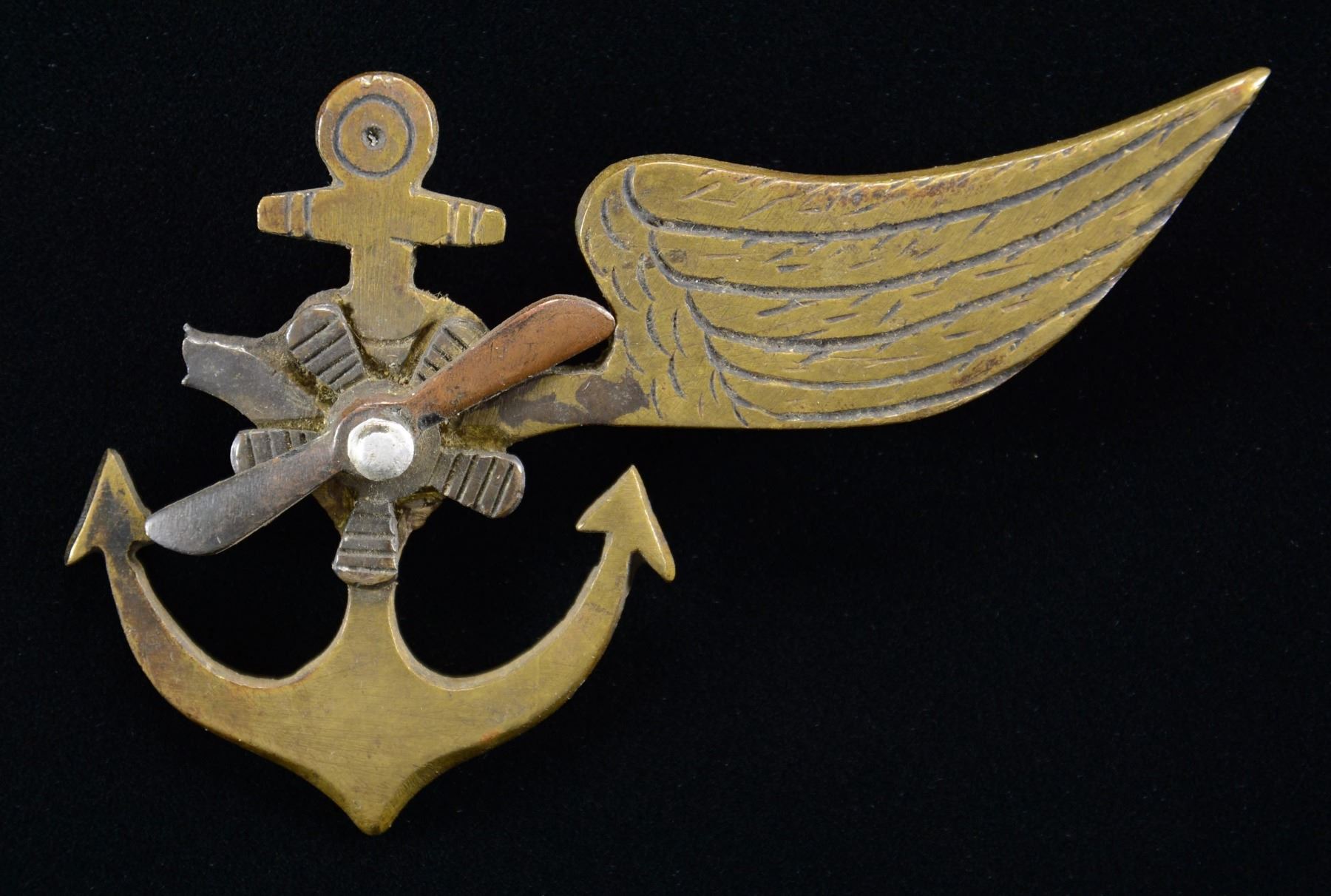 This early handmade badge has a trench art look about it and measures approx. 3" x 1 7/8". The badge appears to be brass with a copper propeller and depicts a large anchor with a single hand-engraved bird’s wing on the right side. The left side wing has been broken off and is missing. There is a propeller assembly in the center of the anchor. The rear of the badge has a single iron screw with bolt. The missing wing would have had a second bolt for attachment. CONDITION: badge generally shows light wear and has a pleasing, deep tarnish. As stated, one wing is missing. (02-22999/BF). $100-300.