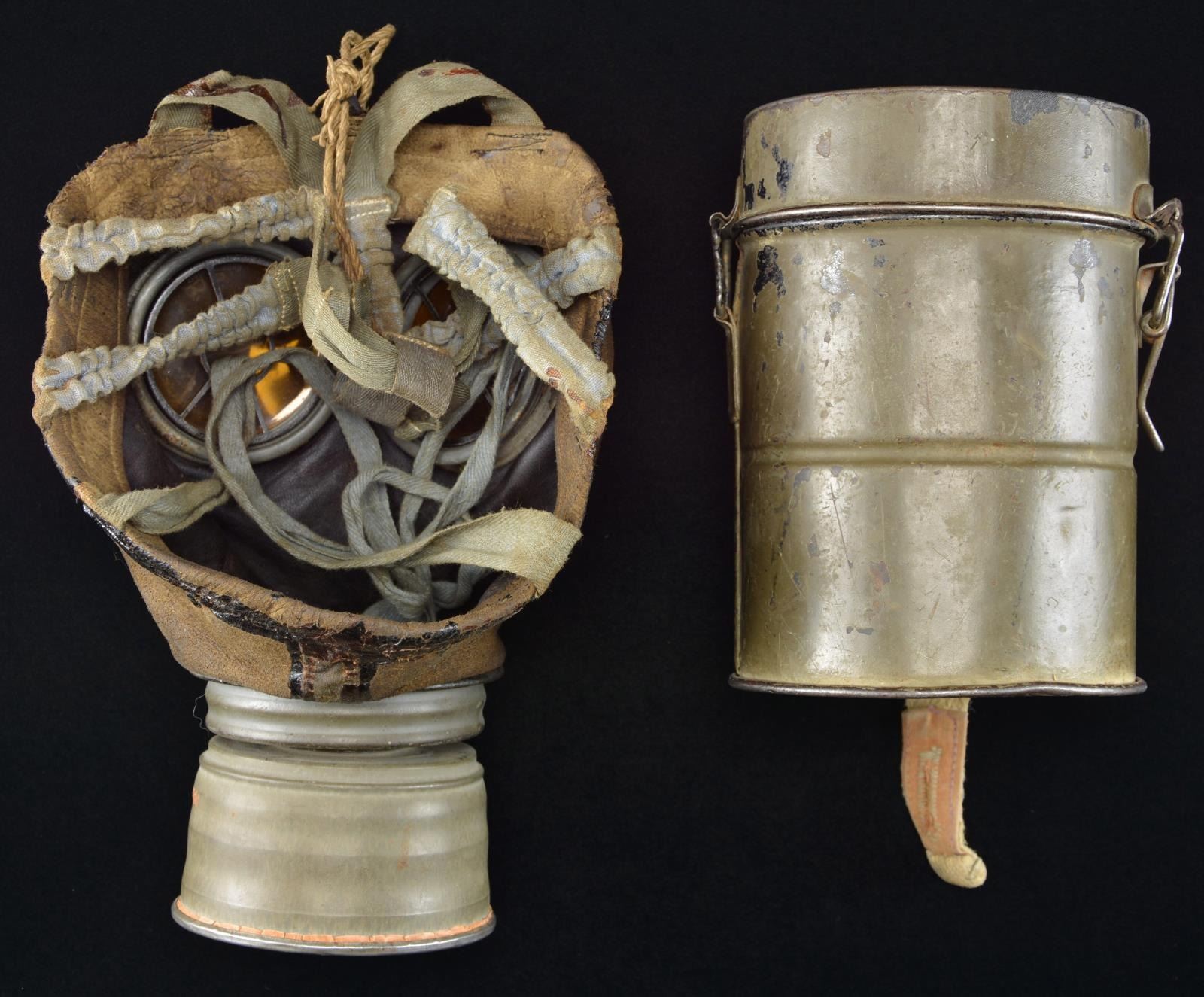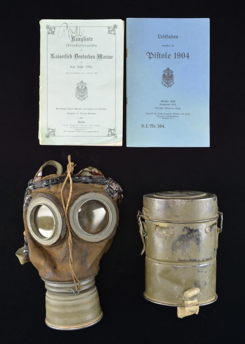1) GAS MASK. This is a German M1917 gas mask with the original canister attached and all straps/ties intact. The mask also comes with its original canister-shaped container in dark field green paint. CONDITION: the gas mask shows moderate wear, but does appear complete. The canister has wear to the painted finish, but does operate correctly. 2) BOOK. A paperback book titled “Rangliste der Kaiserlich Deutschen Marine fur das Jahr 1916”, which translates to “Ranking list of the Imperial German Navy for 1916”. CONDITION: front cover is detached but present, and the edges are a bit worn. 3) PAMPHLET. A blue paper covered pamphlet titled “Leitfaden betreffend die Pistole 1904”, which translates to “Guide to the 1904 Pistol”. The pamphlet was published in Berlin in 1906. CONDITION: light wear overall. PROVENANCE: From the Lifelong Collection of Glen E. Mattox. (02-18937/BF). $250-400.