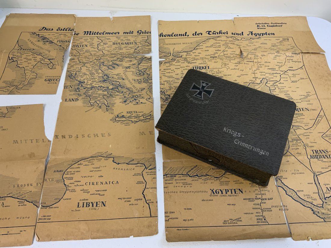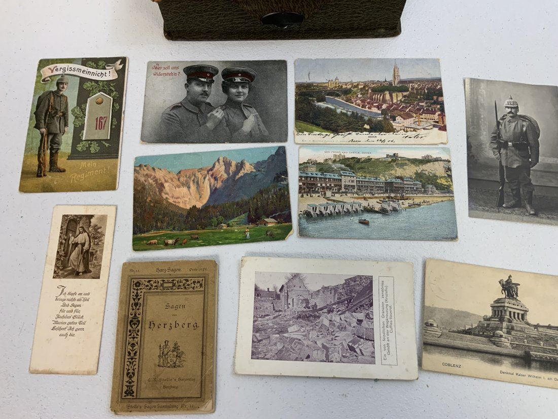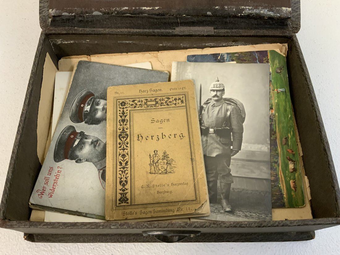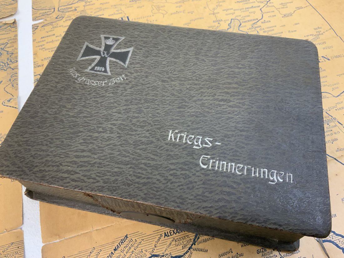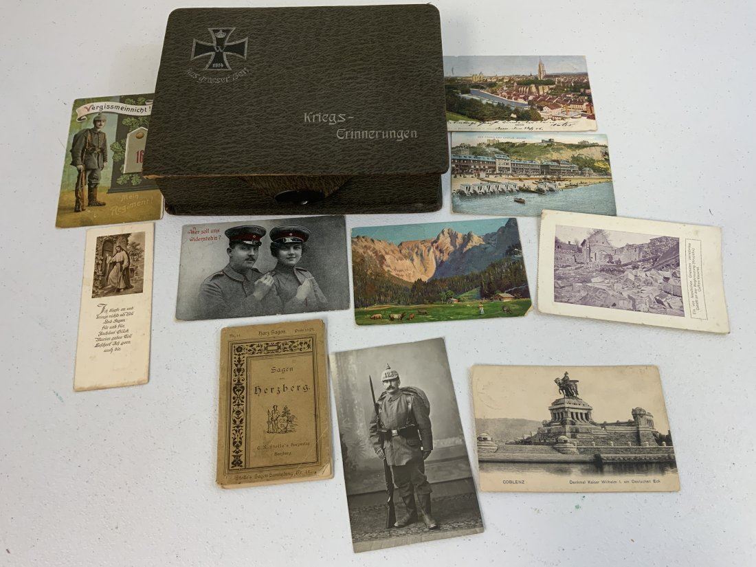 WWI GERMAN POSTCARD LOT INSIDE THE BOX WITH IRON CROSS 1914 ON THE LID. NICE GROUP OF POSTCARD AND SONG BOOK ALONG WITH OLD MAP . BOX IN IN REALLY NICE CONDITION 9 1/2 X 7 X 2 1/2 . INTERESTING POSTCARDS MOSTLY USED AND MAILED . OLD MAP 34 X 24 SIZE THAT IS TORN . NICE LOT.