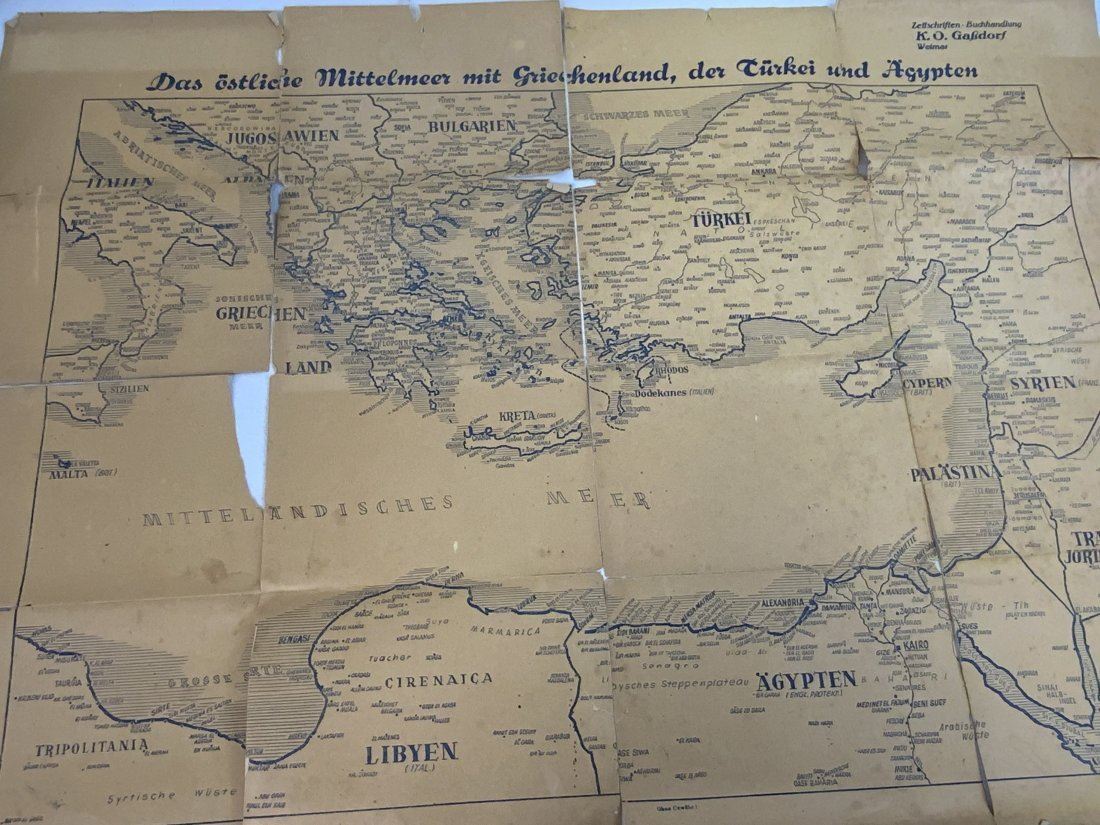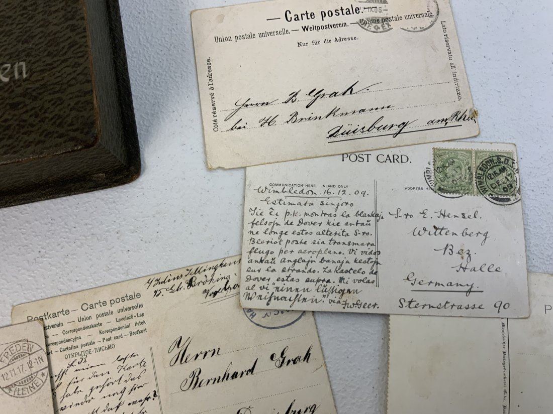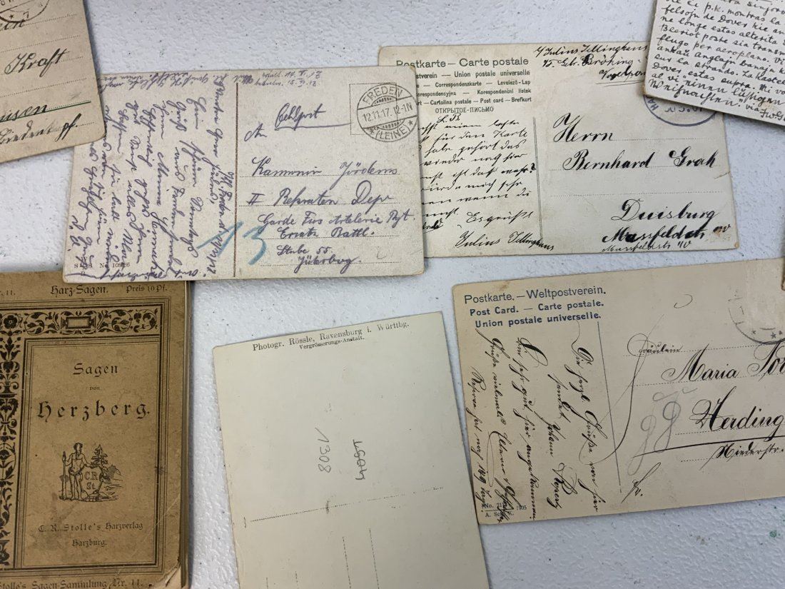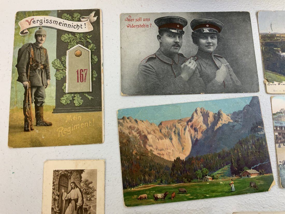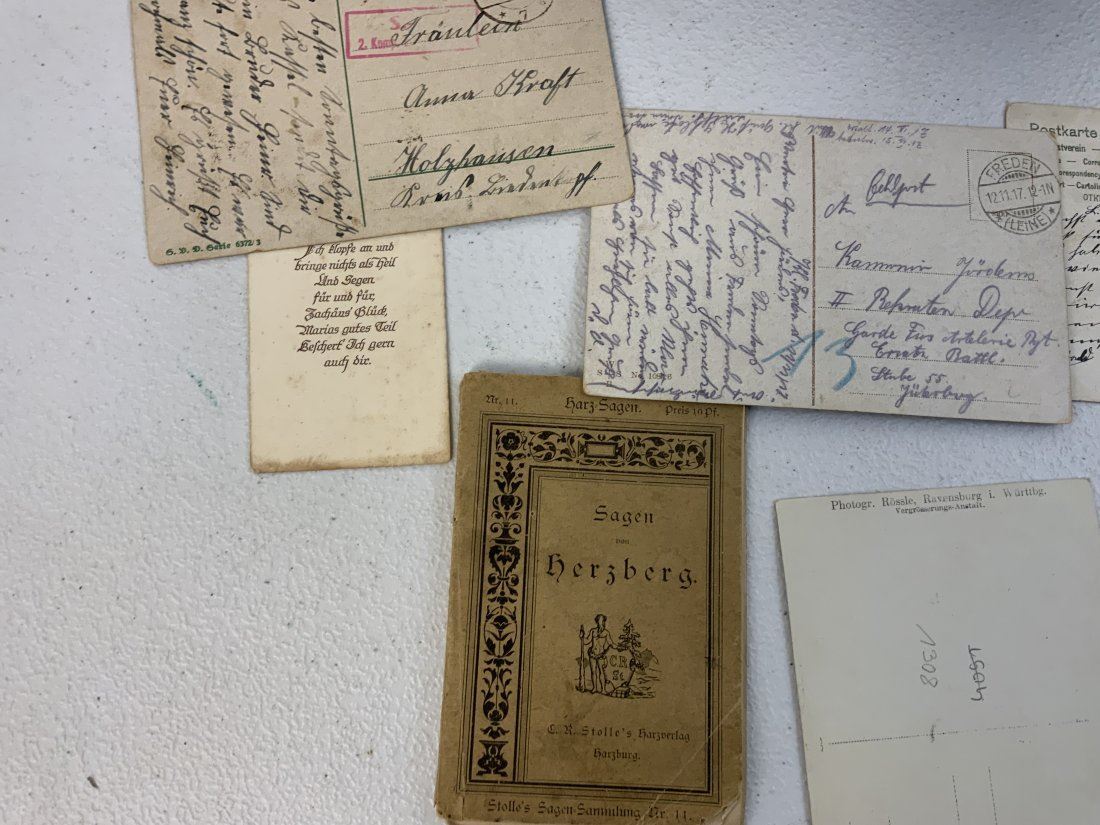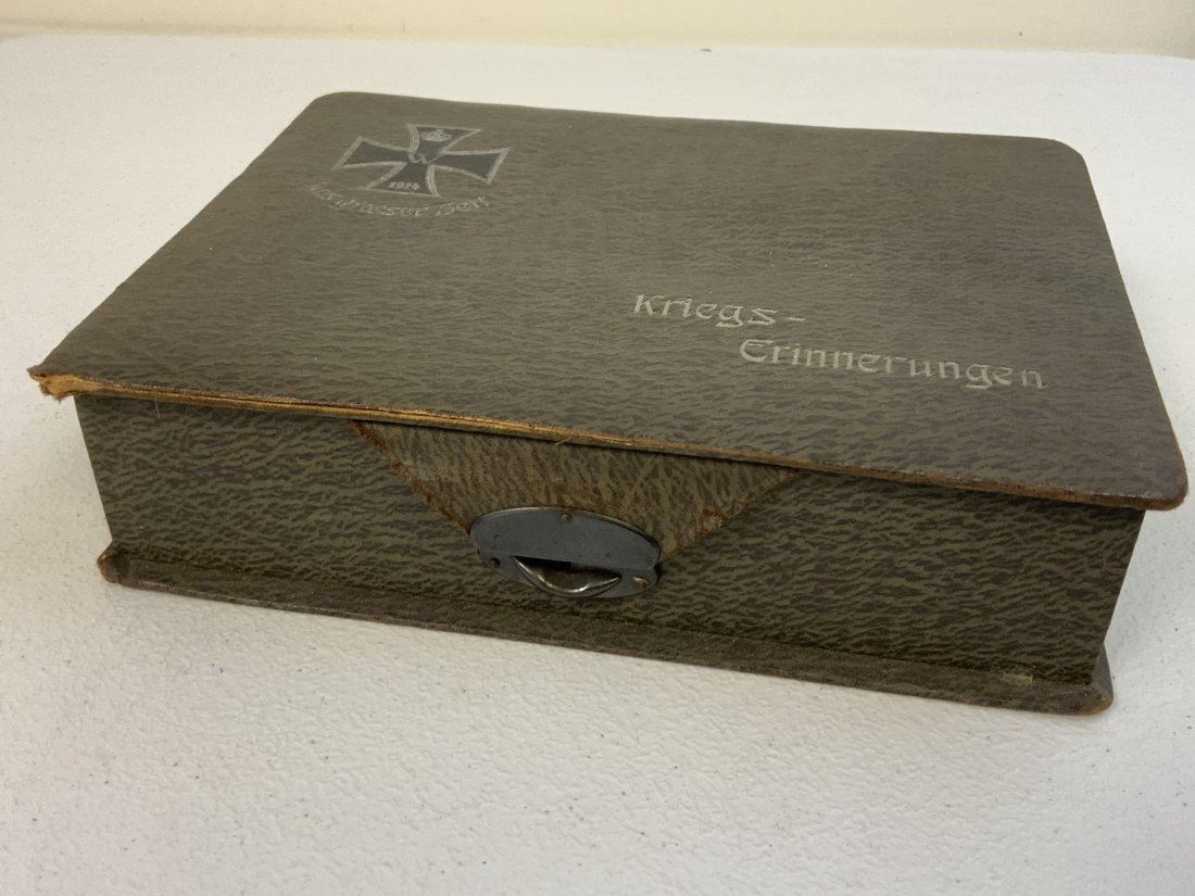 WWI GERMAN POSTCARD LOT INSIDE THE BOX WITH IRON CROSS 1914 ON THE LID. NICE GROUP OF POSTCARD AND SONG BOOK ALONG WITH OLD MAP . BOX IN IN REALLY NICE CONDITION 9 1/2 X 7 X 2 1/2 . INTERESTING POSTCARDS MOSTLY USED AND MAILED . OLD MAP 34 X 24 SIZE THAT IS TORN . NICE LOT.