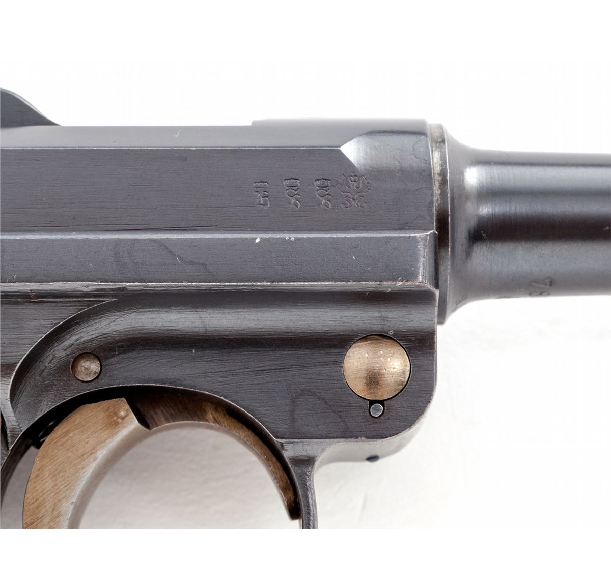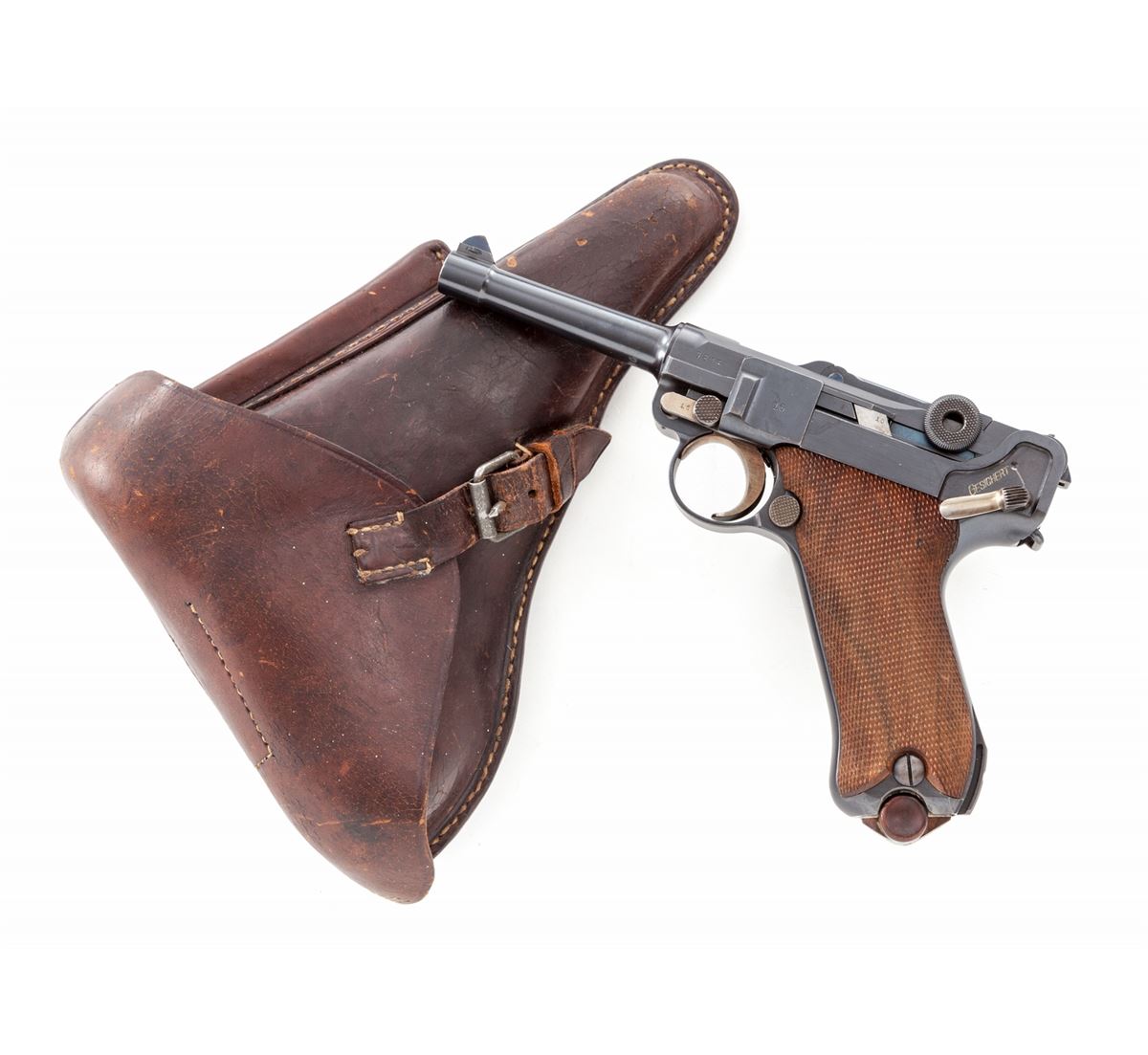 WWI German P.08 Luger, #7816h, 9mm, 4'' barrel, blue finish with straw small parts, factory checkered walnut grip, with two (2) matching numbered tin-plated magazines with wooden bases. In brown leather 1915 dated holster by Otto Sindel (Berlin). Chamber marked 1915, toggle marked DWM, ''Gesichert'' marked safety, extractor marked ''Geladen''. Included is a reprint of the 1920s ''The Paraballum Automatic Pistol'' manual. Condition is excellent retaining approx. 98%+ original rust blue with slight thinning to highpoint of sideplate. Straw parts show only the lightest thinning at high edges. Grips remain crisp; nitre blue grip screws show even wear with approx. 50% remaining to right side. Action is crisp, bore is mirror bright. Holster with light even crazing and some small flecks of finish losses to exterior. As nice a standard WWI P.08 Luger as you'll see. Est.: $1,800-$2,400. (C&R/PPT)