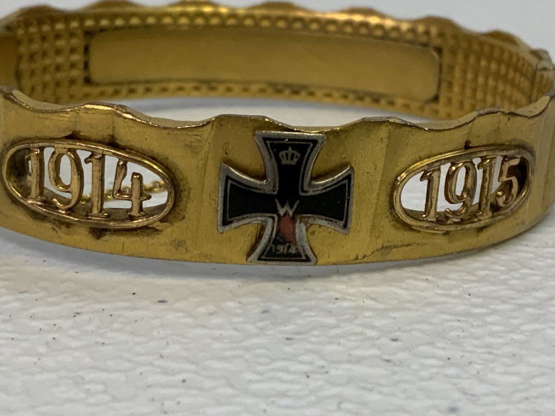 WWI IMPERIAL GERMANY 1914-15 GERMAN PATRIOTIC BRACELET .OUTSTANDING QUALITY MADE FROM BRASS PIECE OF AMMUNITION COLLAR AND GILDED. ENAMELED IRON CROSS 1914 AND CUT OUT DATED 1914 AND 1915. BEAUTIFUL HIGH QUALITY PIECE.