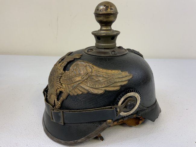 WWI PRUSSIAN IMPERIAL GERMAN ARTILLERY GUARD PICKELHAUBE BALL TOP HELMET . GREAT CONDITION FOR ITS AGE. COMPLETE WITH LINER. REMOVABLE BALL TOP. GUARD FRONT PLATE. DAMAGE TO A BACK LEATHER VISOR. RARE.