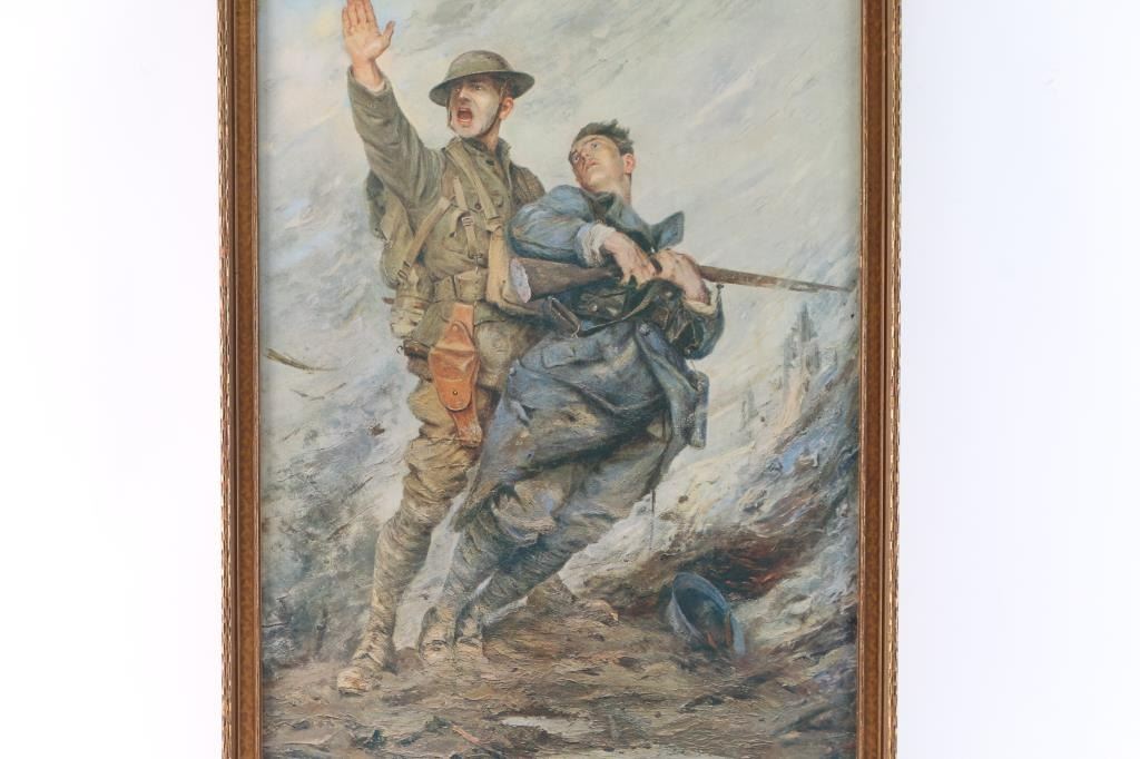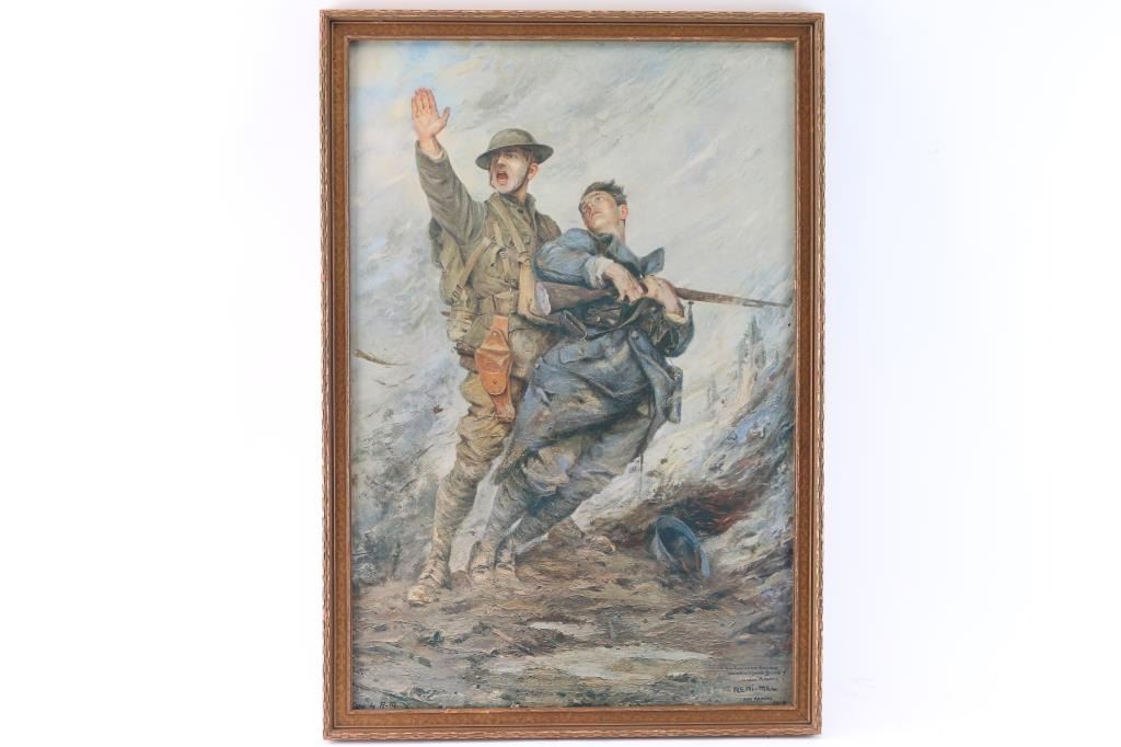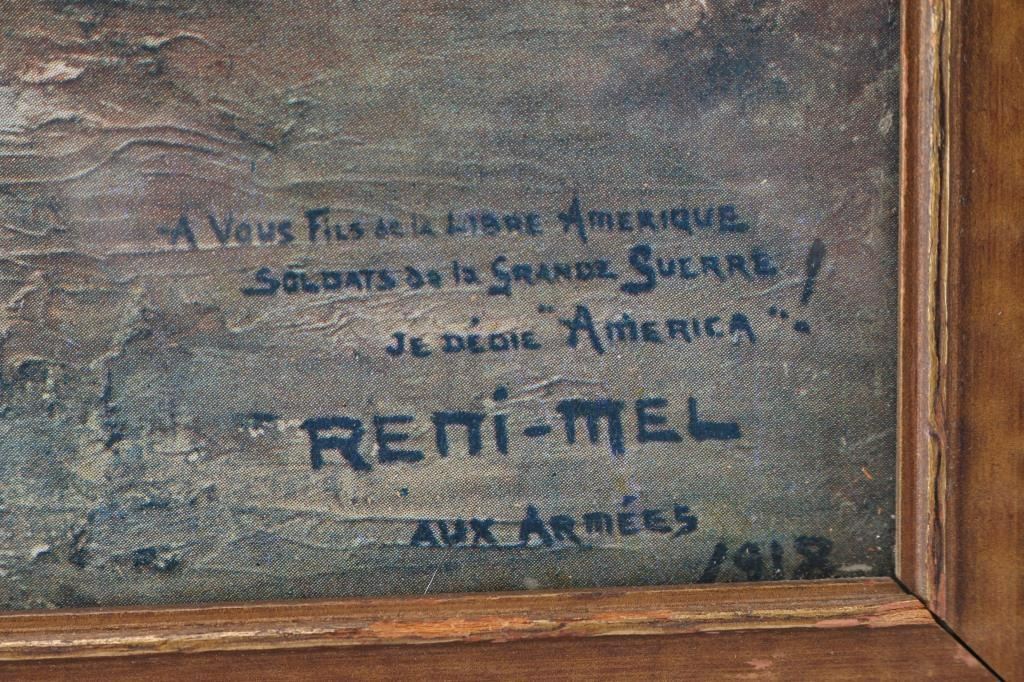 historic print released in 1922 of the painting "America by the painter Leon Reni-Mel.This print would be beautiful framed and has great emotion and historical significance. . The print is approximately 23" by 15". "The painting, "America" was created in 1918 by the French Ministry of War Painter, Léon Reni-Mel, and given to the American Legion for the United States’ assistance to France during the Great World War. Depicts two allegorical soldiers, one stalwart American raising his hand to halt the enemy while assisting the other, a wounded Frenchman about to collapse. The soldiers stand on a bank of highly textured mud with smoke and flames rising around them in the distance, blending slowly into the swirling colors of the sky. At the bottom of the print , Reni-Mel gave the work its own caption, AMERICA,.In copper colored frame.