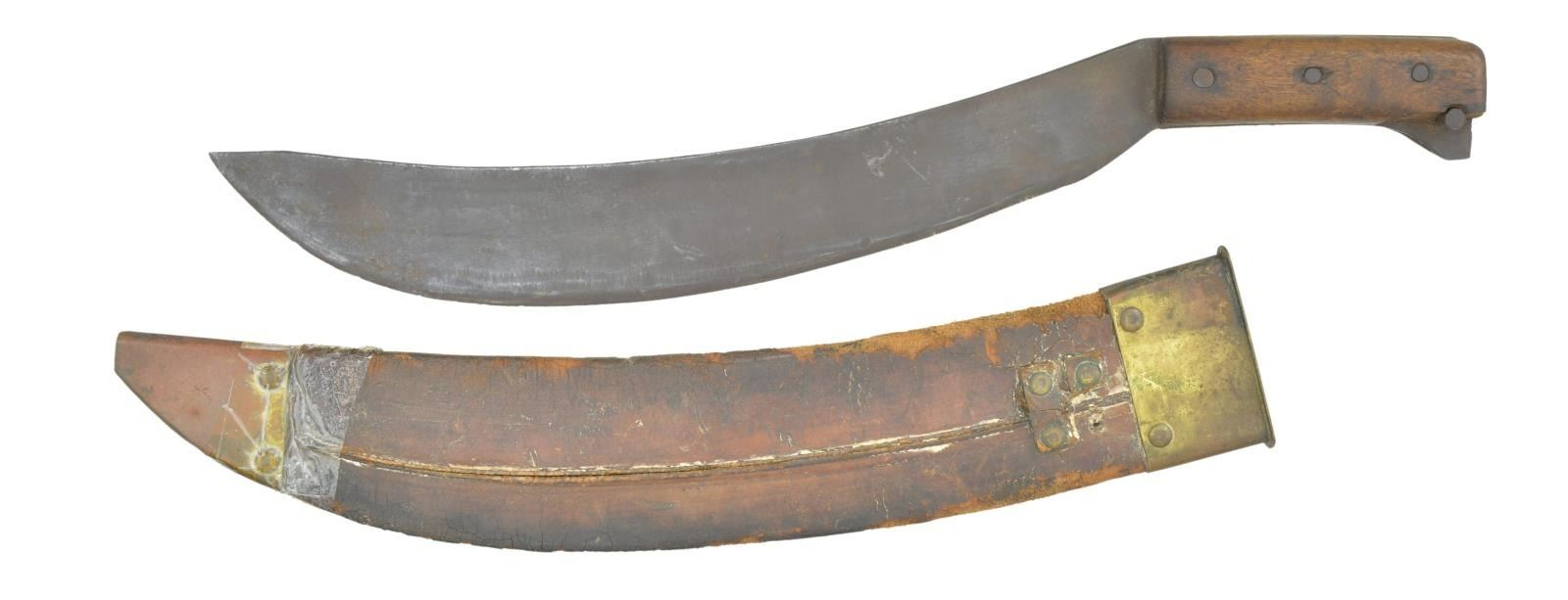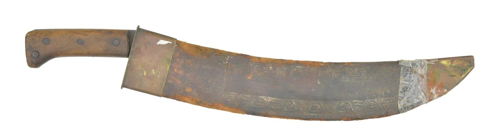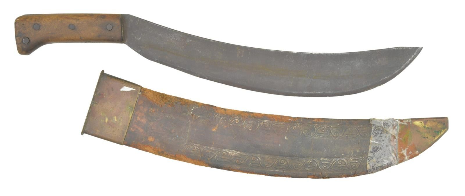 MACHETTE & SCABBARD. Overall: 19 7/8". Blade 15" heavily curved. 2 Piece wood grips w/ rivets. Brown leather tooled sheath. CONDITION: metal in fair condition showing heavy sharpening of edge, dark patina & pitting; markings are somewhat obscured. Left panel is missing piece at tip, grips have fair worn finish. Poor scabbard w/ flaking leather, tears at seam & sides, tape repair at tip & missing rivet. (02-19286/MD). $200-300.