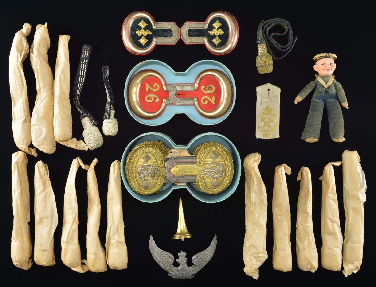 This fine group consists of 1 boxed pair of Imperial German epaulettes for a Naval officer. Each paddle has a chained fouled anchor with one pip on either side. / 1 Pair of Imperial German epaulettes for a medical officer. Each dark green paddle has a serpent on pole with one pip on either side. / 1 Pair of Imperial German epaulettes for an officer in the 26th Artillery Regiment. Each red paddle has a large number “26” attached. / 1 WWI gray metal eagle front plate likely for a Prussian Reserve enlisted man. / 1 Top portion of an officer’s fluted spike. / 1 Well-used WWI sword knot in rough condition. / 1 Shoulder strap for a member of the 3rd See Batallion with moth damage. / 1 WWI era German doll wearing an enlisted sailor’s uniform. / 14 Unissued WWI or WWII German sword knots with black leather & silver bullion straps atop a silver bullion knot. CONDITION: sword knots are unissued. All other items show light wear, except as noted above. PROVENANCE: From the Lifelong Collection of Glen E. Mattox. (02-18936/BF). $700-1,000.