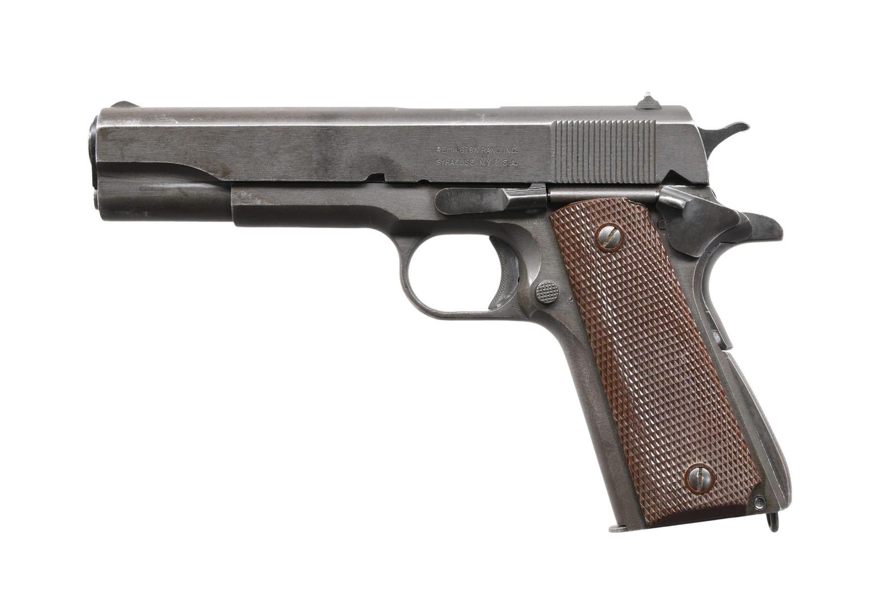 PISTOL. Cal. 45 ACP. S# 1329046. This pistol was mfg. within S# range 1279699-1441430. Appears to have all correct parts including High Standard 5" barrel & Type 10 Keyes Fiber grips. MAGS: 1 two tone 7 rd. mag. with large areas of oxidation. CONDITION: this pistol has large coverage of very good original finish showing cycling wear on edges along with contact points on slide & frame. Very good grips with some flattened edges. Bore shows oxidation & residue along with strong rifling. (24-5136/MD). CURIO. $1,750-2,500.