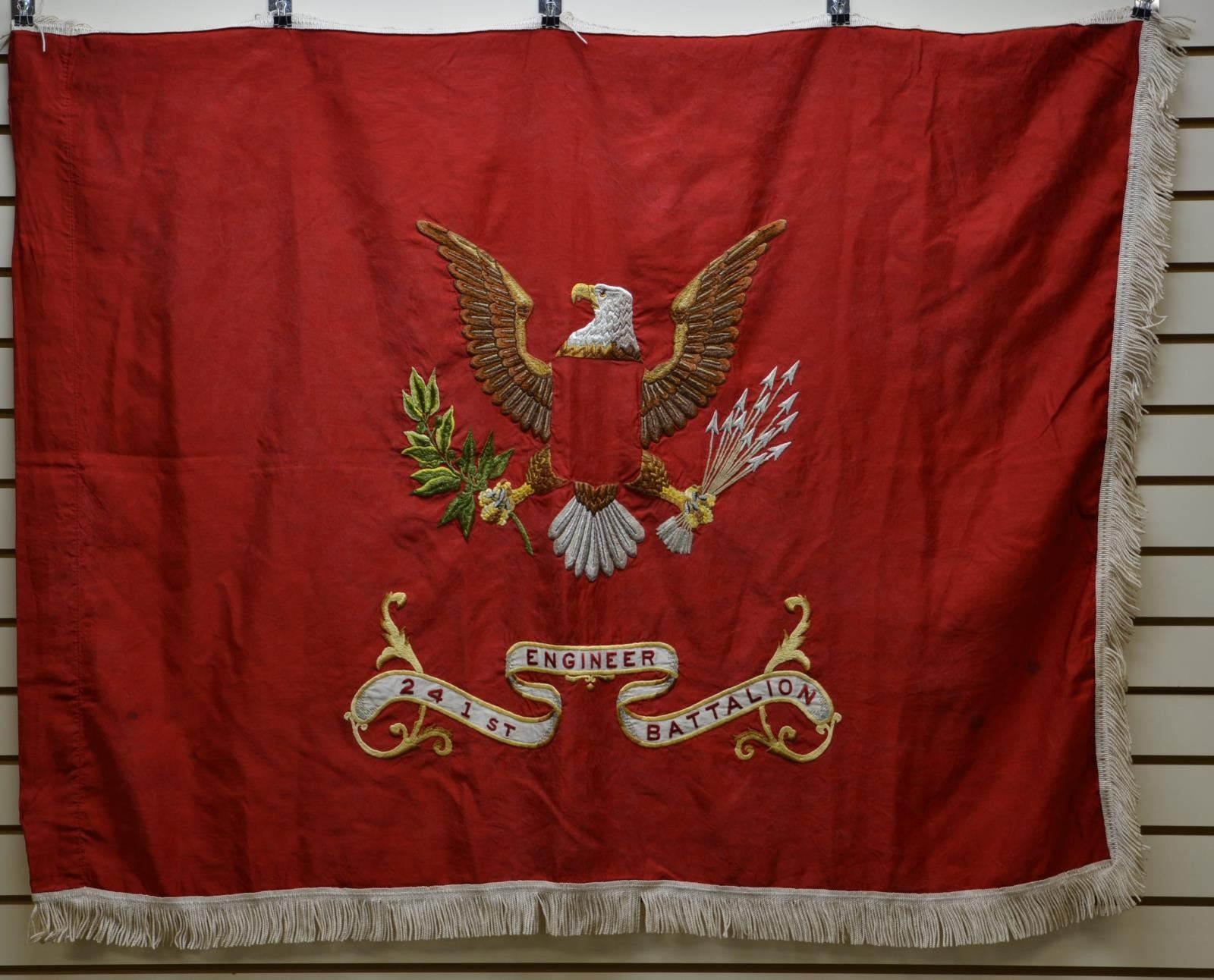 3’ x 4’ double applique embroidered on scarlet red field, traditional color for engineers since 1872. Philadelphia Quartermaster label is dated June 15, 1944. This command had its beginnings with the 31st Engineer Battalion, which itself began as the 31st Engineer Company that was activated at Fort Belvoir, Virginia on July 1, 1940. The unit was soon expanded and in December 1941 it was redesignated as the 31st Engineer Combat battalion. However, in April 1942, the designation was again changed after some reorganization to the 1st Battalion, 31st Engineers (Combat) and then in August it was reflagged as the 31st Engineer Combat Regiment. In March 1943, the regiment was broken up with its component units being redesignated as: 1st Battalion becoming the 31st Combat Engineer Battalion; the Headquarters and Headquarters and Headquarters and Service company as the Headquarters and Headquarters Company, 1114th Engineer Combat Group; and the 2nd Battalion became the 241st Engineer Combat Battalion. This flag should date 1943-1945. In early June 1944, the 241st reorganized at Fort Belvoir (location of the Engineer School) and was then assigned to the Military District of Washington. In October, the unit was sent to Fort Jackson in South Carolina for its new home post becoming part of the Second Army, XXIII Corps. Finally, in May 1945, the unit was sent to Boston for shipment to Europe but with the notice of German surrender those orders were canceled. Instead, the battalion was sent to San Francisco for shipment to the Pacific Theater leaving there in late June 1945 and arriving at Manila in the Philippines in late July. Upon arrival they became part of the Sixth Army. With the war with Japan ending in August, the unit was no longer needed, and they were deactivated on December 29, 1945. CONDITION: very good to fine, staining (02-17547-16/JS). $100-200.