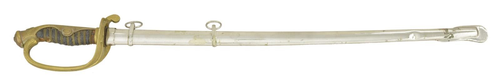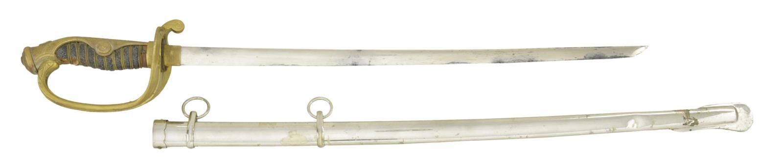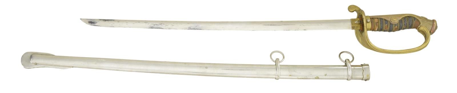 This diminutive saber measures 27 3/4" overall with an 18 1/2" blade. There is a faux irregular hamon at the ha and a brass habaki. The gilded brass hilt resembles an Army Parade saber with small 10-petal cherry blossoms. Wire-wrapped sharkskin grip. Plated saya. CONDITION: blade has some spots of discoloration. Hilt retains traces of original gilding. Grip is 80% complete, and wire is 100%. Saya has a few scattered dents & a small loss of plating near the drag. PROVENANCE: From the Lifelong Collection of Glen E. Mattox. (02-18434/BF). $200-400.
