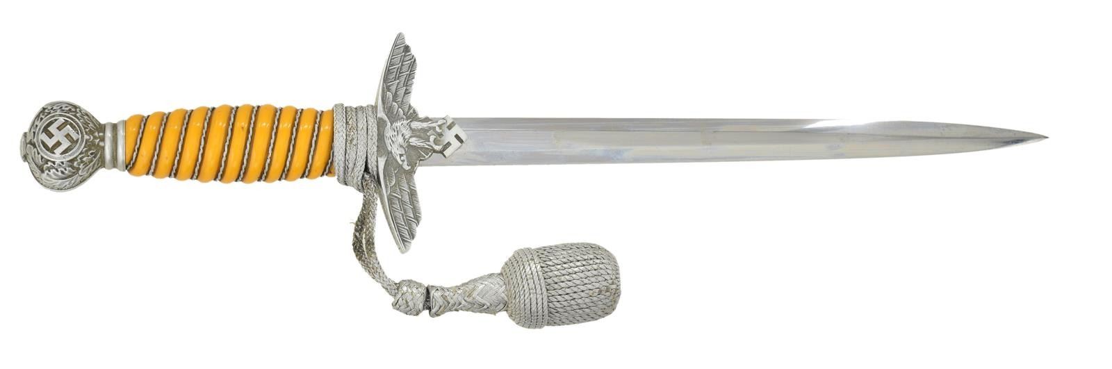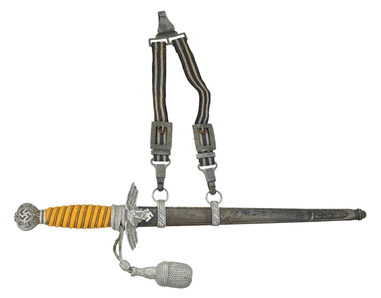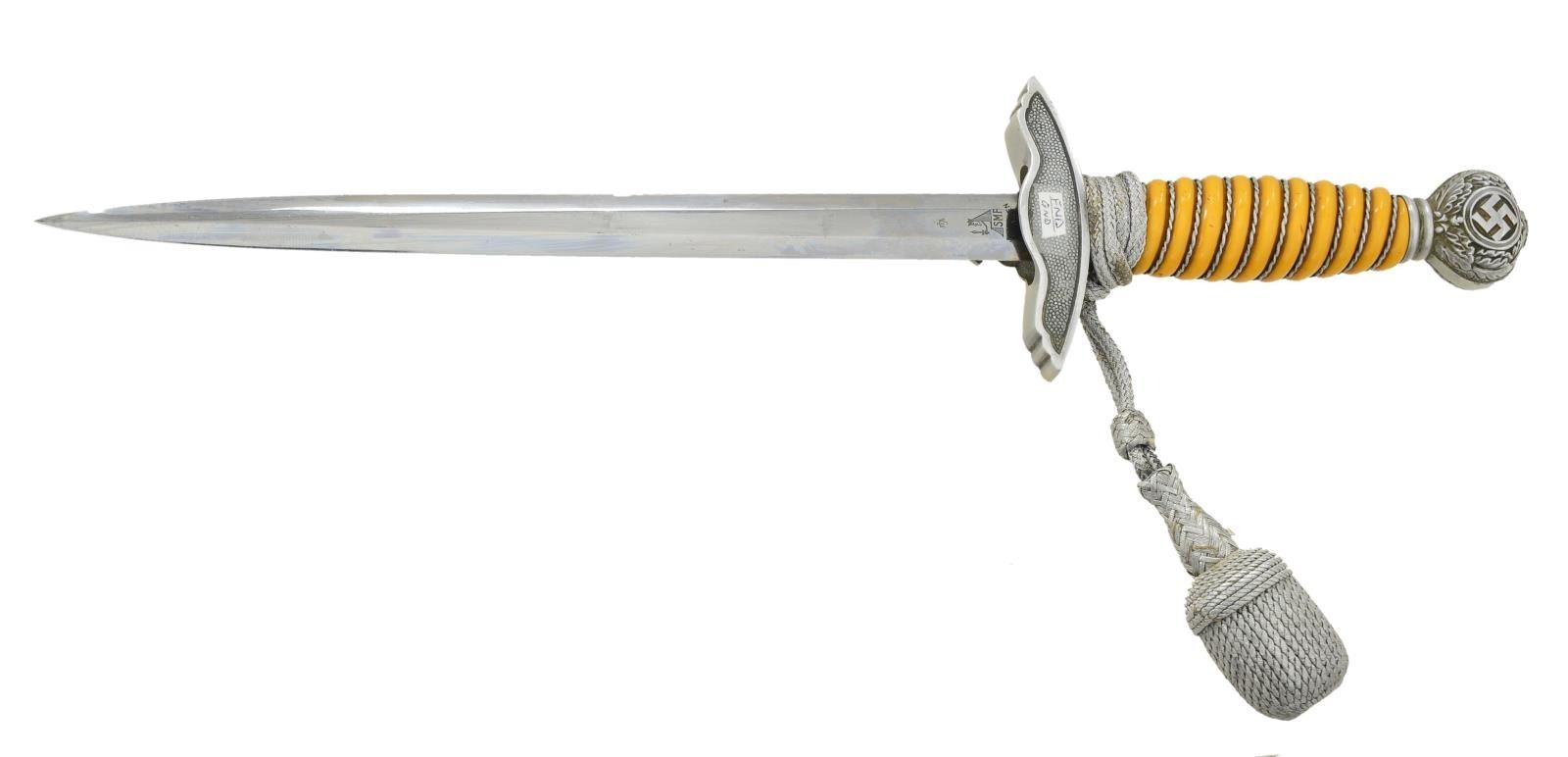 Overall length 16 7/8". Plain blade is marked on the reverse “(king) SMF SOLINGEN”. The blade is also marked with a waffenamt and “5”. Aluminum cross guard & pommel. Aluminum wire wrapped orange composite grip. Correct knot it included. Plated scabbard with original hangers. CONDITION: blade shows light scabbard wear. Mounts show light wear overall. Grip is undamaged. Knot shows moderate wear. Scabbard has approx. 30% original finish. Hangers show light wear. PROVENANCE: From the Lifelong Collection of Glen E. Mattox. (02-18213/BF). $450-650.