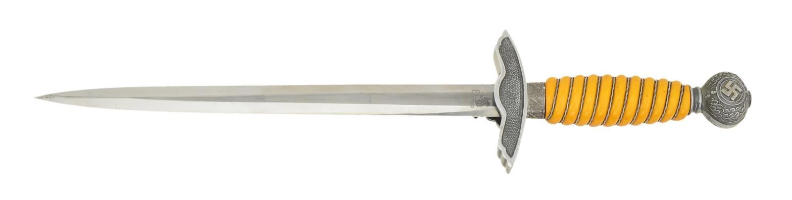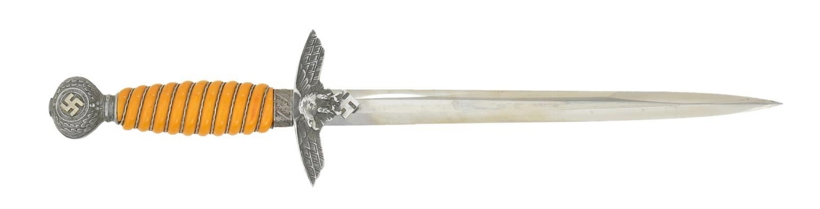 Overall length 16 3/4". Plain blade is marked on the reverse “ORIGINAL (squirrel) EICKHORN SOLINGEN”. Aluminum cross guard & pommel. Aluminum wire wrapped orange composite grip. Plated scabbard with original hangers. CONDITION: blade shows moderate scabbard wear. Mounts show light wear. Grip is undamaged. Scabbard has a dull gray finish. Hangers show light wear. PROVENANCE: From the Lifelong Collection of Glen E. Mattox. (02-18217/BF). $400-600.