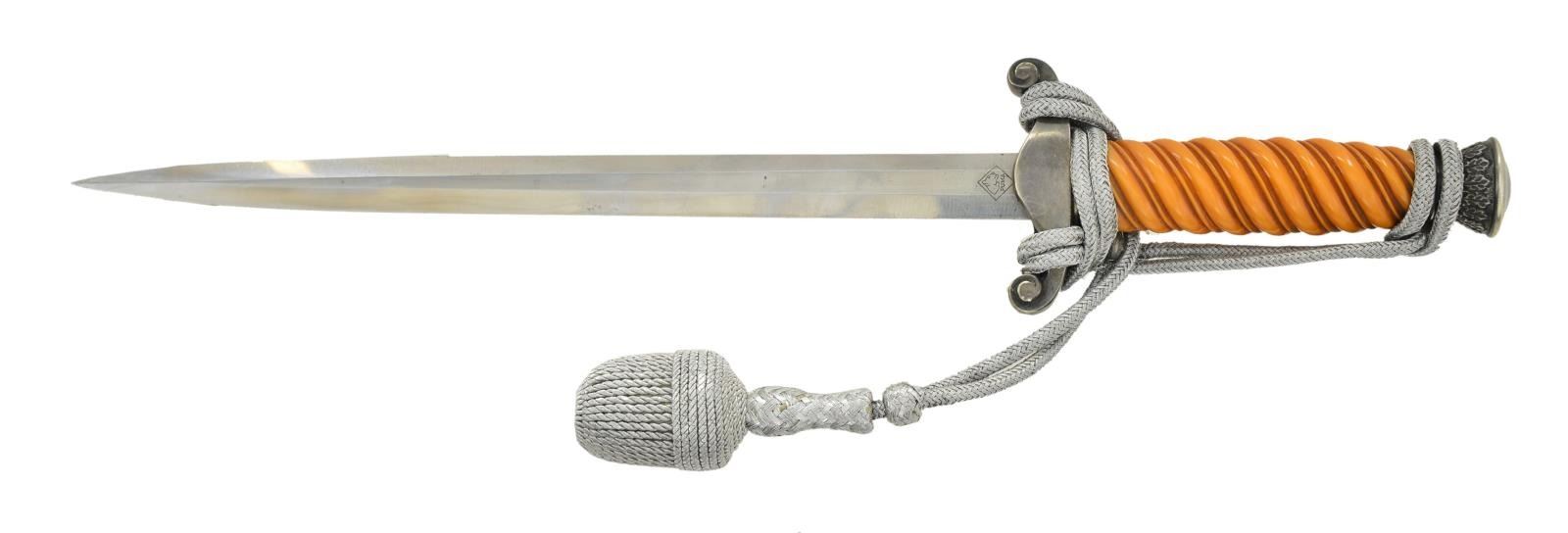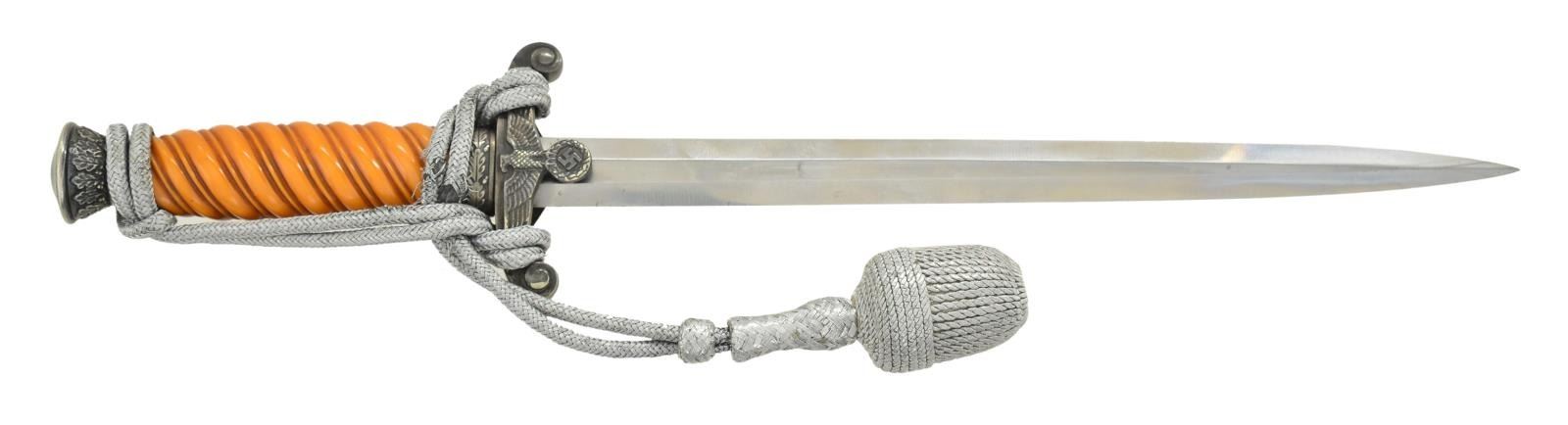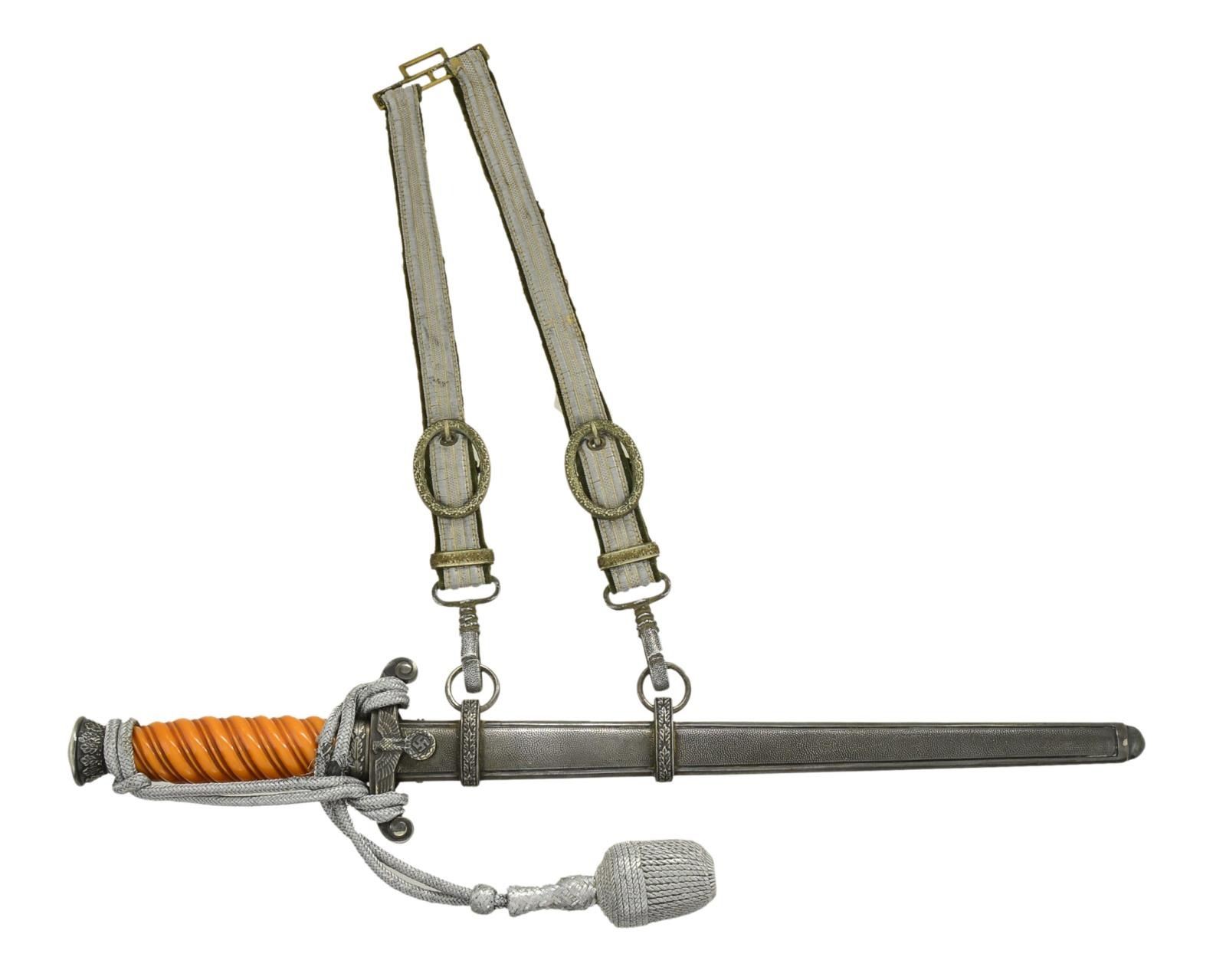 Overall length 15 3/4". Plain blade is marked on the reverse “(puma) PUMA SOLINGEN”. Silvered eagle cross guard with oak leaf decorated pommel & ferrule. Orange composite grip with correctly tied knot. Plated scabbard with correct original hanger attached. CONDITION: blade shows light scabbard wear. Mounts have a pleasing tarnished finish. Grip is undamaged and knot shows moderate wear. Scabbard has an overall tarnished finish. Hanger shows light overall wear. PROVENANCE: From the Lifelong Collection of Glen E. Mattox. (02-18202/BF). $450-650.